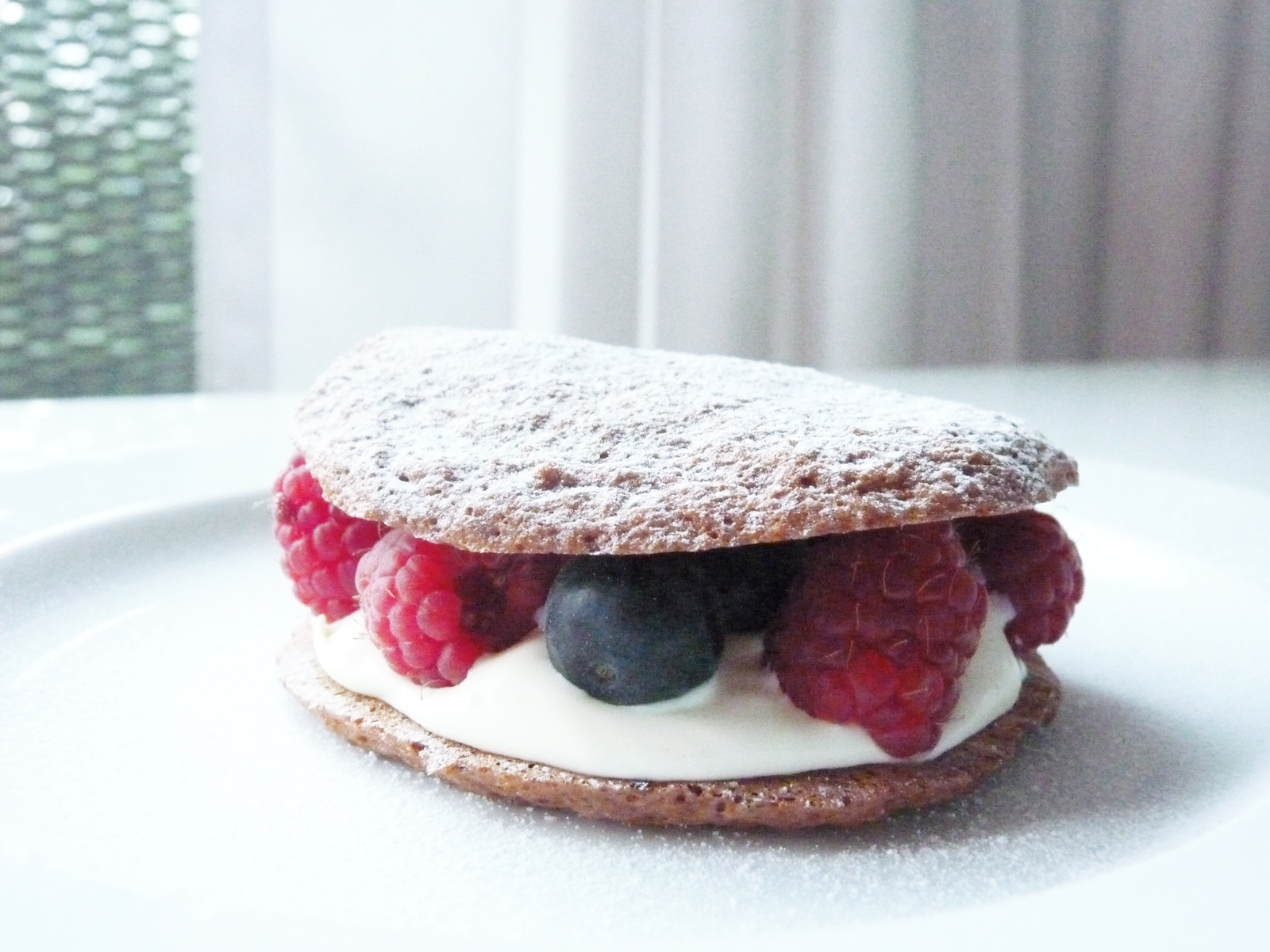 shape little pools of dough on the baking sheet (we used a pipe, though the batter was a little too liquid, we admit, so the pipe wasn't really useful, cough. a spoon would do, we're pretty sure). bake in the oven for 8-10 minutes. let cool entirely before removing. assemble the maccarons: spread a little double crème on the bottom part, add a few berries, cover with the lid part, dust with a bit of confectioner's sugar. voilà. serve and enjoy.