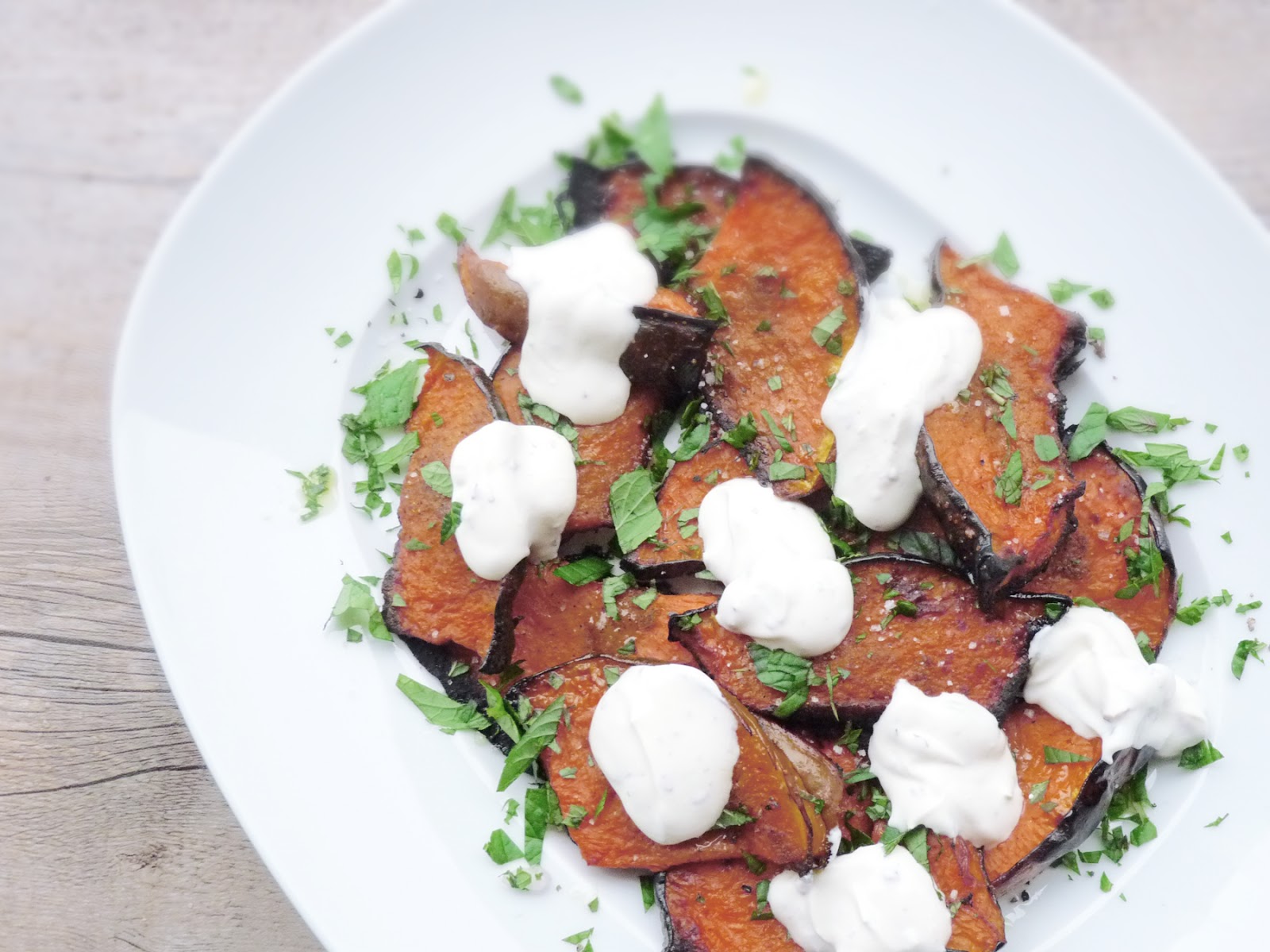 cut the acorn squash in thin slices. brush it with the olive oil, season with fleur de sel and roast it in the oven (preheated to 220 degrees c / 400 degrees f) for 25 to 30 minutes. combine the yogurt with the ginger, lime zest and juice, rose buds, chili flakes and fleur de sel. season with fleur de sel. when the squash is done, let cool slightly, then add dollops of the yogurt and sprinkle with the mint leaves. serve warm or at room temperature.
