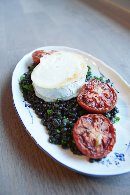 preheat the oven to 220 degrees c / 325 f. place the goat cheese on a baking sheet lined with parchment paper. bake for 10 minutes until melted and golden. in the meantime add the lemon juice, olive oil and herbs to the lentils. season with fleur de sel. combine. arrange the lentils on a plate, carefully place the cheese in the middle and add some slow-roasted tomatoes.