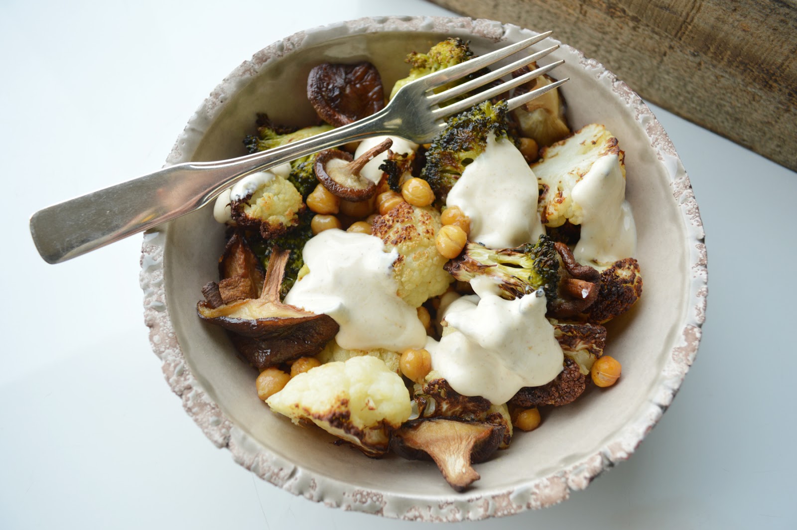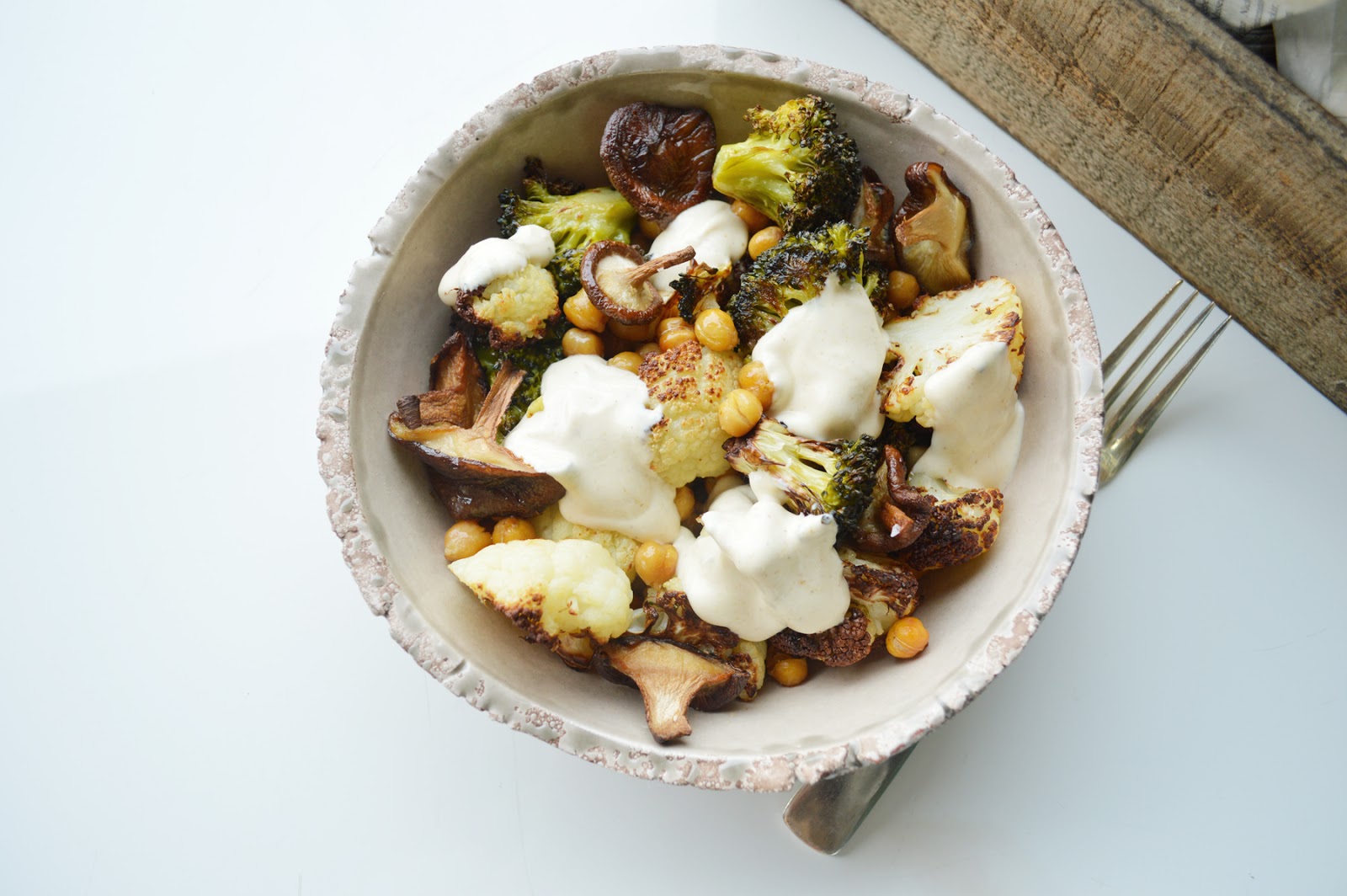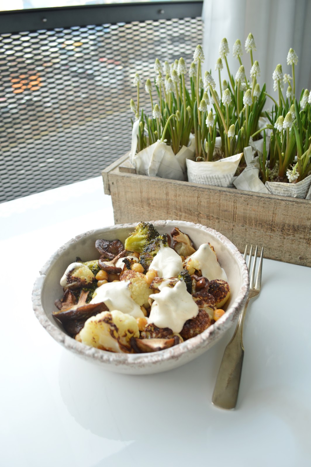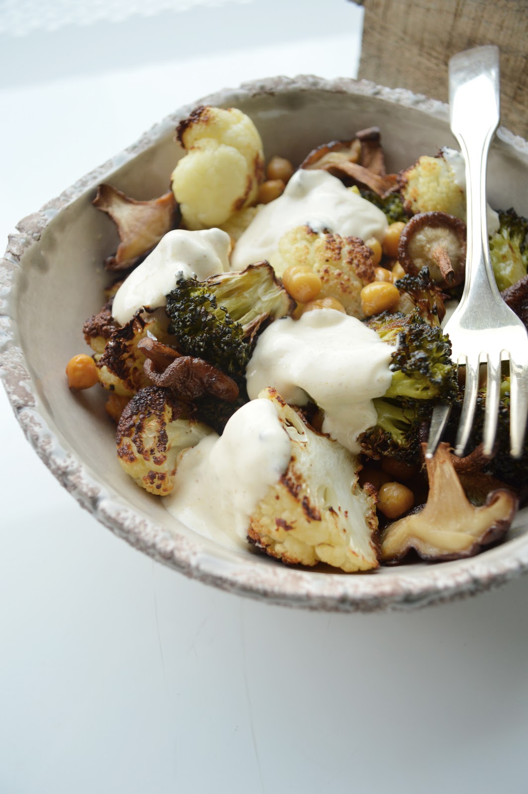 preheat the oven to 220 degrees c / 380 degrees f, and line a baking sheet with parchment paper (yes, all good things start with those two steps). spread the broccoli, cauliflower and chickpeas onto the sheet. drizzle with olive oil and sprinkle with maldon sea salt, quite liberally. roast for 25 minutes. in the meantime, whip up the yogurt sauce with the curry paste, tahini and harissa (i know it's a fun mix, but it's still worth giving a try). i find you don't need a lot of salt for the yogurt, but season according to your taste. let the vegs cool a bit before ladling into a bowl. add a few dollops of yogurt. serve warm (i.e., in this case, eat alone, in front of telly, and think you're sooo lucky to have this bowl-ful of goodness... in fact, you might almost get a bit sentimental and religious... or you could call it esoteric, ahem. but let's not push it too far... a good bowlful of good food is enough to make me happy, i don't need buddha - just now. thank you anyway...).