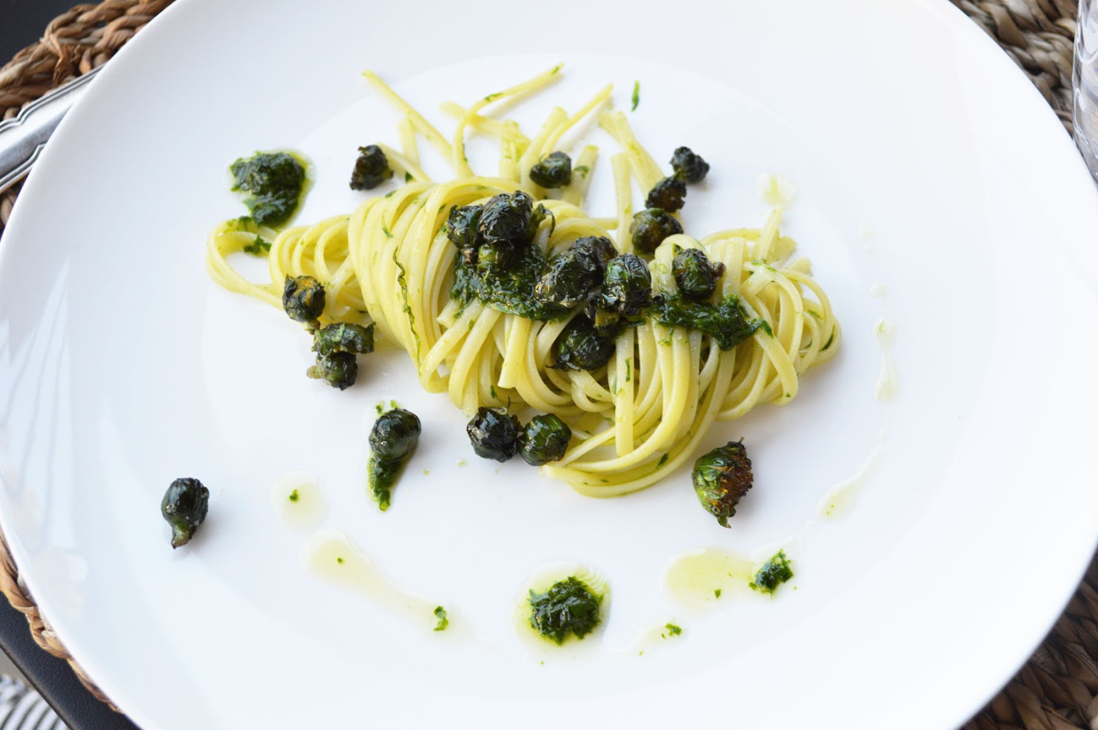 linguini with baerlauch (wild garlic / ramps) paste & roasted dandelion buds