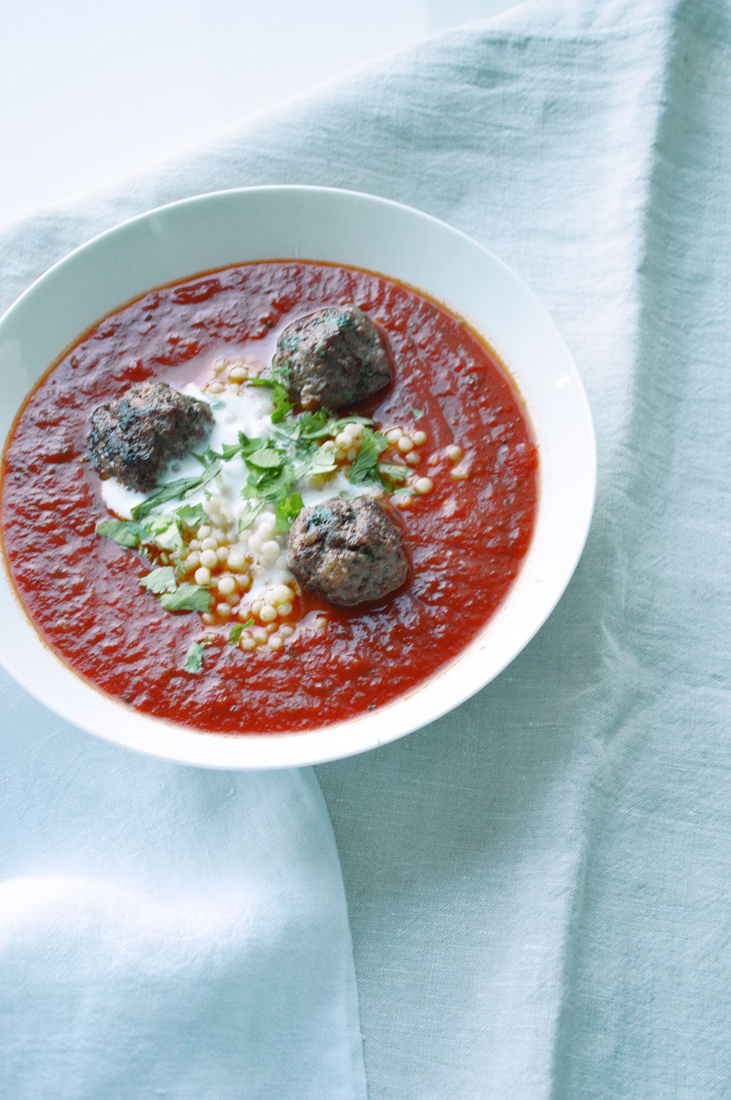 ps: this is really one of my favorite dishes now... first, it's summery, surprising thanks to the tangy note and a real, fulfilling meal (which often soup is not, i think). then, it's also gluten-free (major plus for some guests). and you know, i think children like it, just as much, for the meatballs, of course, but also for the couscous that resembles pasta, really (this started to be my main decision criterion when cooking for my brother's family: does my nephew like it?). and last but not least, it's as much male guests suitable as it is for females (i'm not implying there were ever any male guests at this house, ahem... i'm just being all thoughtful, and, you know, foresightful. after all, you never know...).