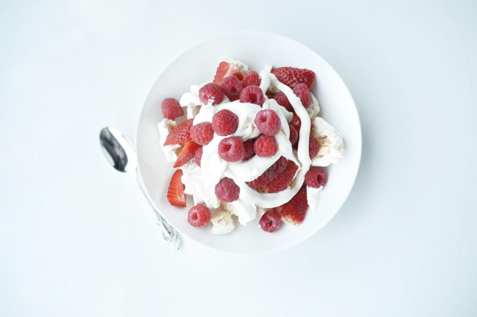 do you know what eton mess is? it's mainly a mess, but then, all good things have chaos in them. just take some meringues, crush them roughly, cover (get dirty) with whipped or double cream (i prefer double cream... i'm naughty) and berries and gobble it up before it's soaked too much. create a mess, love it.