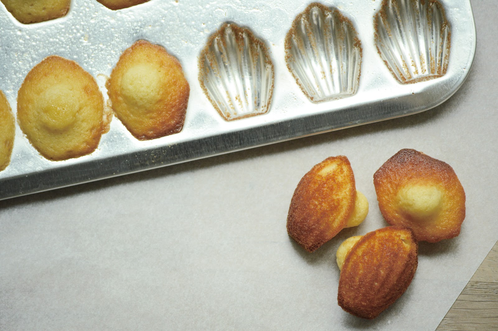 preheat the oven to 180 c / 350 f. brush the madeleine pans with melted butter, thoroughly, then chill the molds in the fridge to harden the butter. use a spoon to transfer the batter into the molds (i used about 1 tsp. of batter for each mold). tap the bottom of the pan against the work surface to smooth the top of the batter. bake for about 6 (for the mini madeleines) to 8 minutes (for the large madeleines), until the tops are lightly browned and a skewer inserted in the center comes out clean. note: the bottoms of the madeleines will brown more quickly than the tops, so keep the tops on the lighter side. immediately unmold the madeleines and cool on a cooling rack. the madeleines are best the day they are baked, but they can be stored in a covered container for up to 1 day.