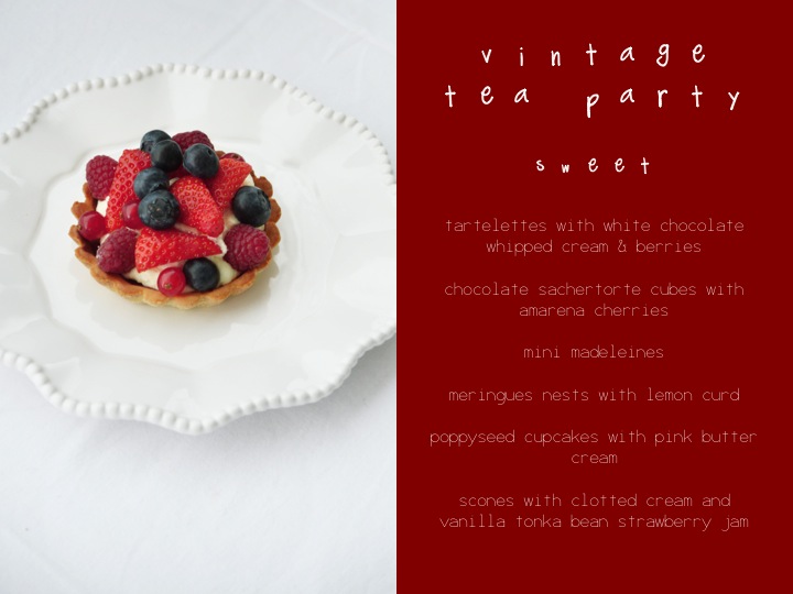 now some impressions from the vintage tea party supper club from last week. see the menu - sweet and savoury - above. of course, there was a selection of finest teas, too; earl greys and english breakfast and flavorsome green teas and rooiboshes... everything the english heart desires. it was a blast!