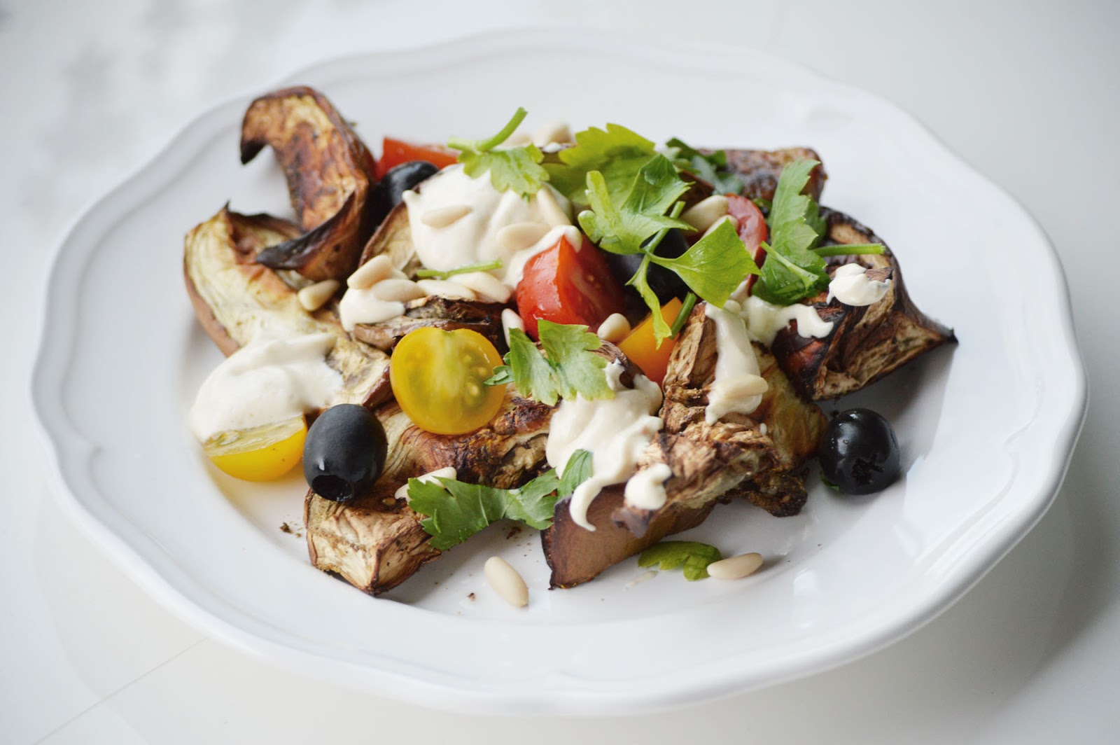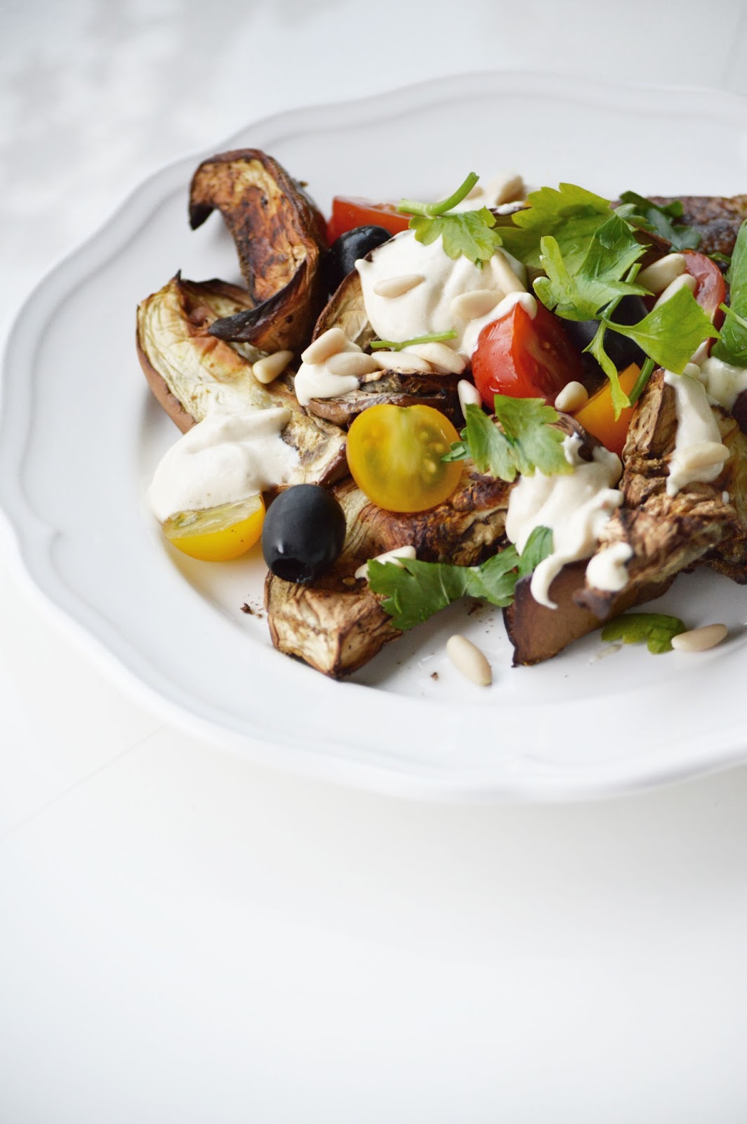cut the aurbergines in chunks, coat it with the olive oil and the spices: curry, cumin, paprika, za'atar and salt. roast at 220 degrees f / 380 c for about 30 minutes or until the chunks are slightly charred. in the meantime, half the tomatoes, chop the parsley, toast the pain nuts in a dry pan for about a minute, drain the olives and chop if necessary and make the signature tahini dressing. for that, combine the yoghurt, lemon juice, tahini and garlic (minced) and season with a little salt (not too much). remove the aubergines from the oven and let cool a bit, then assemble: place the chunks on a plate, add a handful of tomatoes and add a dollop of the dressing on top. sprinkle with pine nuts and parsley, and sesame, if you like. serve and eat, all of it.