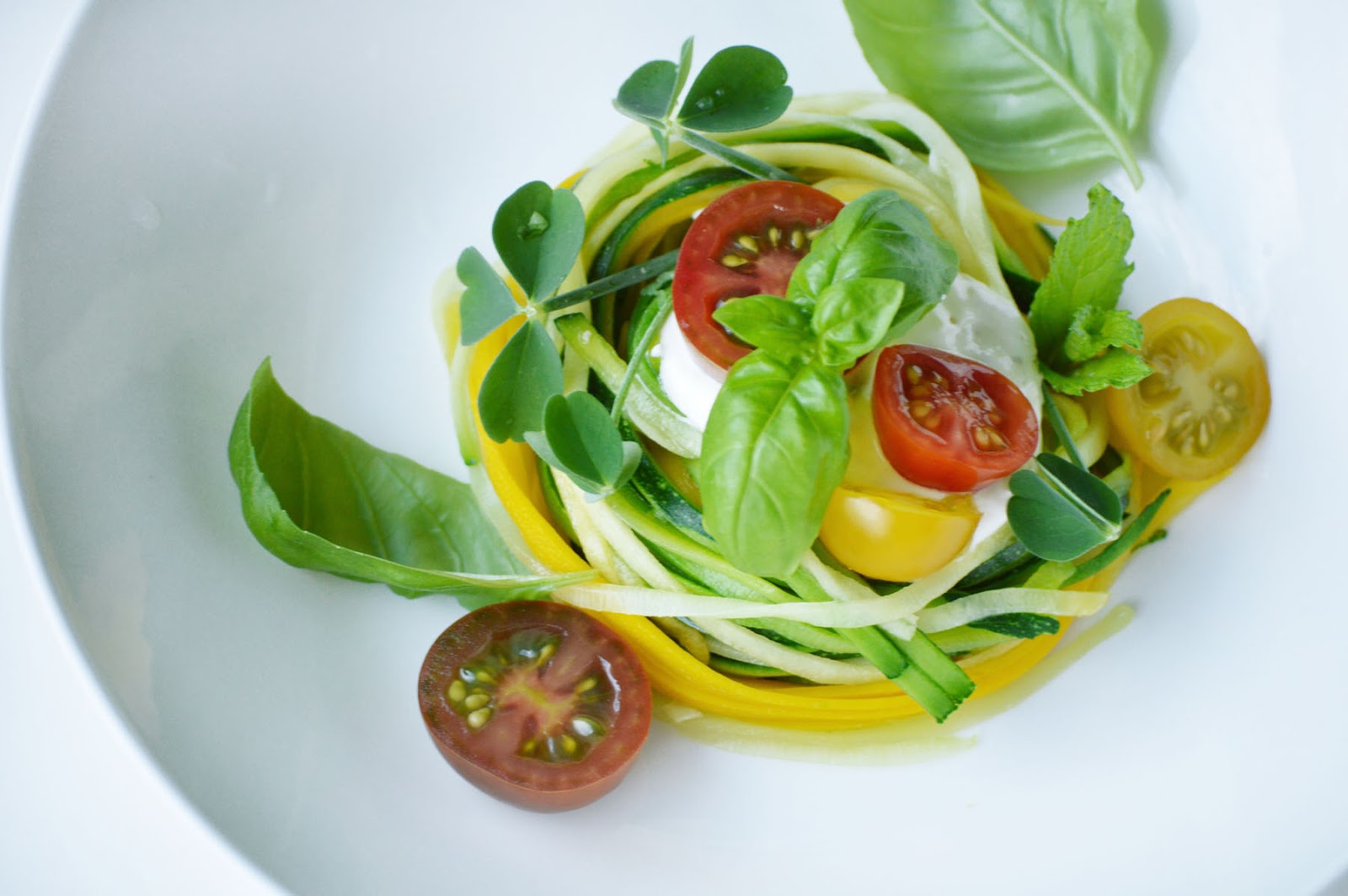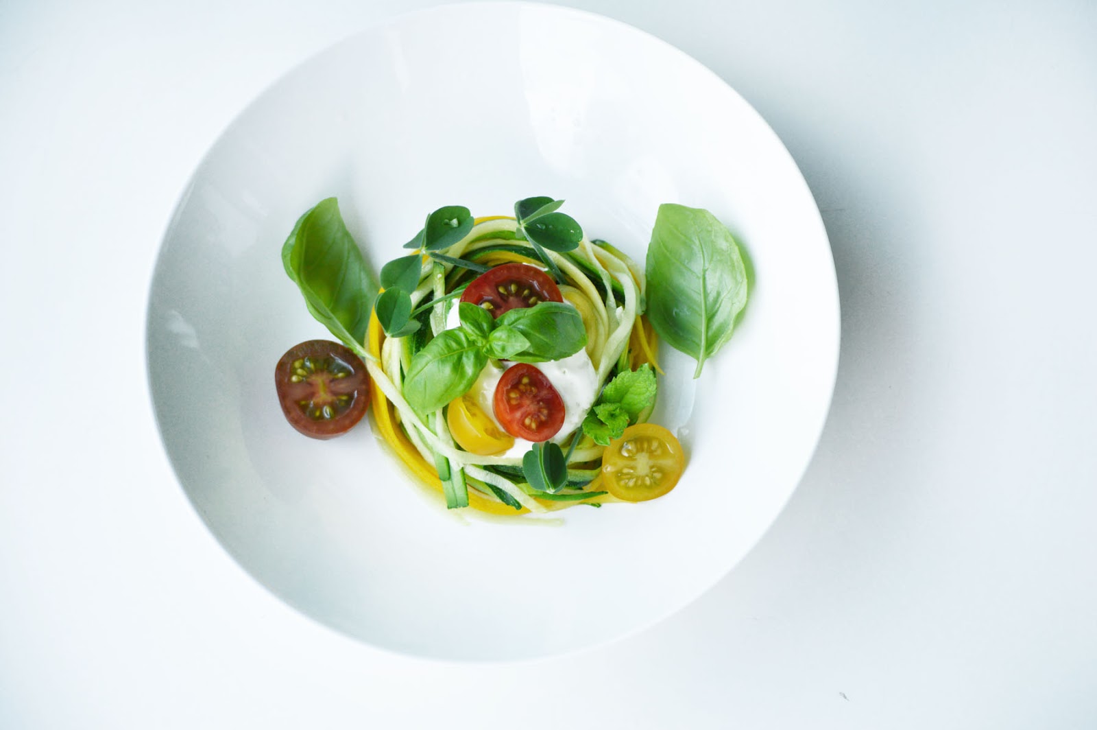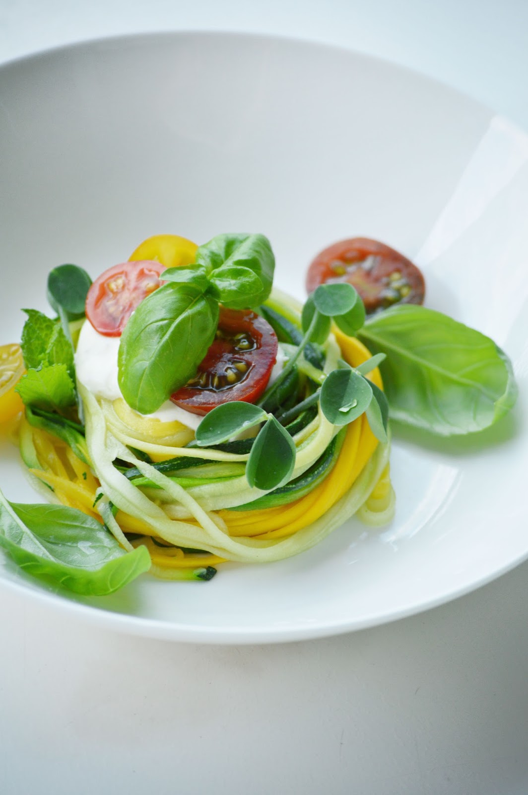wash the zucchini, because you're going to use the peel, too. now slide a julienne peeler (yay, i've finally gotten myself one!) over the zucchini from one end to the other. the julienne peeler makes perfect, long, spaghetti-like stripes in one, easy swipe. of course, you can always cut it like that on your own, but it's exhausting for this amount. anyway, so proceed with the zucchini, until the first seeds appear (the seeds break the stripes so i leave them out). now rotate the zucchini 90 degrees and continue to peel it on this side. continue until all of the zucchini (except for the bit with the seeds) is peeled / julienned. heat a large saucepan with salted water, and quickly blanch the zuchini stripes in it (we're talking maybe 2 minutes here). drain them and cool them in the ice cold water. in the meantime, quickly heat the crème fraîche in a small saucepan, add the lemon juice and season with fleur de sel. arrange the zucchini stripes on a plate neatly (a fork works well to turn the 'pasta' into nice little nests), add a generous dollop of crème fraîche and decorate with tomato halves, basil leaves and mint leaves (note: i also added some leftover edible sour clover leaves, because they look so pretty, but i'm fully aware that most people don't happen to have clover on hand, so just skip it).