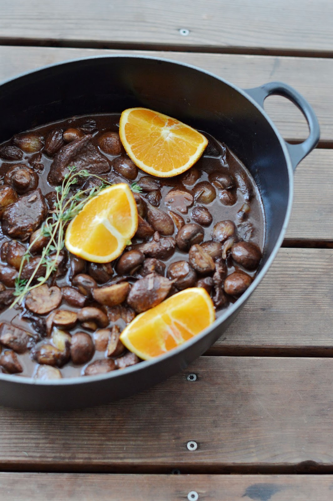 and another note: you know how it looks like the boeuf bourguignon is something that's just thrown together into one pot? well, it's not, actually. the secret is to prepare everything separately, i.e. the beef meat, the onions and the mushrooms. yeah, it sucks, but it's going to end up being so much better. let's do this!