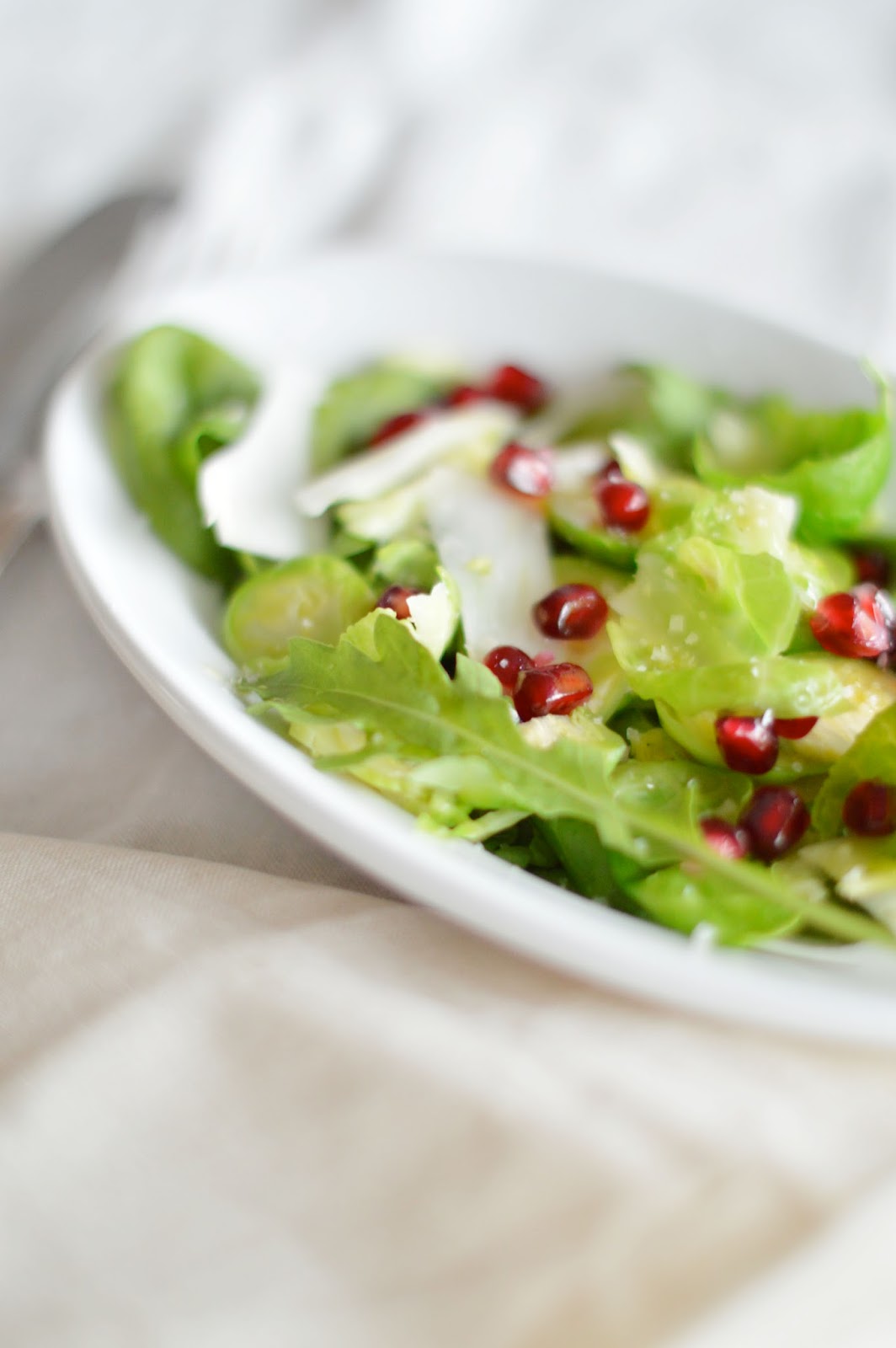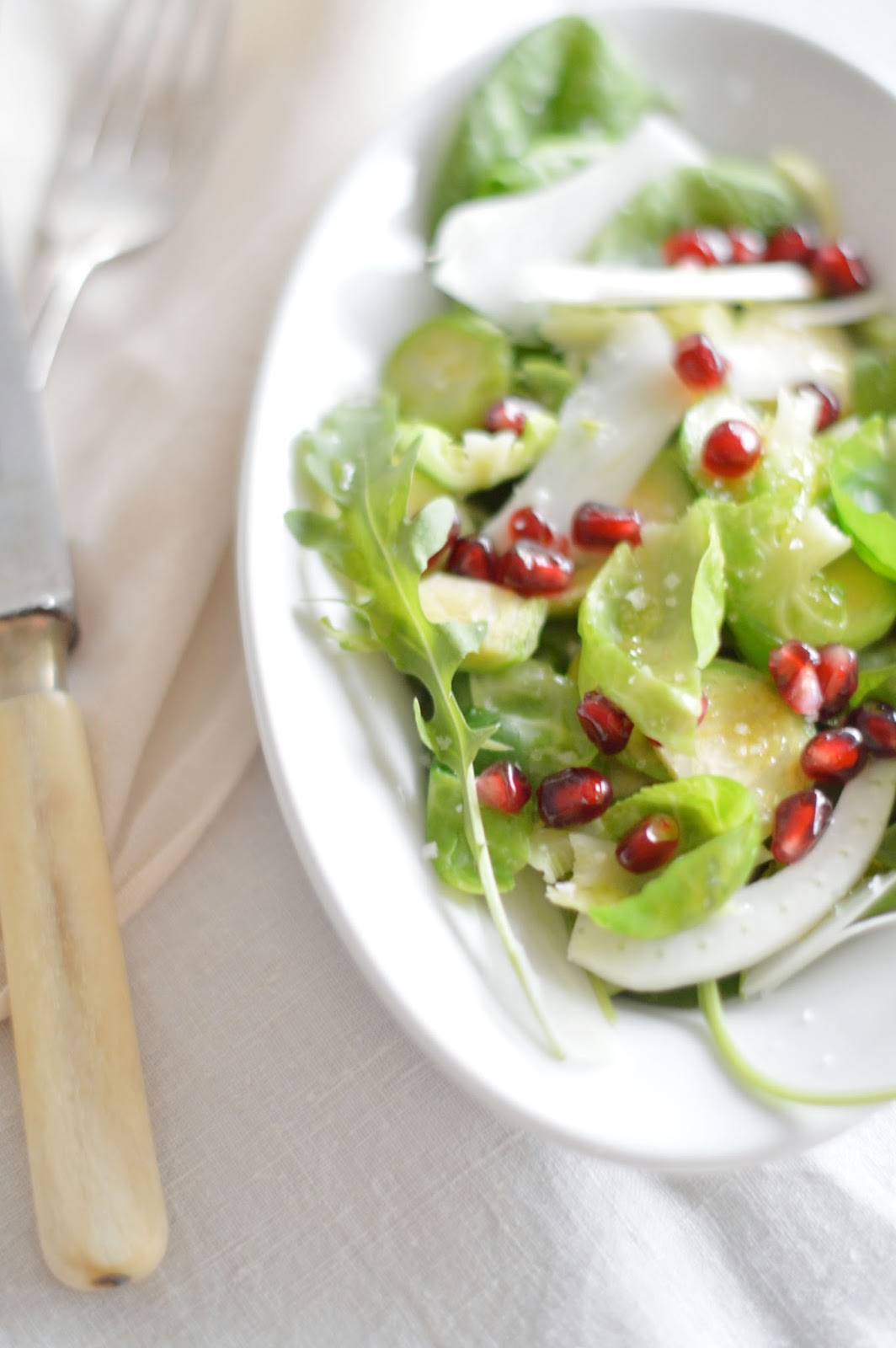 clean the brussels sprouts and remove the outer leaves. blanch in boiling water for 2 minutes, then drain and cool in ice cold water. peel off the leaves individually (as much as you can) - when it doesn't work well give in and finely slice. wash the spinach and rocket and pat dry. finely slice the fennel bulb. make a dressing with the lemon juice, olive oil, honey and salt. arrange greens on a plate (starting with the leafy ones), garnish with pomegranate aerils and sprinkle over the dressing.
