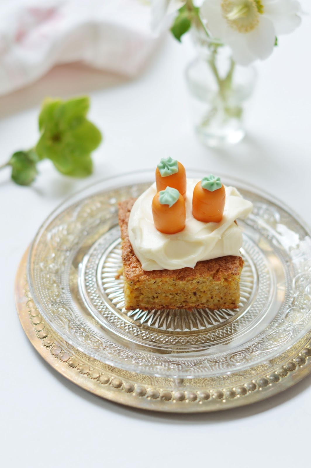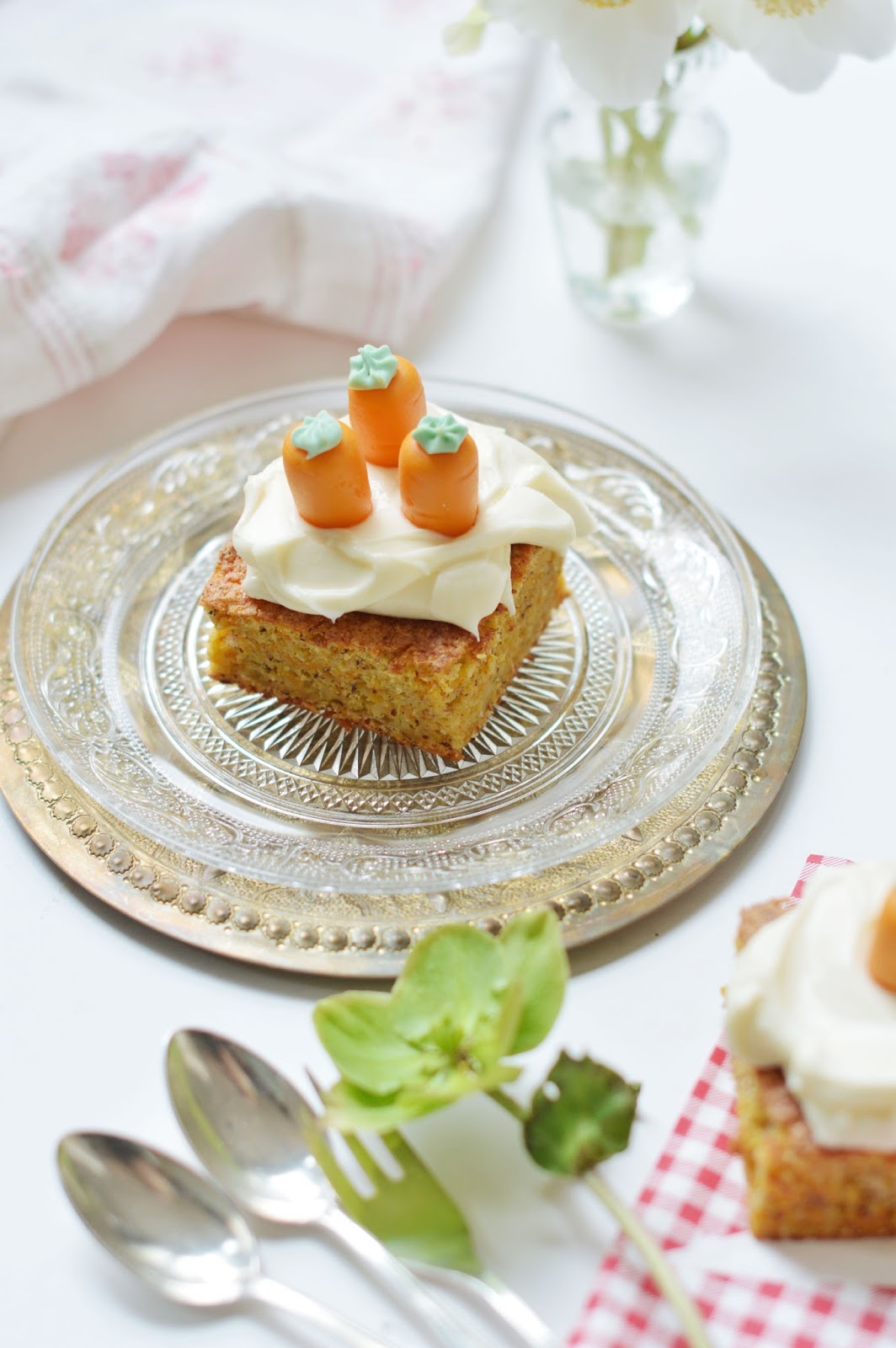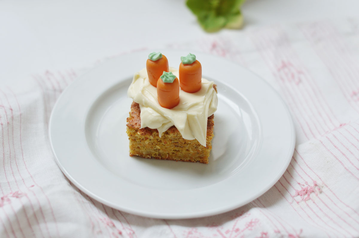 whip the cream cheese with a hand mixer, add the sugar - bit by bit - we don't want it too sweet - and mix some more until smooth. cut the cake into squares, smear a dollop of cream cheese on top, decorate with some carrots - tips down - and serve. tell your stories and wait for the applause. eat your cake and feel better.