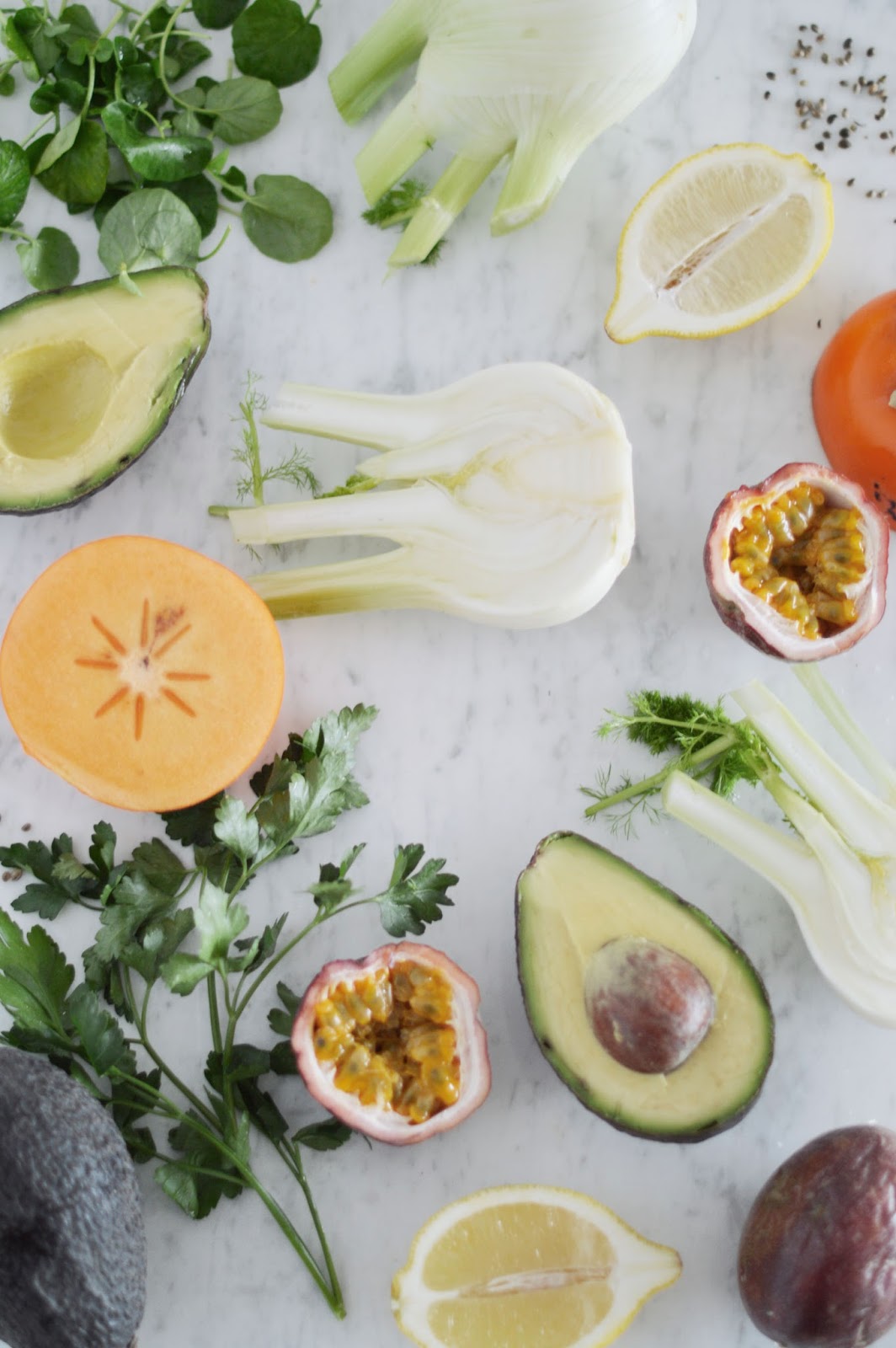 start by preparing the parsley oil: coarsely chop the parsley, put it in a food blender and add the olive oil and pulse until smooth (use more olive oil if needed). put aside. wash the fennels and finely slice vertically. immediately marinate with the juice of one lemon, in order to prevent them from turning brown. put aside. half the avocados, remove each half with a large spoon, then slice finely. proceed by sprinkling over the juice of the second lemon, for the same reason. the rest is simple: assemble. distribute the fennel slices on the plate, arrange the avocado slices on top. drizzle the passion fruit pulp over the salad, scatter some watercress leaves and hemp seeds on top. add a drizzle of the parsley oil and the avocado oil. finish by seasoning with maldon sea salt. serve.