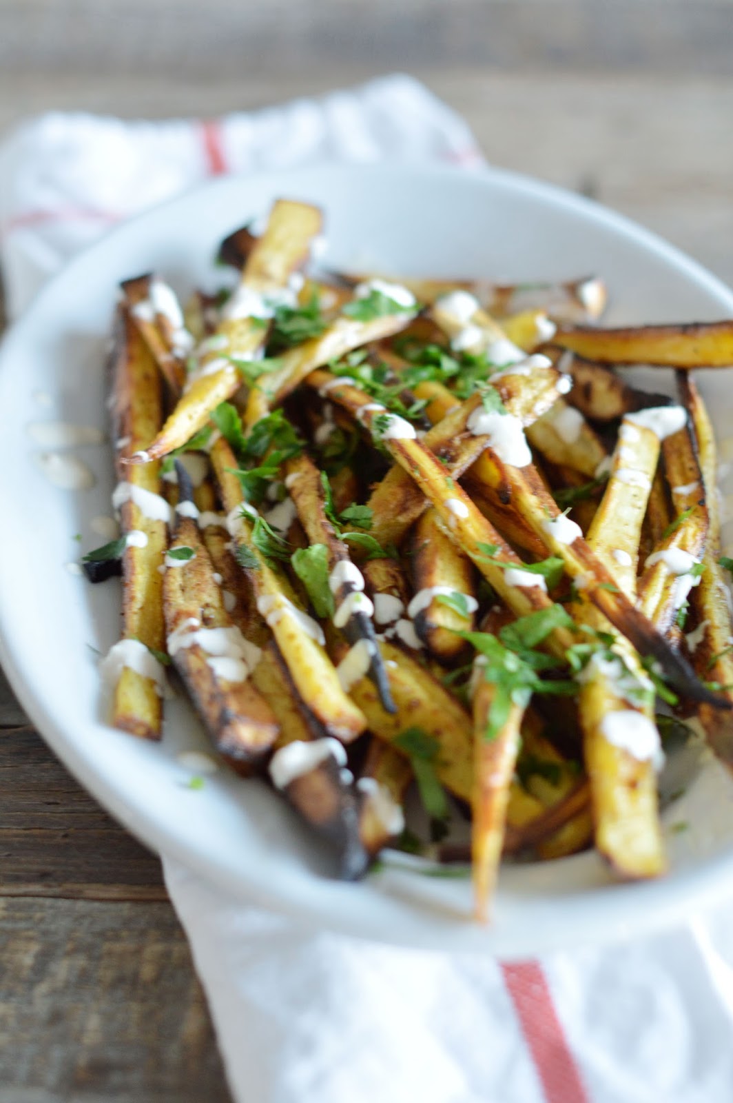 slice the parsnips lengthwise and cut them into equally (or as equally as possible) sized (about 1cm wide) batons / fries. coat with the olive oil and the cumin, season with salt and roast on a parchment paper in the oven (220c / 420 f) for about 25 to 30 minutes, until crispy. turn once, halfway through. remove and arrange on a plate. in the meantime prepare a dressing with the tahini, warm water and lemon juice. add the garlic and season with maldon sea salt. drizzle over the fries, then scatter the chopped parsley on top.