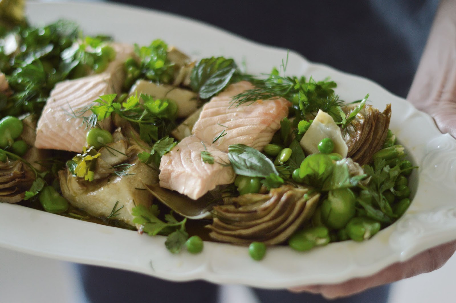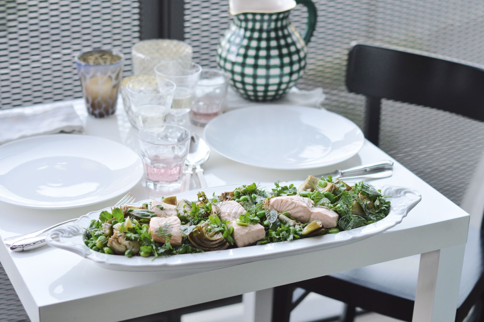 so here's my home version of a dinner al fresco (on my tiny balcony, at the even tinier dining table): poached salmon on fresh, confit artichokes with fava beans and peas and lots and lots of herbs. don't forget to light a couple of candles for extra glam factor.