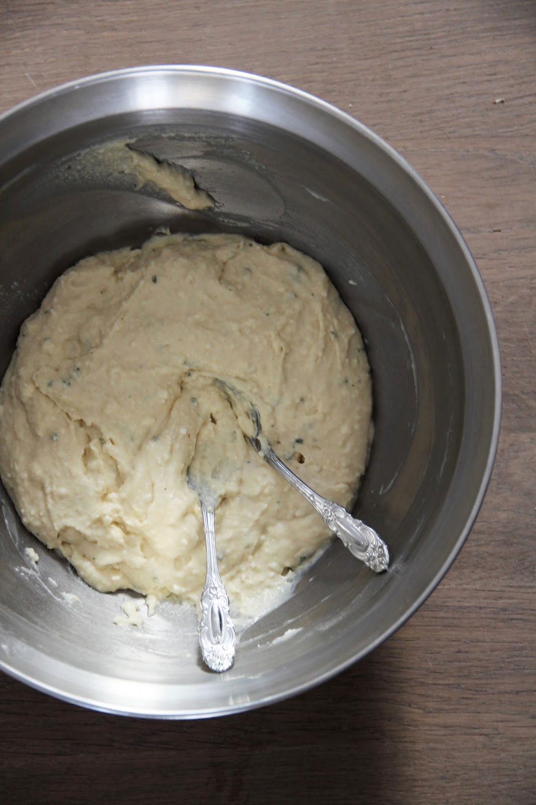 combine ricotta and philadelphia and eggs in a bowl. add mint and orange zest. in another bowl, combine the dry ingredients: flour, baking powder, sugar, a pinch of salt. fold into the egg mix until a dough forms. set aside for about 10 minutes.