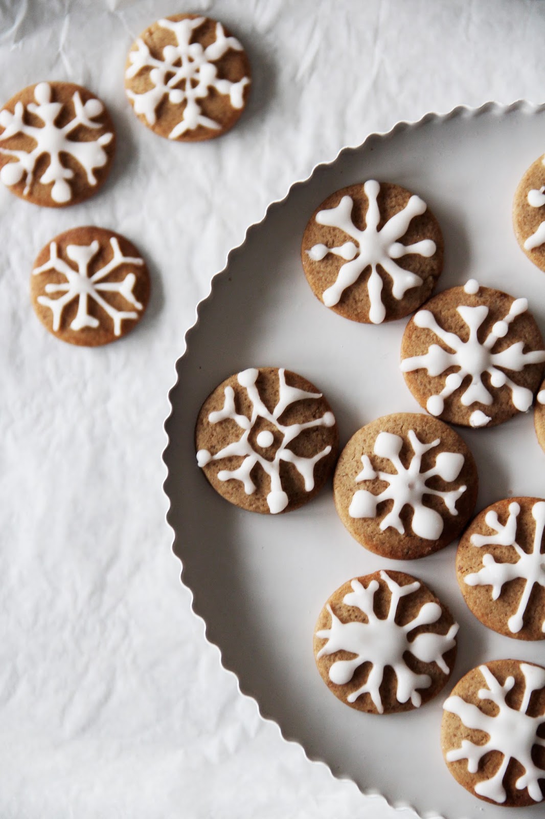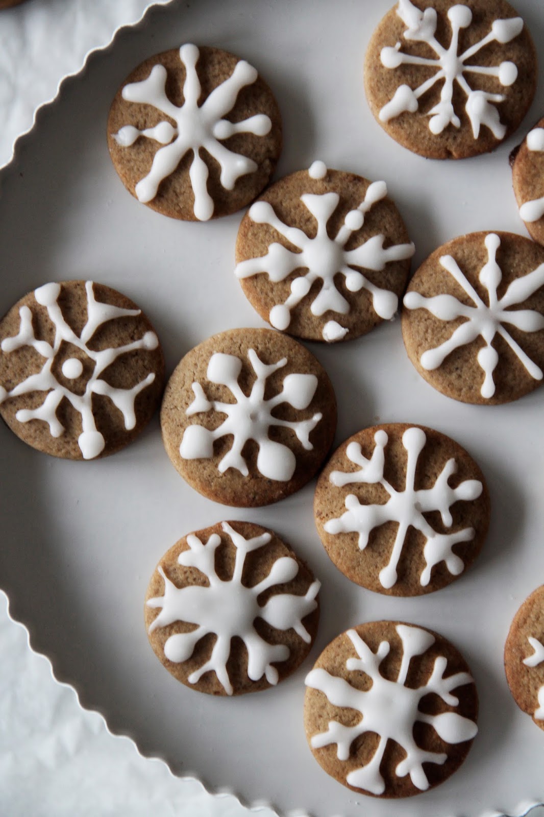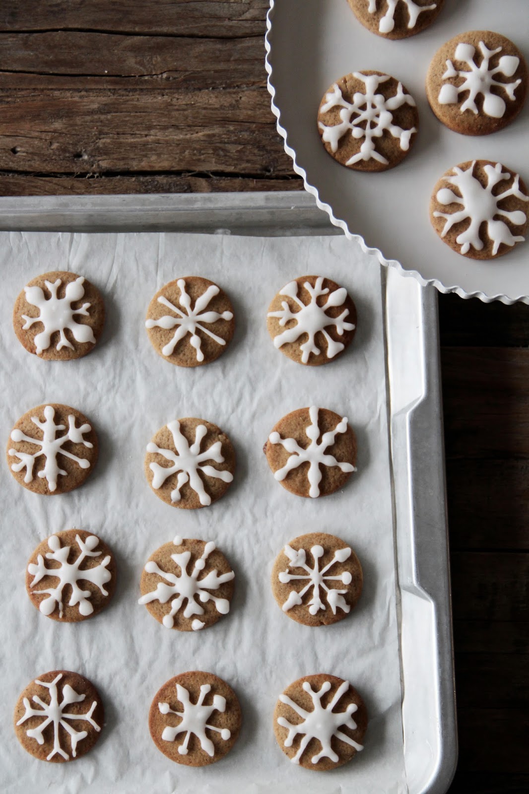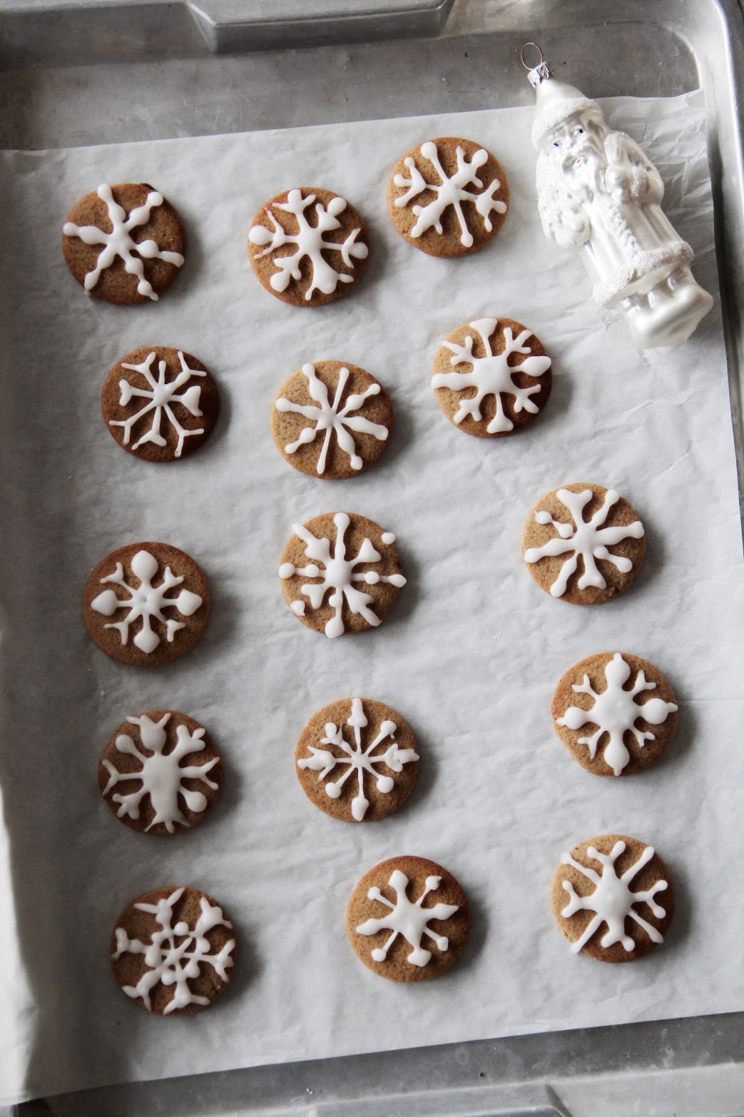 i wanted to capture the true longing for the first snow with these snowflake or ice crystal pepper cookies. i made some typical gingerbread men shapes, too, because we used them for place cards on a family gathering. and because the snowflakes were a bit of a piece of work, really. but the output is fairly decent.