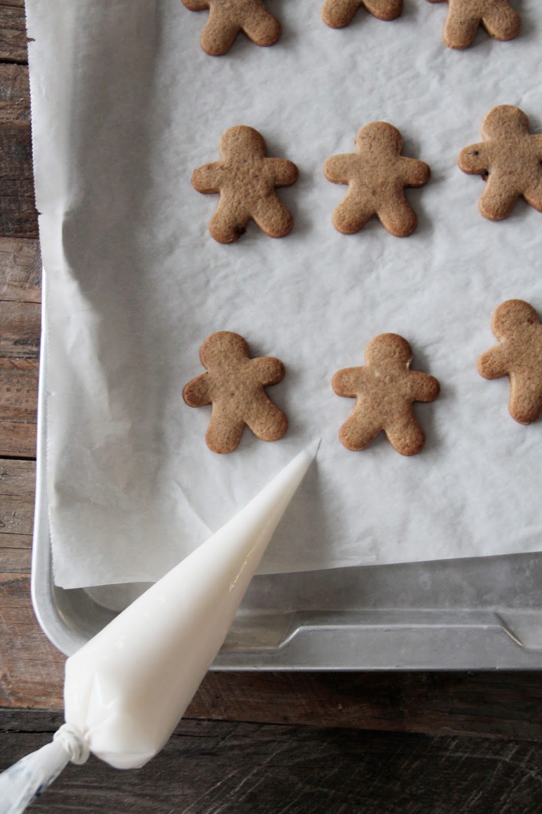 for the glaze, mix together confectioners' sugar with as much water as needed for your desired consistency (mine was rather thick, not runny). fill into a small piping bag with a tiny nozzle or simply into a plastic zip lock bag, where you cut off the tip to create a pipe. decorate the cookies with ice crystal designs or your gingerbread men with buttons or whatever your heart desires. let set and dry. then store in an airtight container.