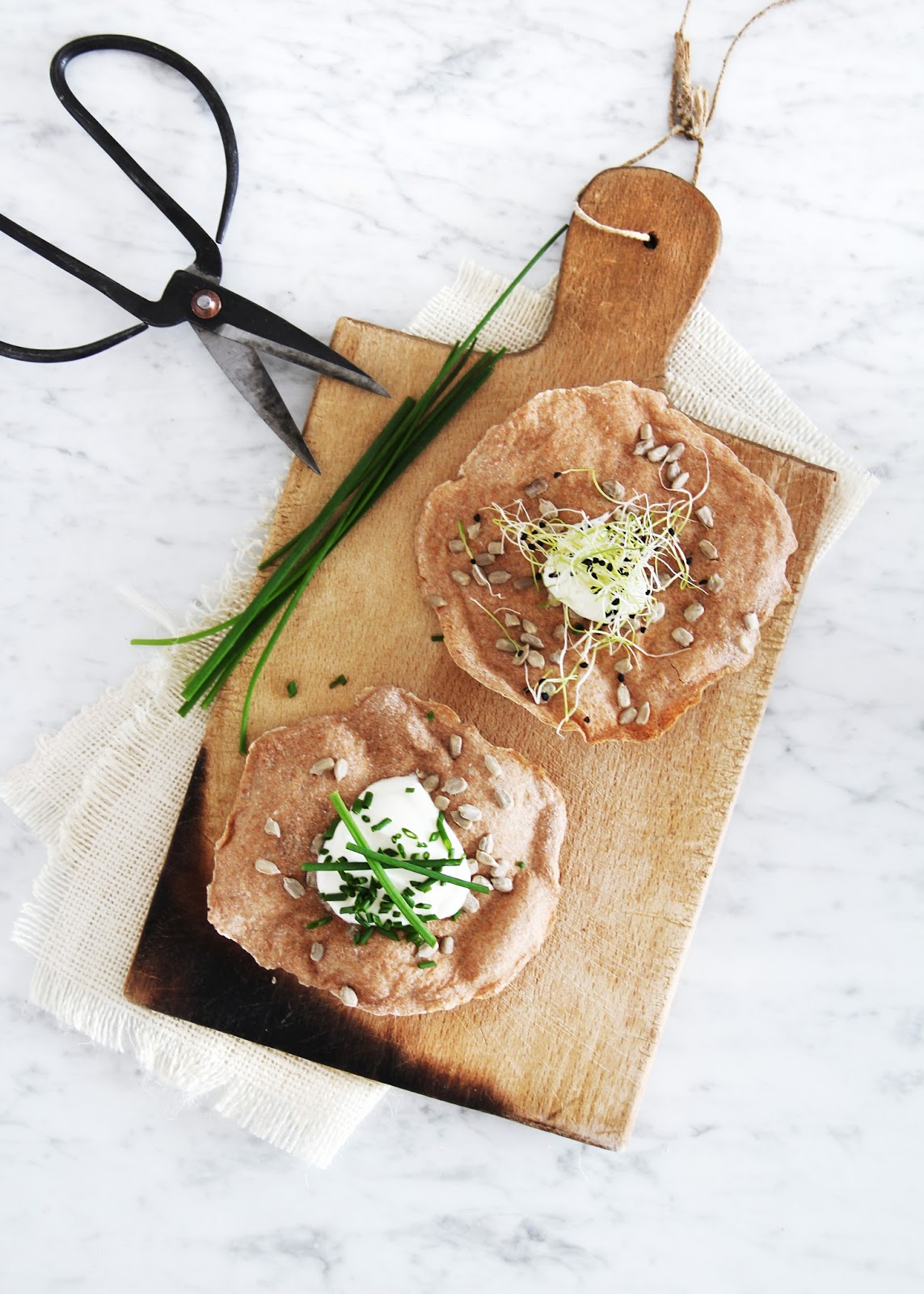 preheat the oven to 220 c / 430 f and line two baking sheets with parchment paper. combine flour, salt and water well and let rest for 10 minutes. with a wet tablespoon, ladle 4 dollops of the dough onto each baking sheet and flatten them into circles. sprinkle with the sunflower seeds and bake for 20 minutes. let cool on a rack.