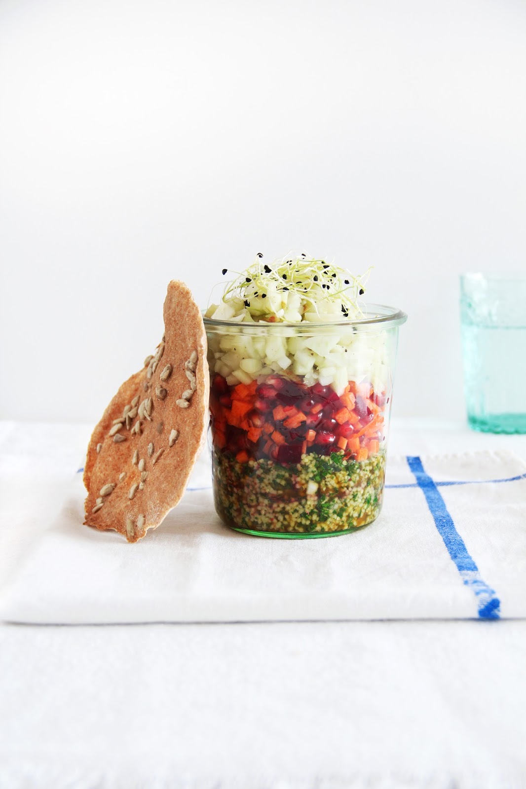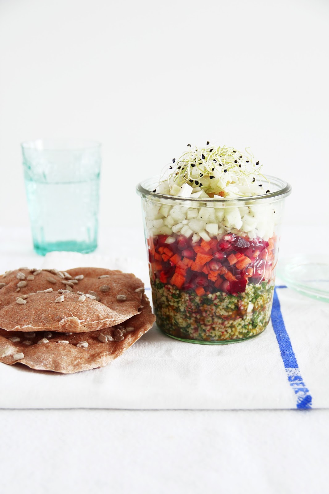 combine the cooked and cooled down couscous with the herbs, scallions, lemon juice and salt into the glass jars. for the second layer, mix pomegranate, beet and carrot and layer, as well. finish off with the apple and fennel cubes, that you sprinkle with some of the lemon juice and season with black pepper. decorate with some sprouts. make a dressing with salt, pepper and olive oil and the remaining lemon juice and serve separately.