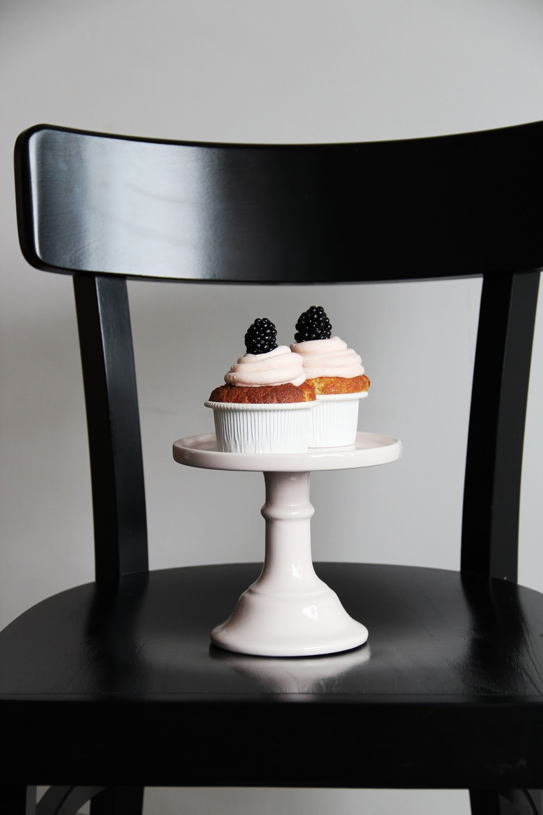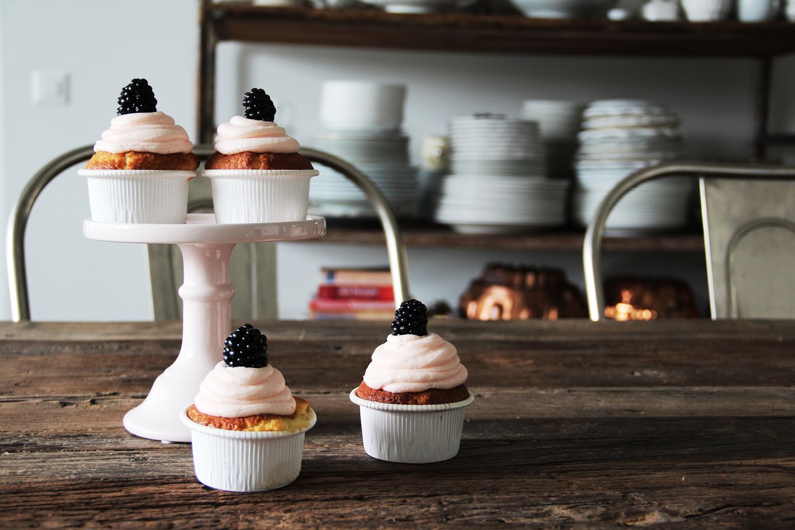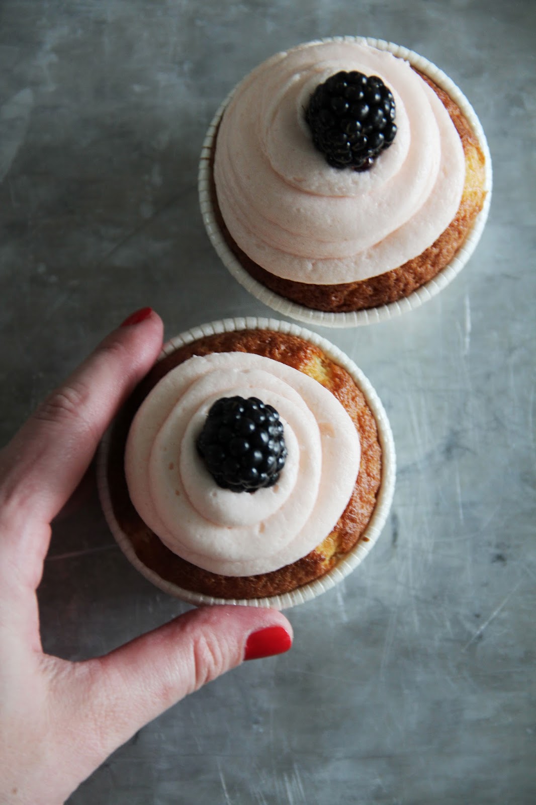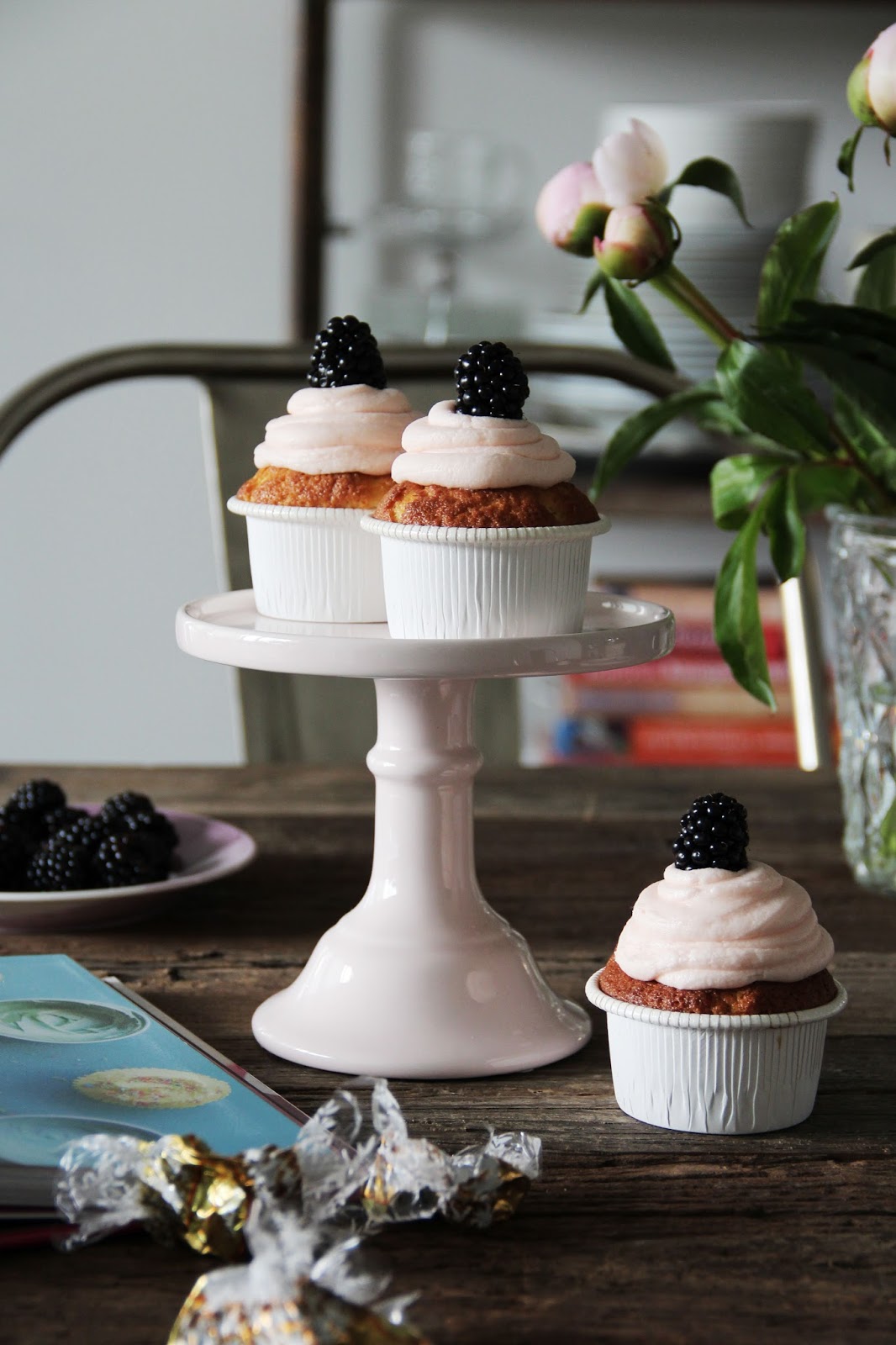 in the meantime, prepare the frosting. combine the confectioners' sugar and butter in a bowl with a stand mixer. add the vanilla and milk spoon by spoon and mix for about 5 minutes until the frosting is fluffy and light and creamy. add a drop or two of pink food coloring for a blush pink effect. fill the frosting into a pipe with a round nozzle and decorate cupcakes. place a blackberry on top of each.