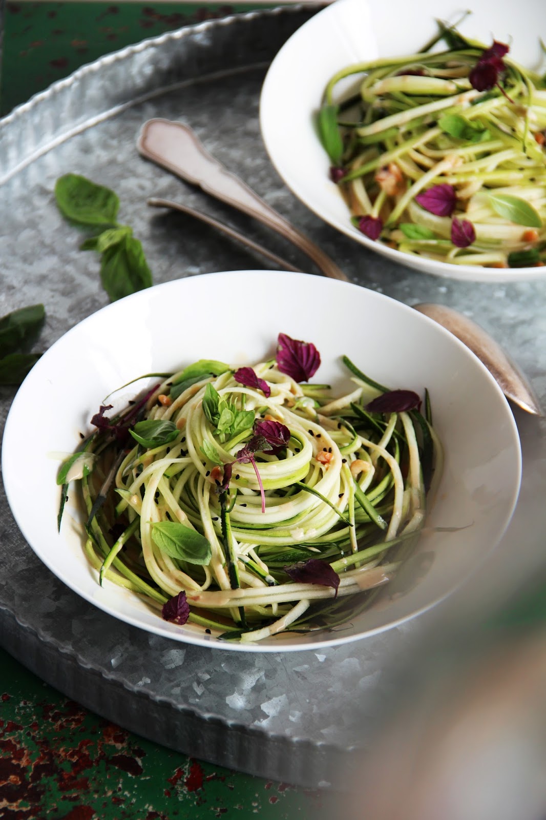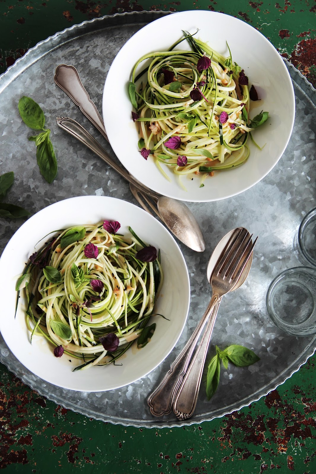 spiralize the zucchini either with a spiralizer or with a julienne peeler, to achieve thin noodles. blanch for 1 minute if you want and cool them, or else leave them raw (as i did). for the sauce combine peanut butter, coconut milk, lime juice and chili paste, and season with salt. arrange the zoodles on plates and drizzle with the coconut sauce. garnish with mint, shiso and chili flakes.