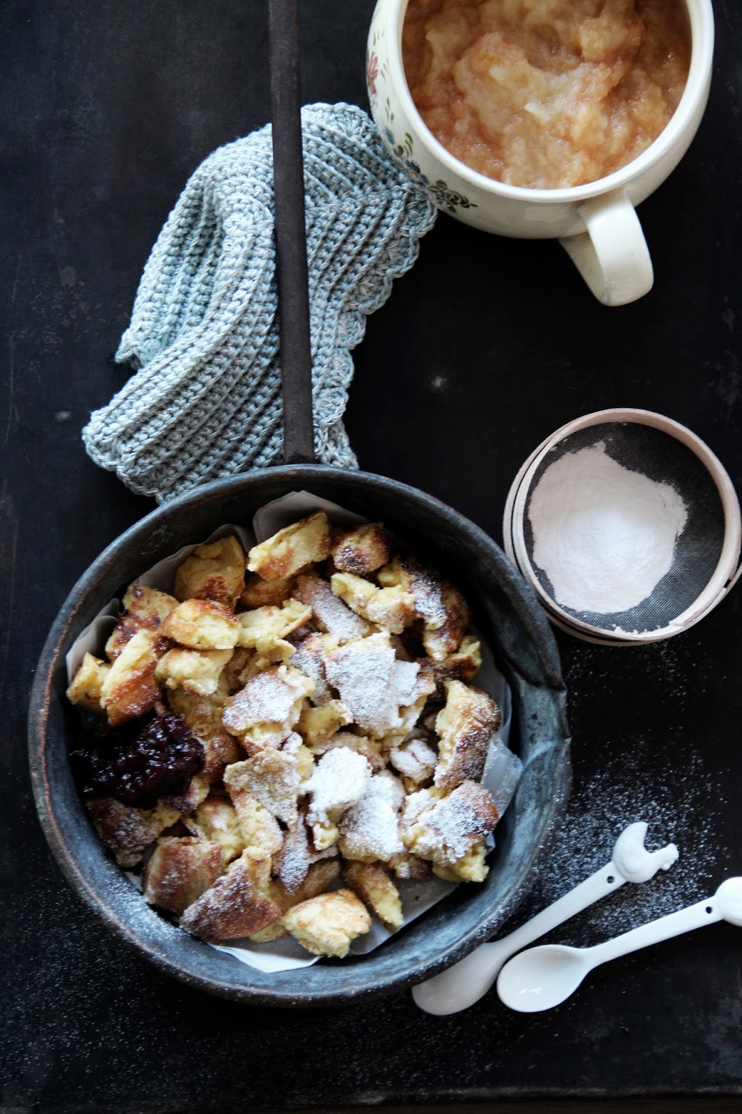 combine the milk, cream, egg yolks, salt, lemon zest and sugar. sieve in the flour. whip the egg whites until stiff peaks form. fold into the batter. let sit for about 30 minutes, cover with foil, in the fridge. heat a large frying pan, let the butter melt in it. then pour a large soup-ladle full of the batter into the pan. it should be about 1cm thick; a bit like a thick pancake. let sit for a minute or two, until the top looks bubbly and the sides begin to come off from the side of the pan. flip over and fry for a few seconds. now, while the center of the pancake is still smooth and liquid-ey but not too much, begin to tear apart bite-sized chunks with a spatula or a ladle. keep on frying until all parts are equally done / golden-brown. shortly before removing from pan, add a bit of the confectioners’ sugar to the pan and stir to combine. this is a super trick, as it will render the kaiserschmarrn nicely caramelized and creamy textured from the outside, and prevents it from turning too dry immediately. ladle onto a plate, and serve, dusted with confectioners’ sugar and a fruity compote - in this case apple sauce - on the side. previous versions schmarrn versions included this peach and apricot compote, for the record.