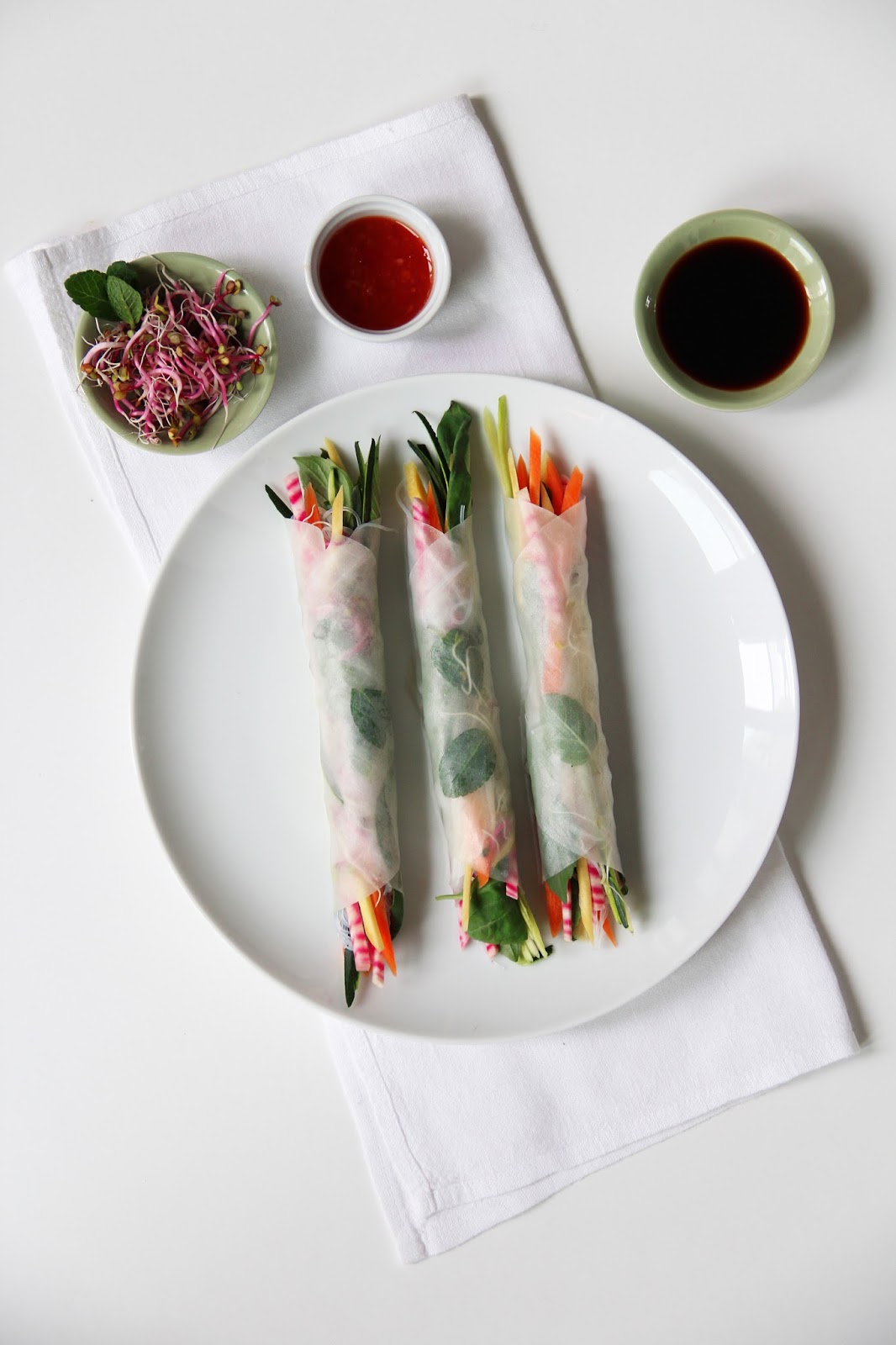 take one rice paper at a time and soak it in a bowl of water briefly. lay on a humid kitchen towel and start to fill: the herbs first, then the veggies, some glass noodles and sprouts. either fold in the sides and then roll up or leave the sides “open” so that the herbs and crudité peak out. arrange on plates and serve immediately, with the pimped soy dressing and/or simply with some sweet chili sauce.