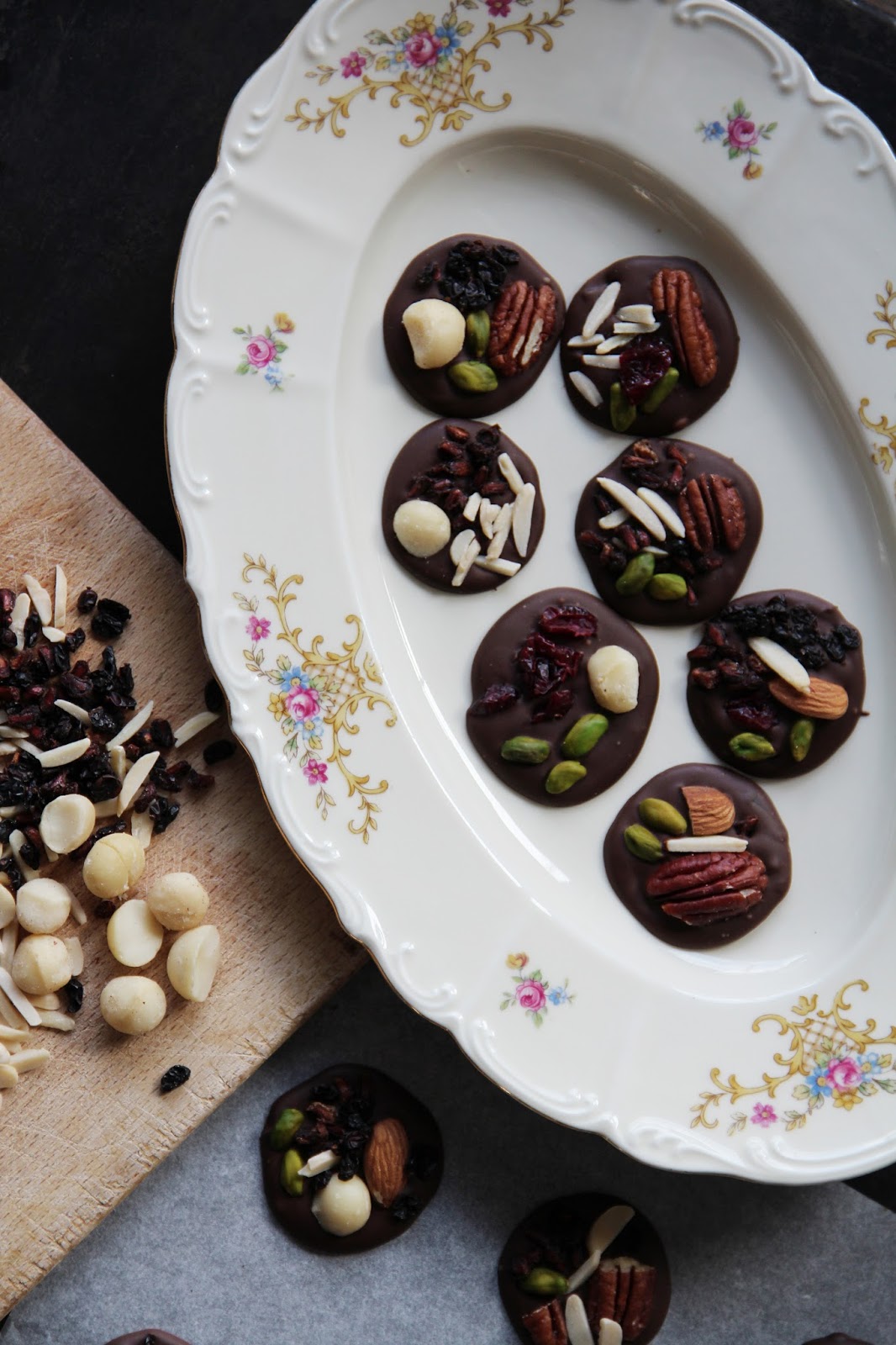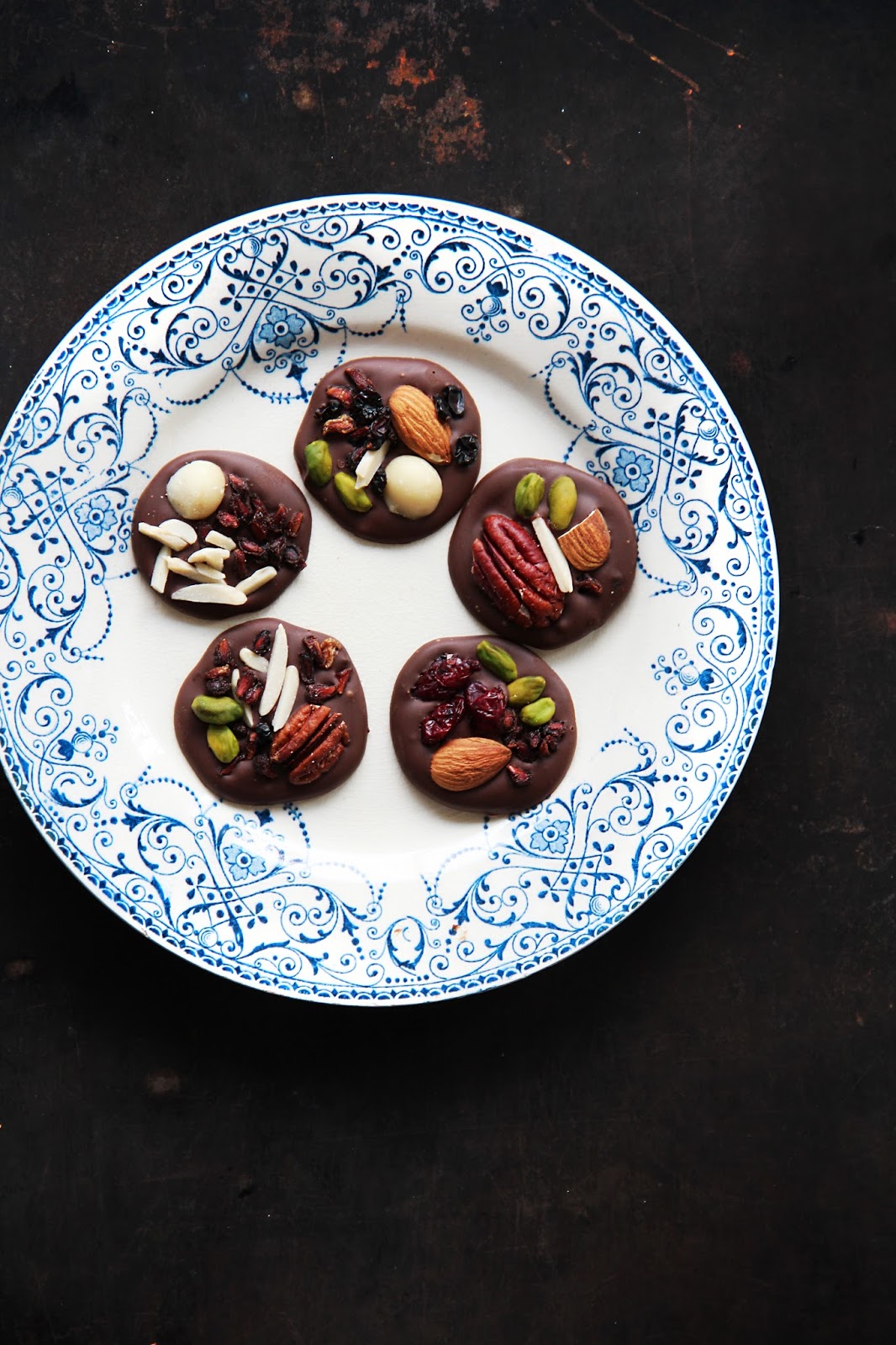 break the chocolate into pieces and melt it very slowly on very low heat, stirring occasionally with a spatula to smooth it. when fully melted, add spirulina and remove from the heat. let cool a little. with a tablespoon, shape little circles onto a parchment paper. garnish with nuts and fruit according to your liking. let harden in a cold place until the chocolate is fully set. keep in an airtight container in the fridge.