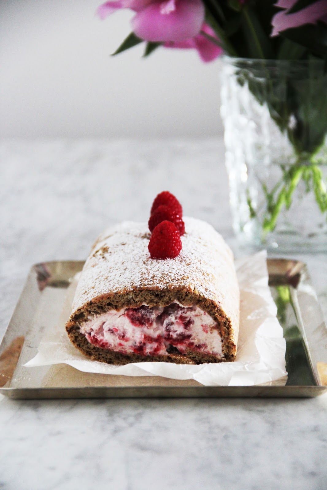 in the meantime, prepare the simple filling. whip the heavy cream, sweeten with the vanilla sugar and add the whole raspberries and fold them in. some might crush and that’s okay. unwrap the roll and spread the whole sponge rectangle with the raspberry whipped cream, evenly. roll up carefully. place the roll on a cake platter, with the open side facing down. decorate with raspberries and dust with confectioners’ sugar. refrigerate or eat immediately.