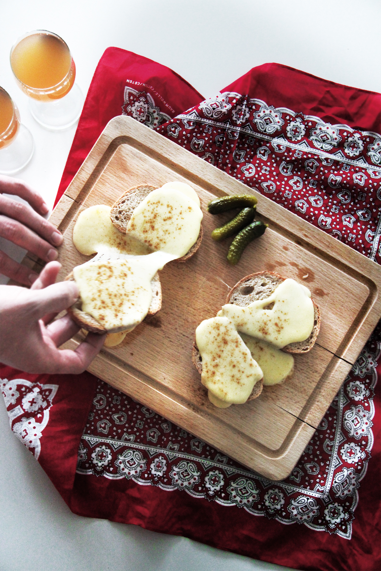 Grate the cheese. Place it in a large pan, drizzle with the Cider and melt on low heat, while stirring constantly. When the cheese is fully melted, pour it over a slice of bread, dust with paprika and serve with pickles. Enjoy immediately.[/twocol_one][fourcol_one_last][/fourcol_one_last][gap height=”20″]