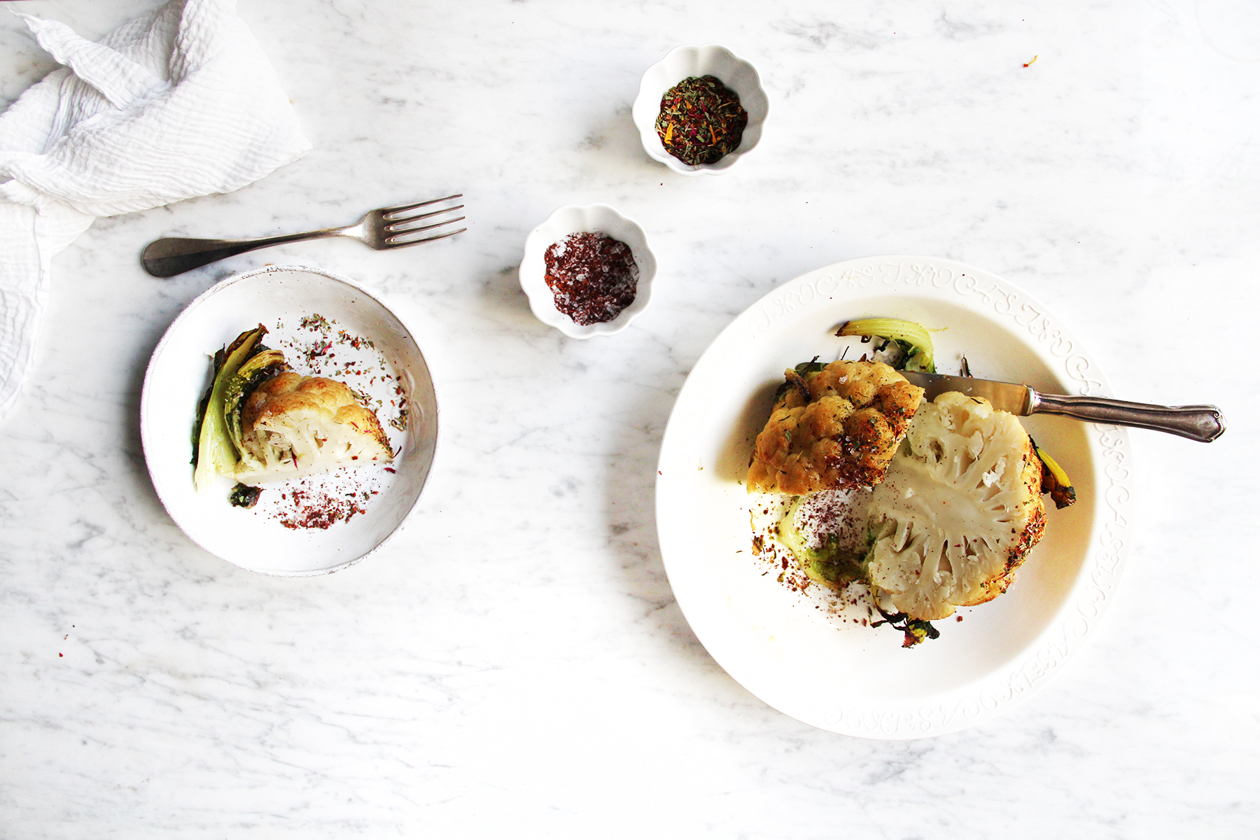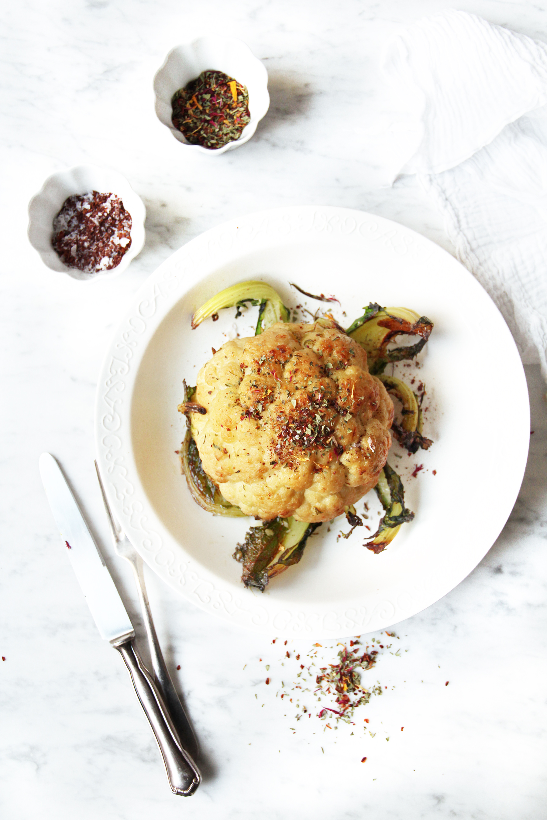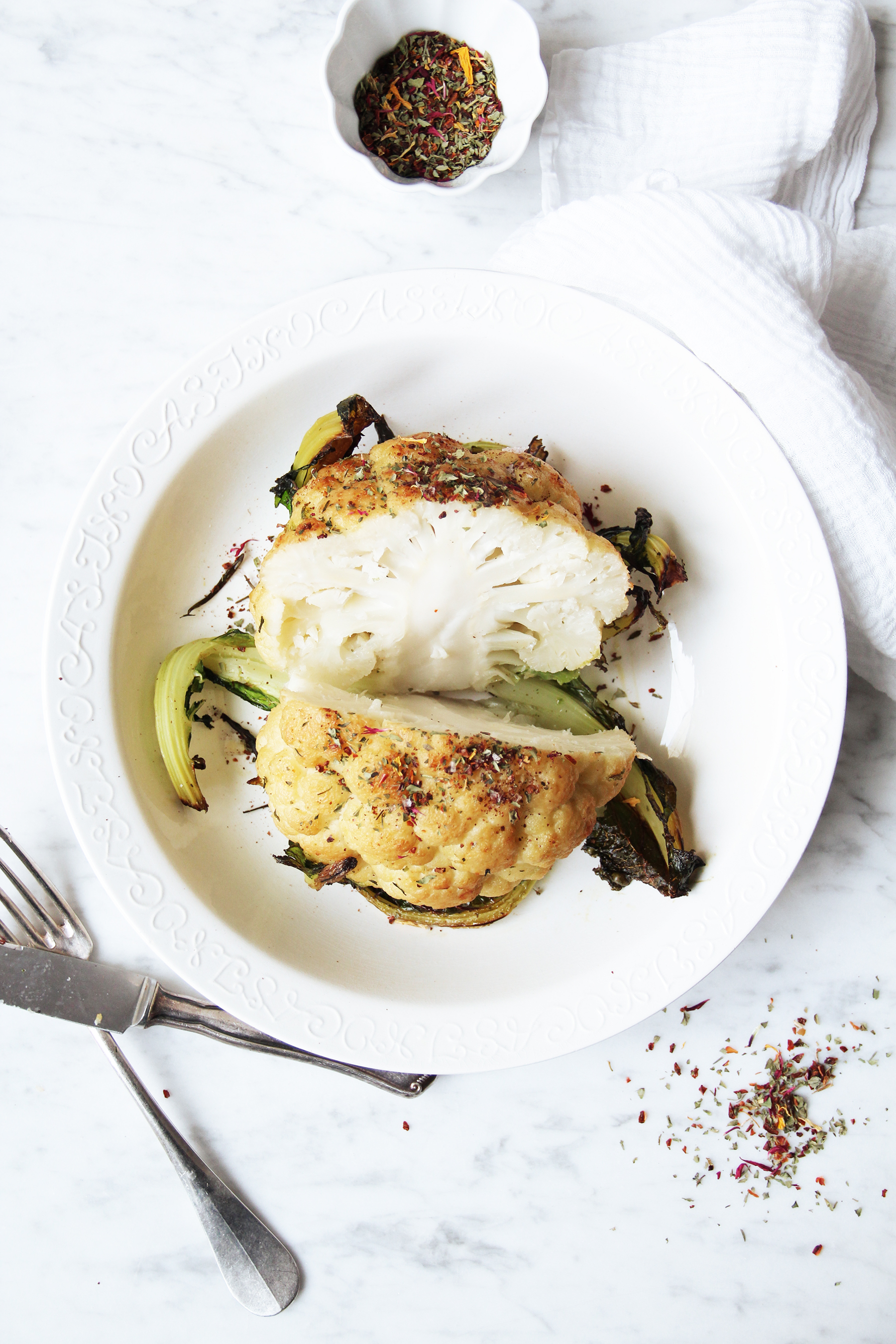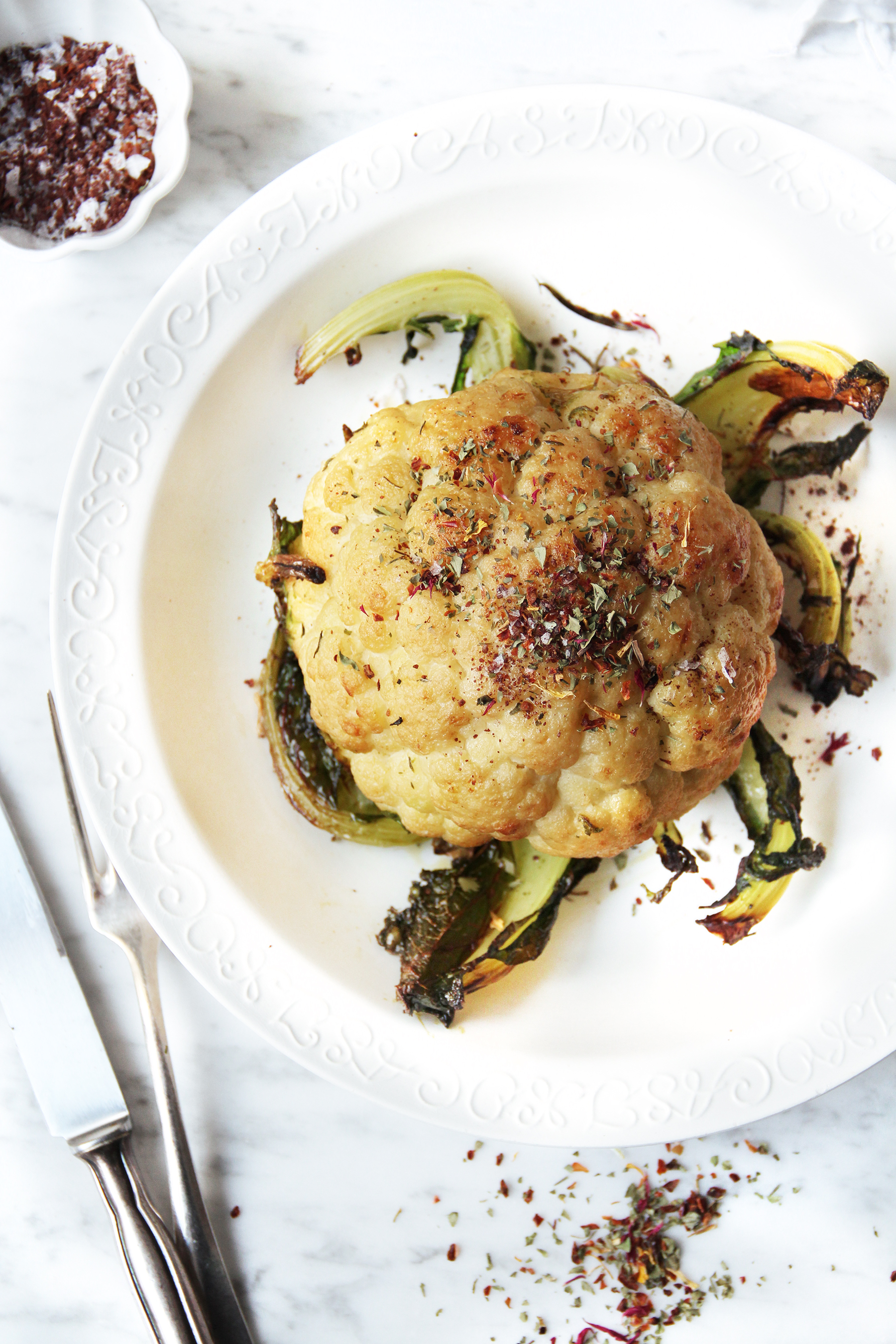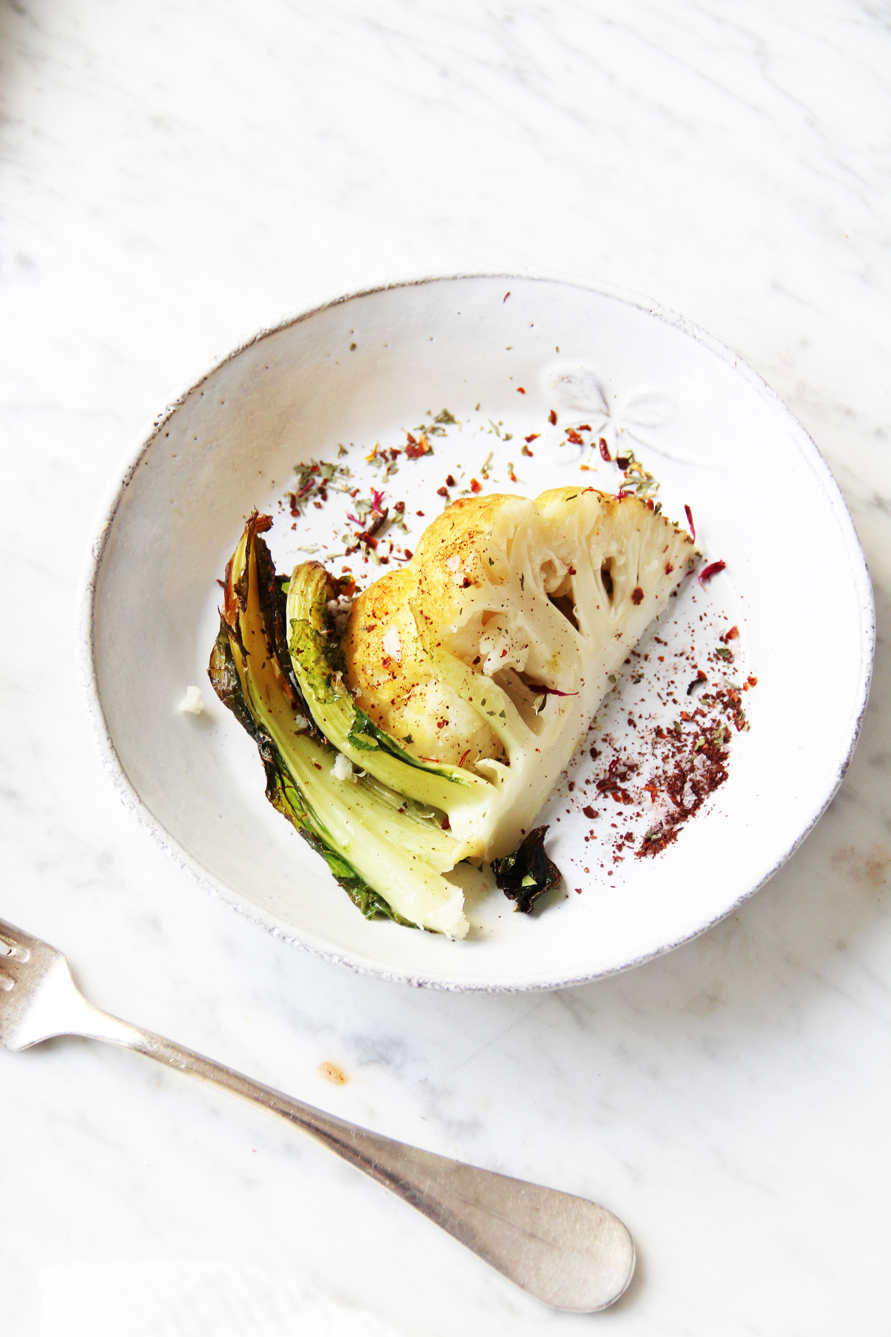 Clean the cauliflower, leaving the leaves on. Heat a large pot of water, adding the herbs, garlic and and vegetable broth. Blanch the cauliflower in it for 8 minutes, until almost tender. Drain and reuse the herbs and the garlic: spread it on a baking sheet lined with parchment, then set the cauliflower on top. Brush with melted butter mixed with the olive oil. Roast for 30 minutes at 220º C / 400º F until nicely browned and crisp on the outside. Mix the sumach and salt. Plate the cauliflower and serve with the sumach-salt and with some dried flowers. Ready when you are!/twocol_one][fourcol_one_last][/fourcol_one_last][gap height=”20″]