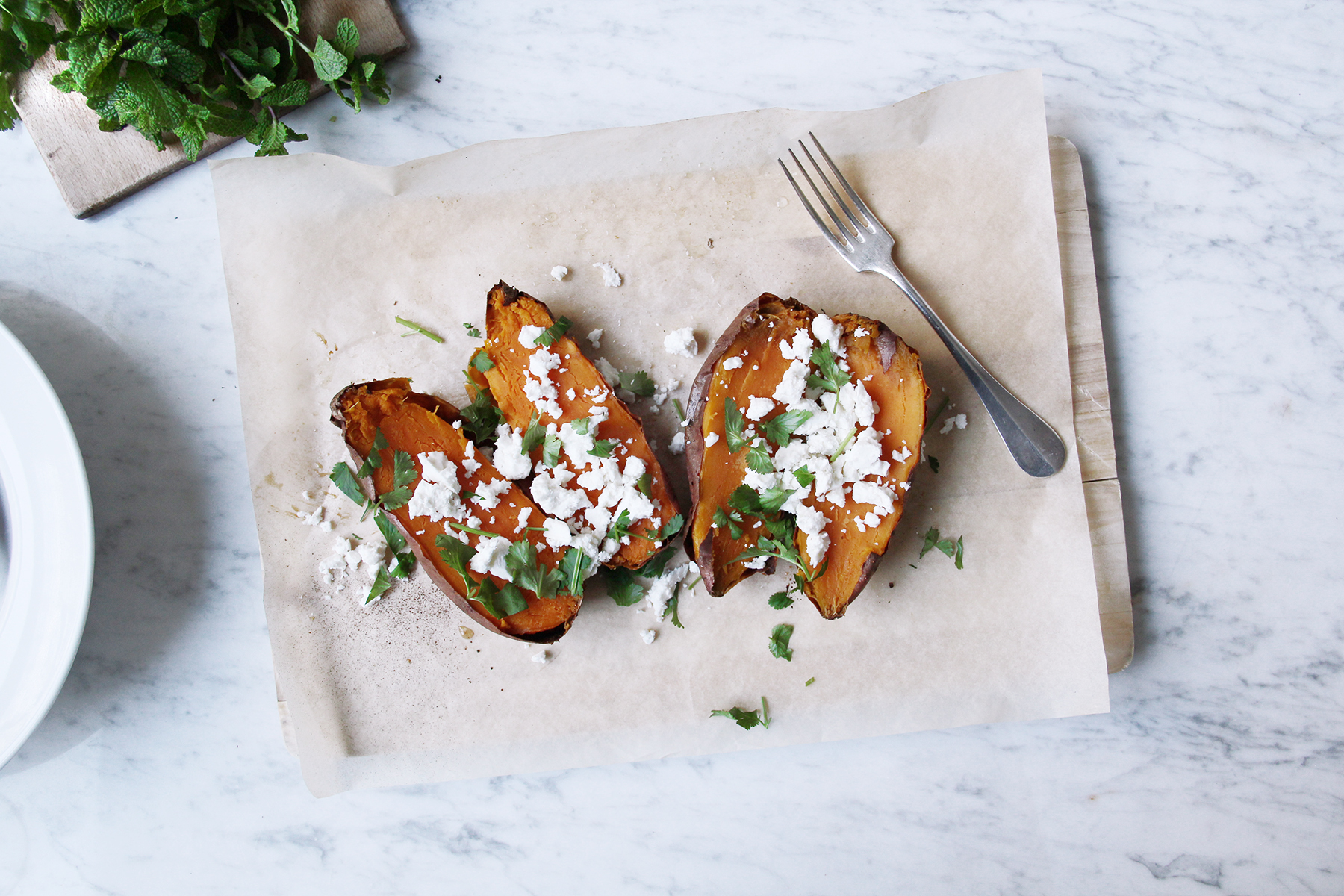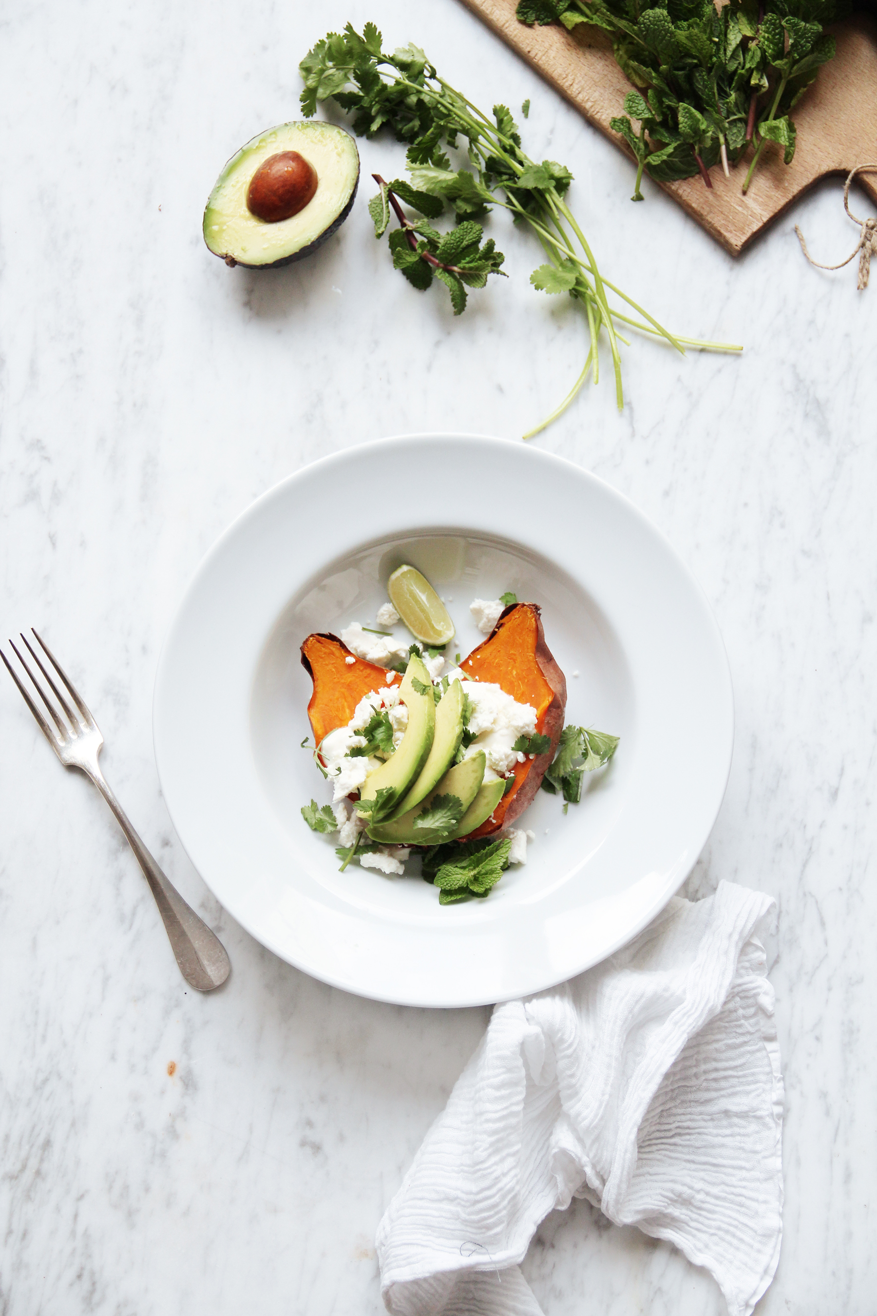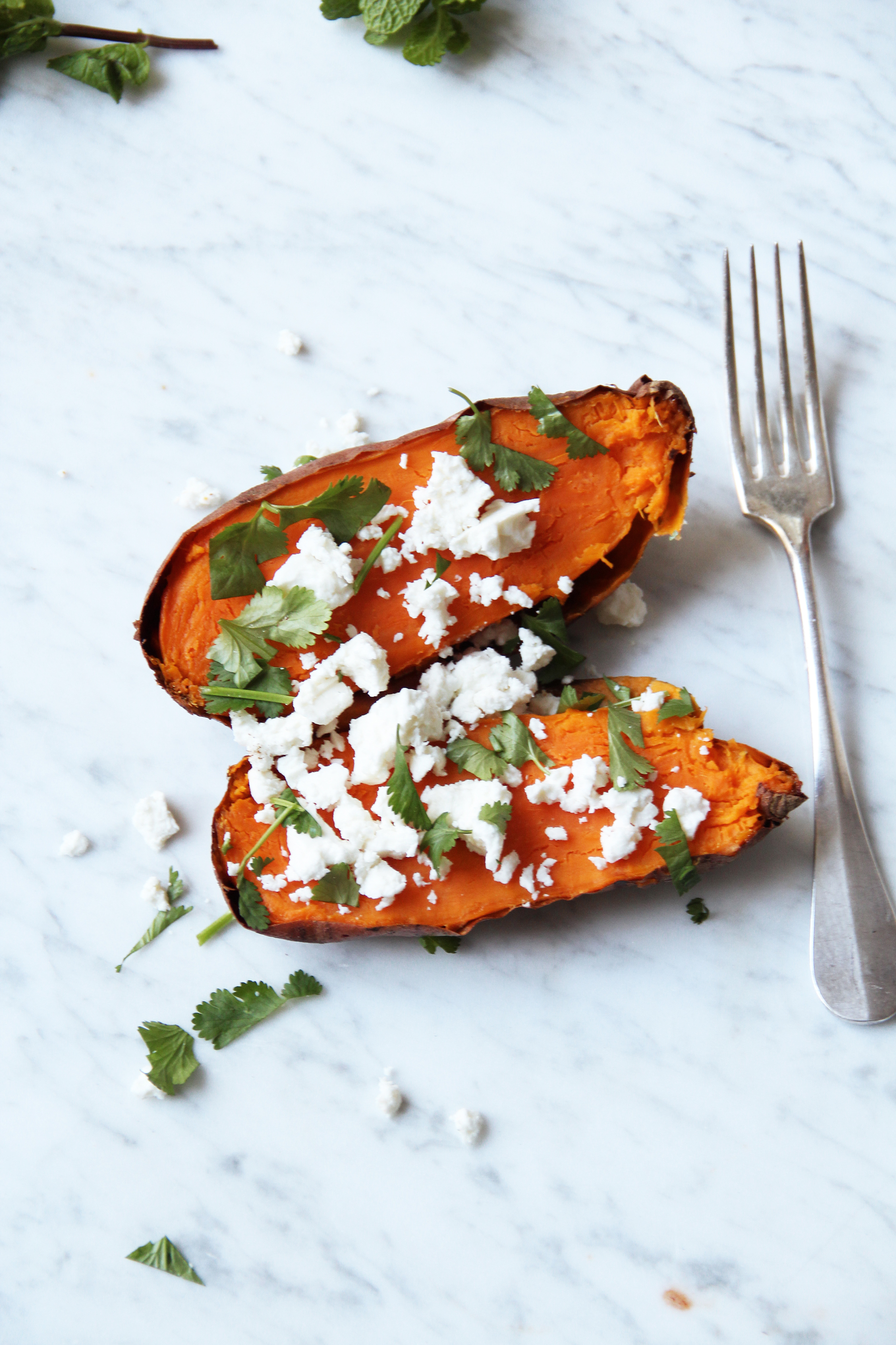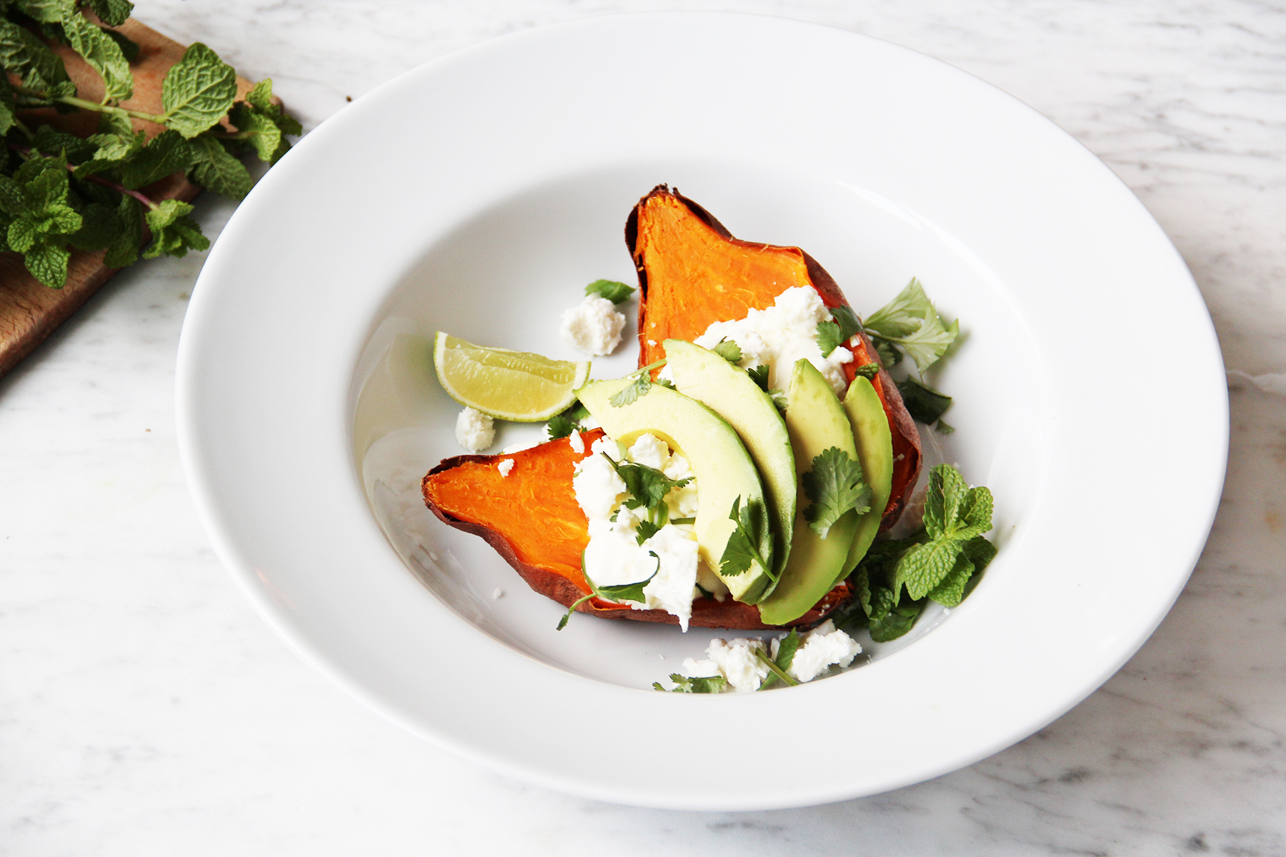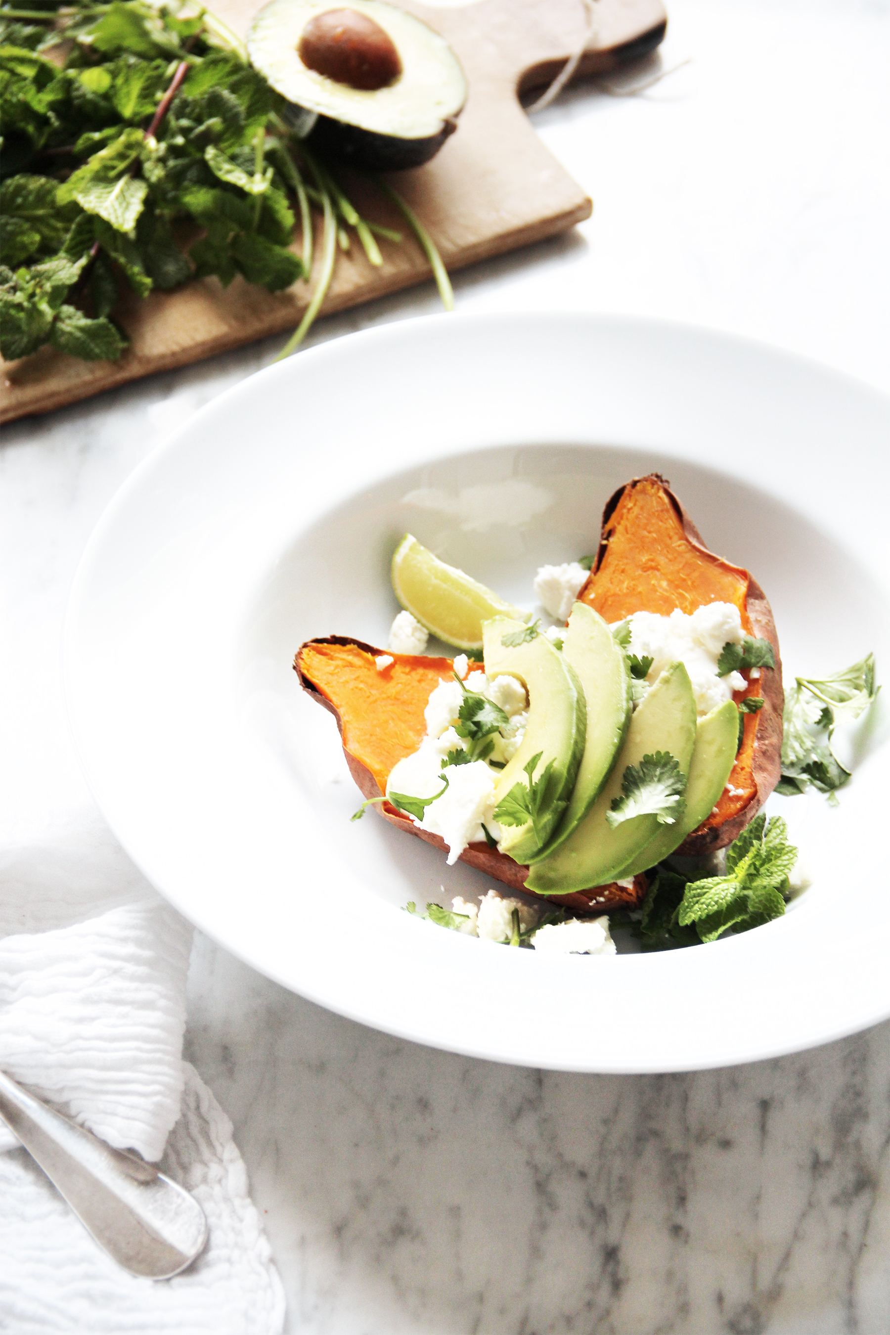 Clean the sweet potatoes and pat dry. Pierce them thoroughly multiple times with a knife. Place on a baking sheet lined with parchment and bake at 220º C / 400º F for 40-45 minutes or until tender (might take up to one hour, depending on size). Remove from the oven and let cool a little. In the meantime, season the sour cream with lemon juice and some herbed salt. Slice the avocado, crumb the feta cheese, coarsely chop or tear apart the herbs. Half the sweet potatoes, plate and garnish with the toppings: a dollop of the sour cream, the feta crumbs and the herbs. Bon apetit!/twocol_one][fourcol_one_last][/fourcol_one_last][gap height=”20″]