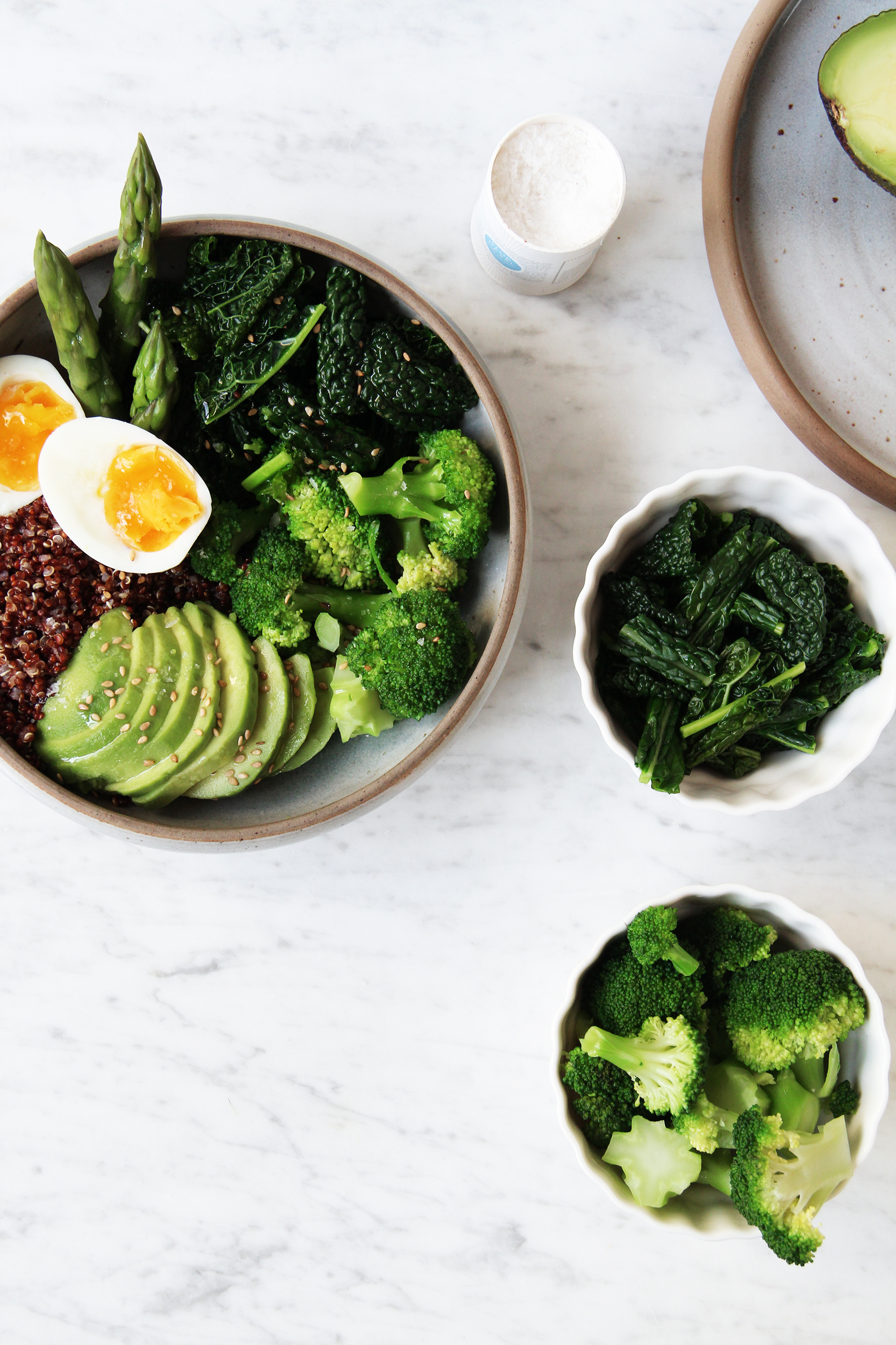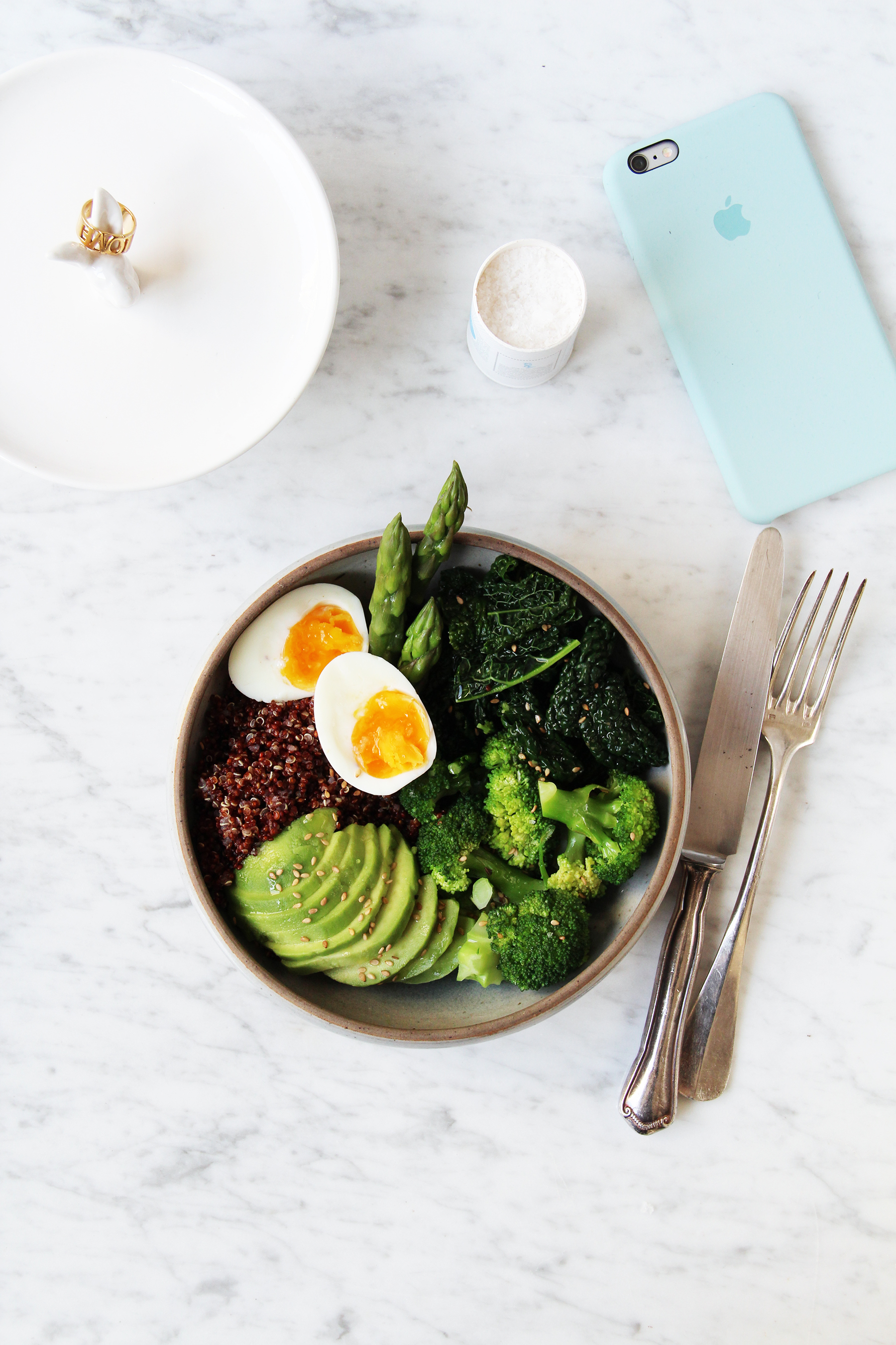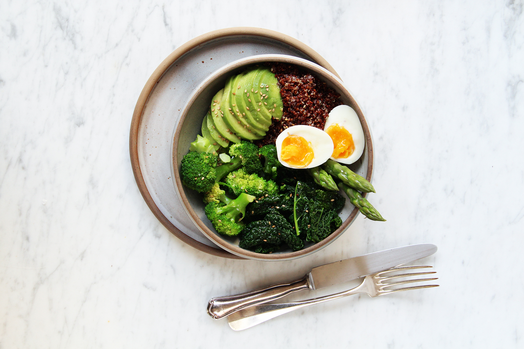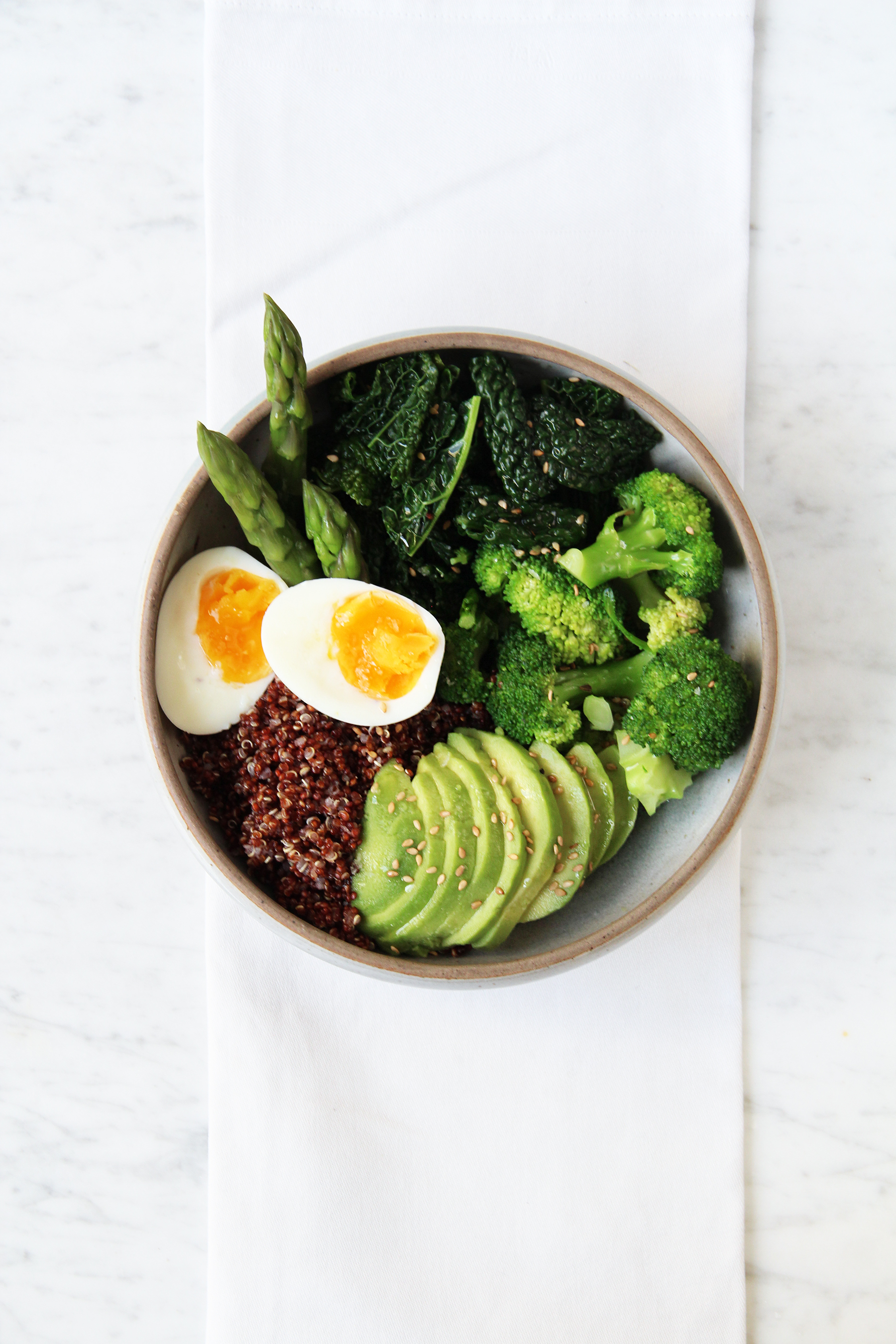 Arrange everything in a bowl (because bowls are the new plates, huh): a spoonful of quinoa and top it with the blanched asparagus, kale and broccoli. Dress with the remaining olive oil and lemon juice. Top with the avocado slices and eggs. Sprinkle with salt and sesame. Voilà - a bowl full of goodness for you, so you can feel like a goddess.[/twocol_one][fourcol_one_last][/fourcol_one_last][gap height=”20″]