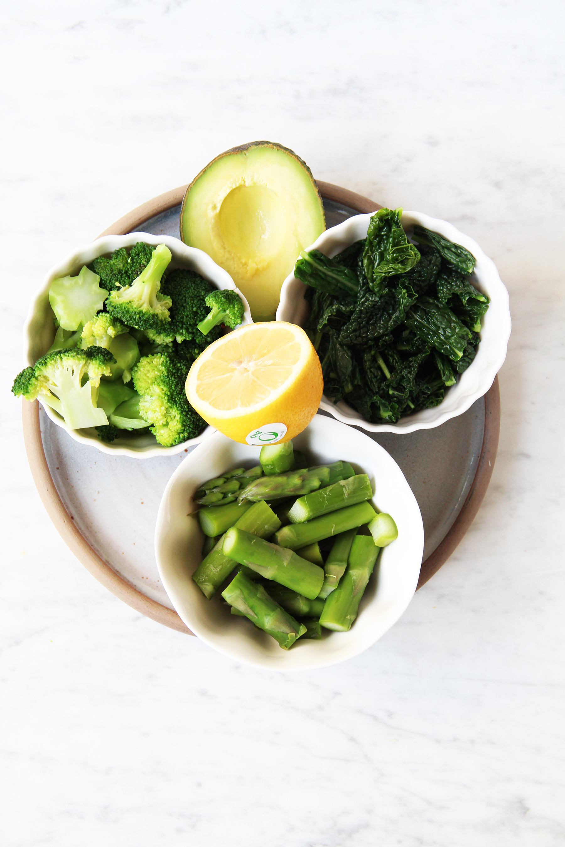Cook the quinoa in water according to directions. Add one tablespoon of olive oil to it and put aside. Bring a large pot of water to the boil. Blanch the greens in it one after another: asparagus (4 minutes), broccoli (3 minutes), kale (1 minute). Drain and chill in ice cold water respectively. Boil the eggs in the same water, for 4 minutes. Drain, chill, peel and half. Slice the avocado very finely and sprinkle with a little lemon juice.