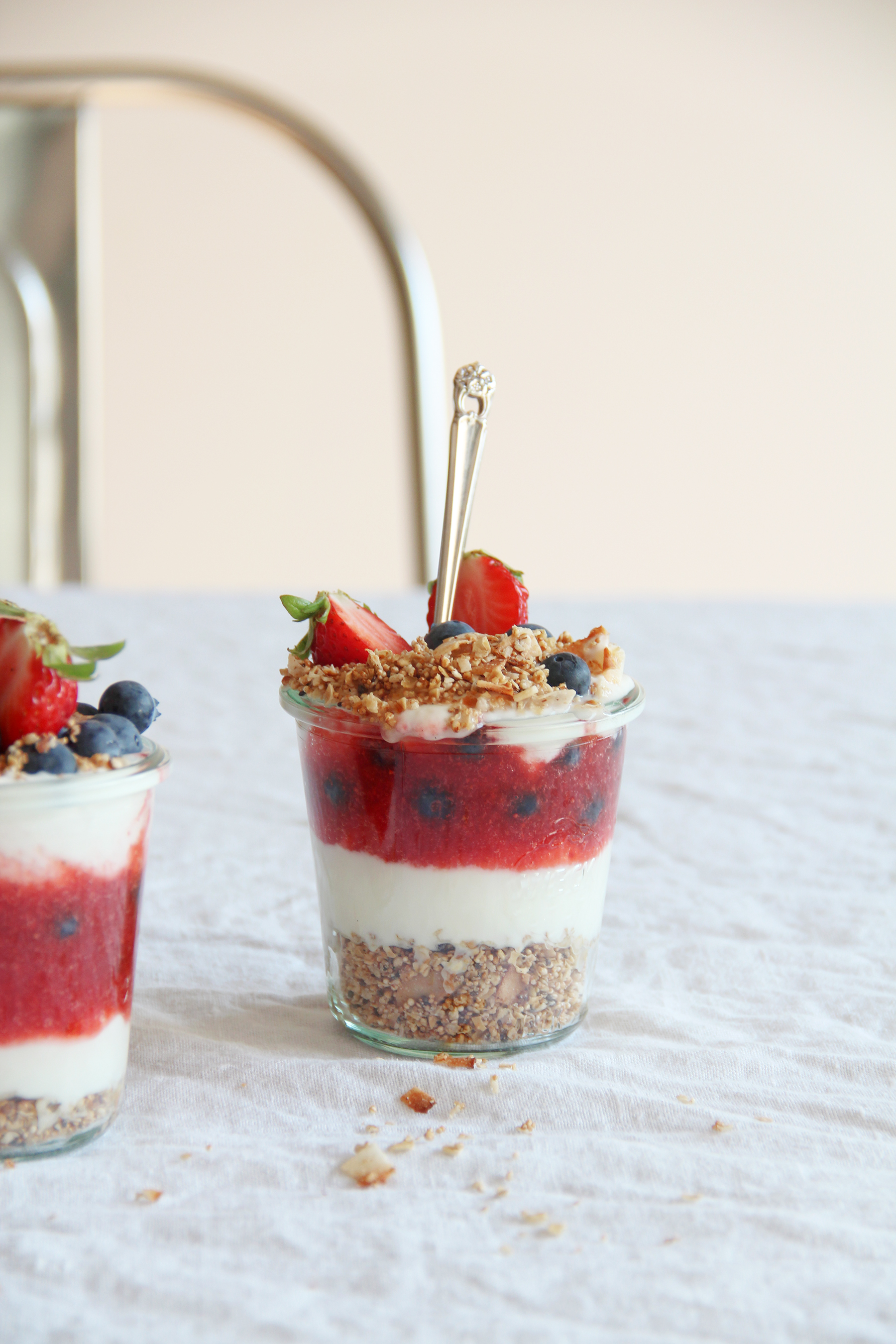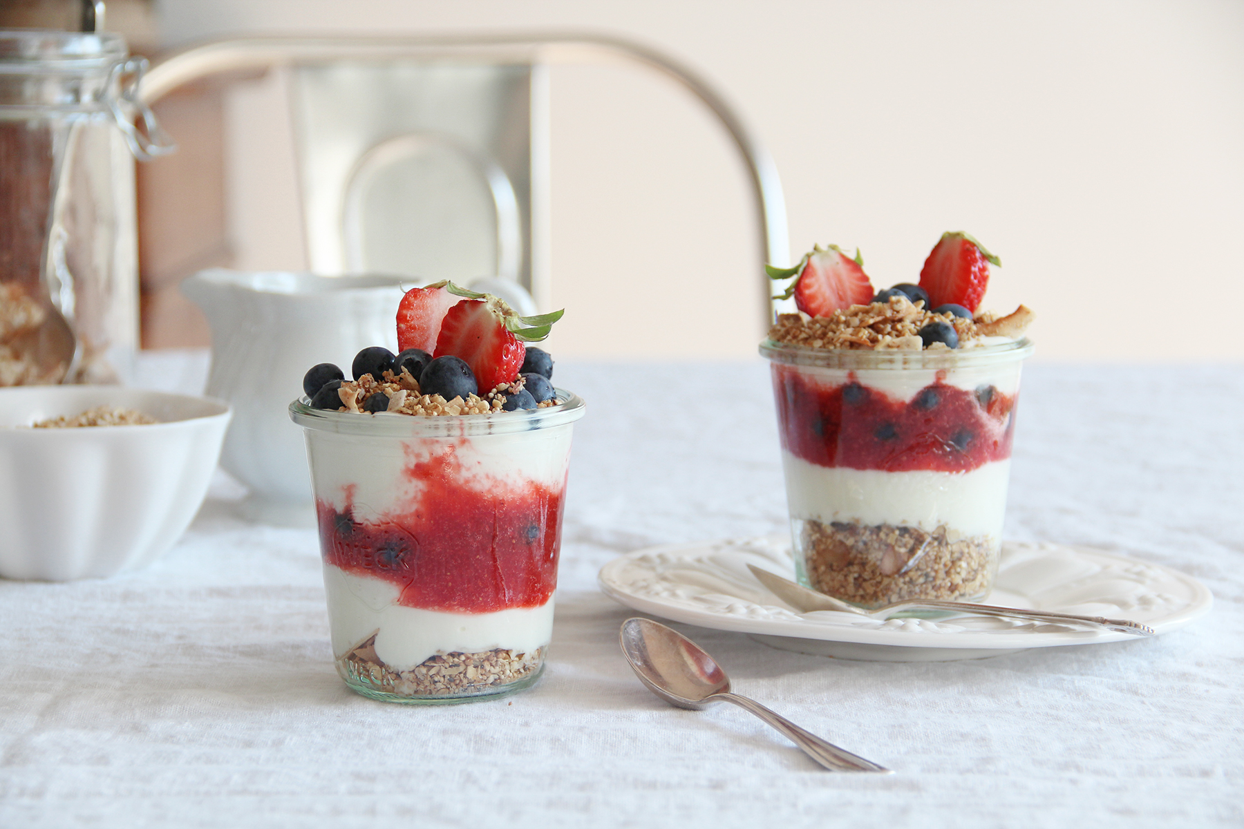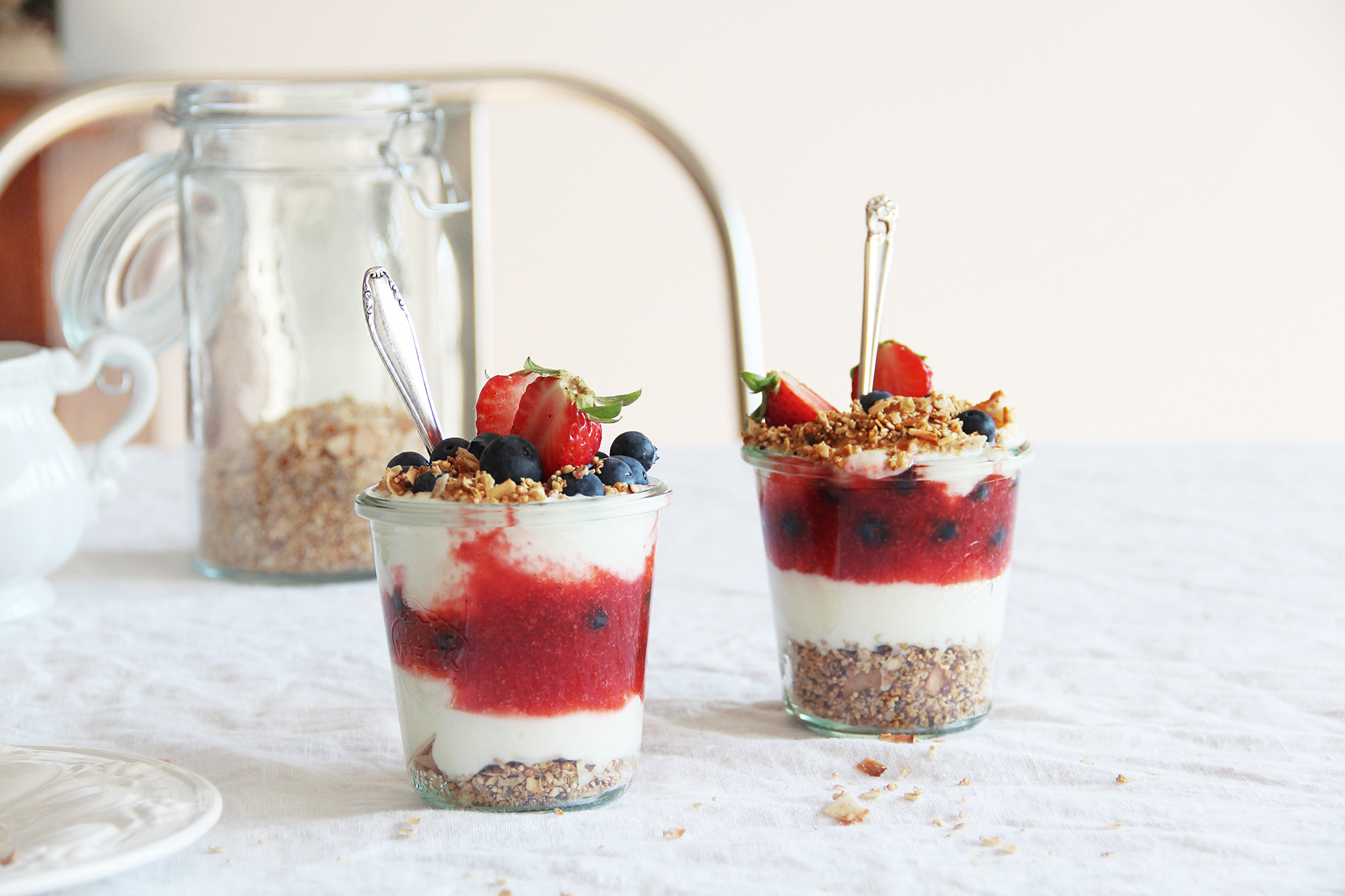 For the granola layer jars, I pureed a couple of strawberries with lemon juice and maple. Layer some granola at the bottom of a jar, add a tablespoon or two of yoghurt on top, then a layer of the strawberry coulis and some blueberries, and start again with granola. Top things off with whole strawberries and serve.[/twocol_one][fourcol_one_last][/fourcol_one_last][gap height=”20″]