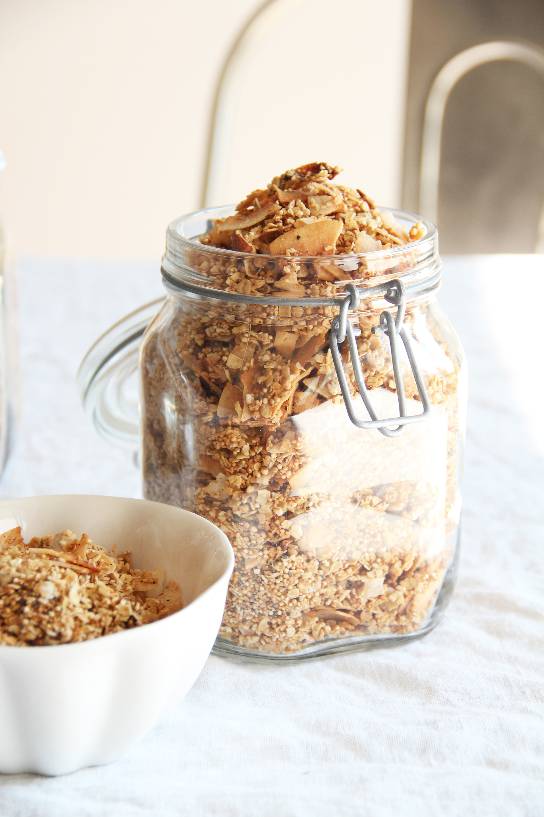 Also, with every year that I age, I appreciate my mom more. She’s always been my closest friend, ally and soul-mate, my biggest fan. And so, I wanted to give her something, that’s not flowers (for once). Because flowers are so obvious (albeit pretty and always welcome in our books). So I made what every daughter with an oven would make: Granola. Because it’s healthy, it’s indulgent, it’s whipped up so easily and quickly and it stores well. Plus, your mom or whatever gift recipient you might want to surprise will thank you, because it can be enjoyed in so many ways. With yoghurt and fruit, on top of a smoothie or simply in a bowl full of almond milk.