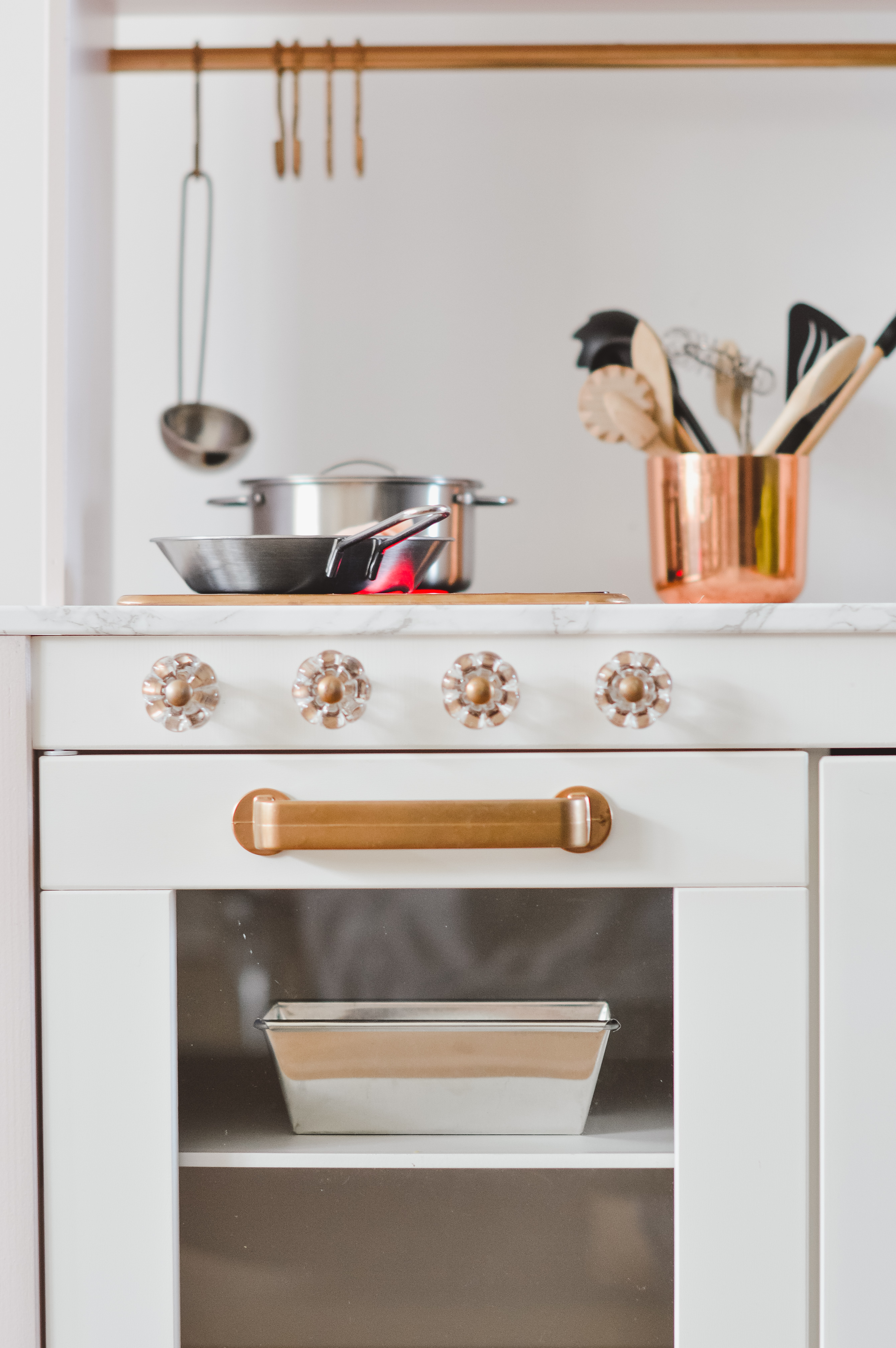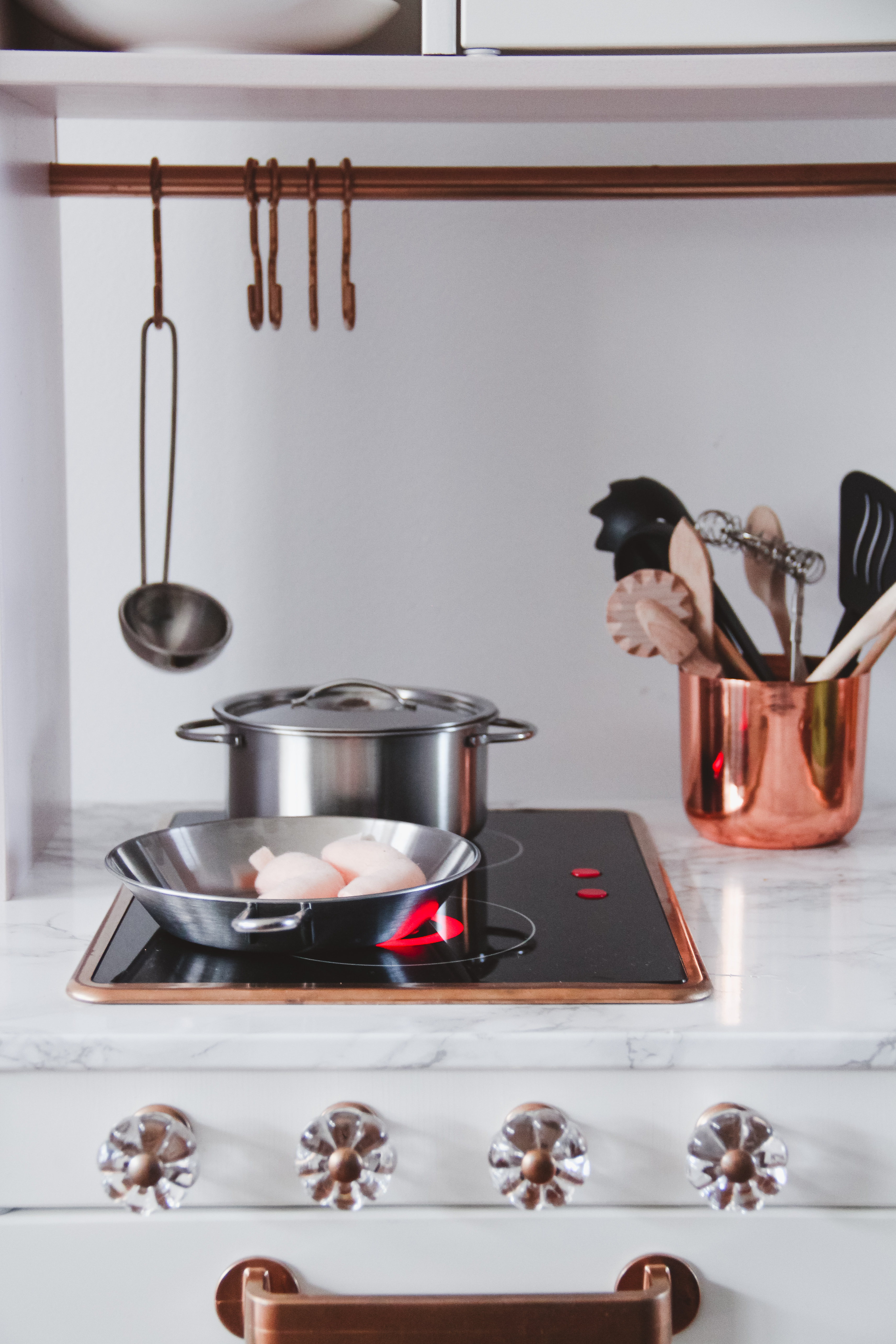 So we recently threw out a lot of stuff at home, including furniture that was pretty bulky. The result is still a work in progress (is anything ever really finished with a toddler between your legs, or are we forever stuck in this unnerving “work in progress” state?). But in the process, a play kitchen for E was able to move in! As a - albeit as of late very lazy - humble home chef and dedicated gourmet, I sure want to give my child the opportunity to discover her cooking skills. And she’s already helping me a lot whenever I cook - sitting on the counter (living on the edge, yes!), commenting my every move, chopping (okay, munching on) carrots and making stirring moves when I stir in the pots. I have always dreamed of a white and copper kitchen myself, with a giant marble countertop workspace. So we figured we would just have to give an the IKEA play kitchen some love. The design of the Duktig play kitchen is just so perfect; classic and timeless. With a few simple steps, we upgrade it a bit to make it more “ours”, and make it a girl’s dream kitchen. So… it was a plan and project! And hubbie takes those plans very seriously (so much love for this man, for the record).