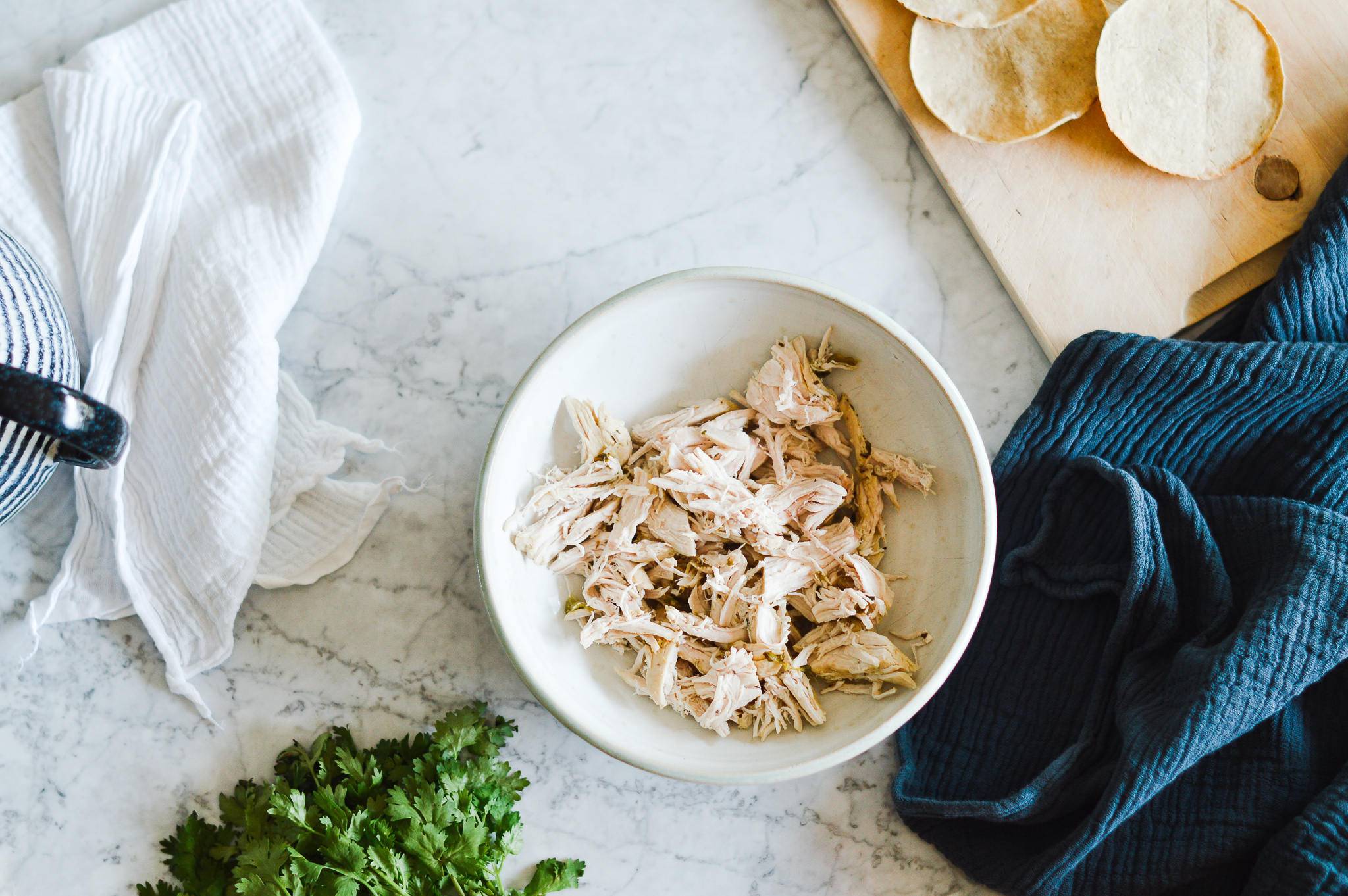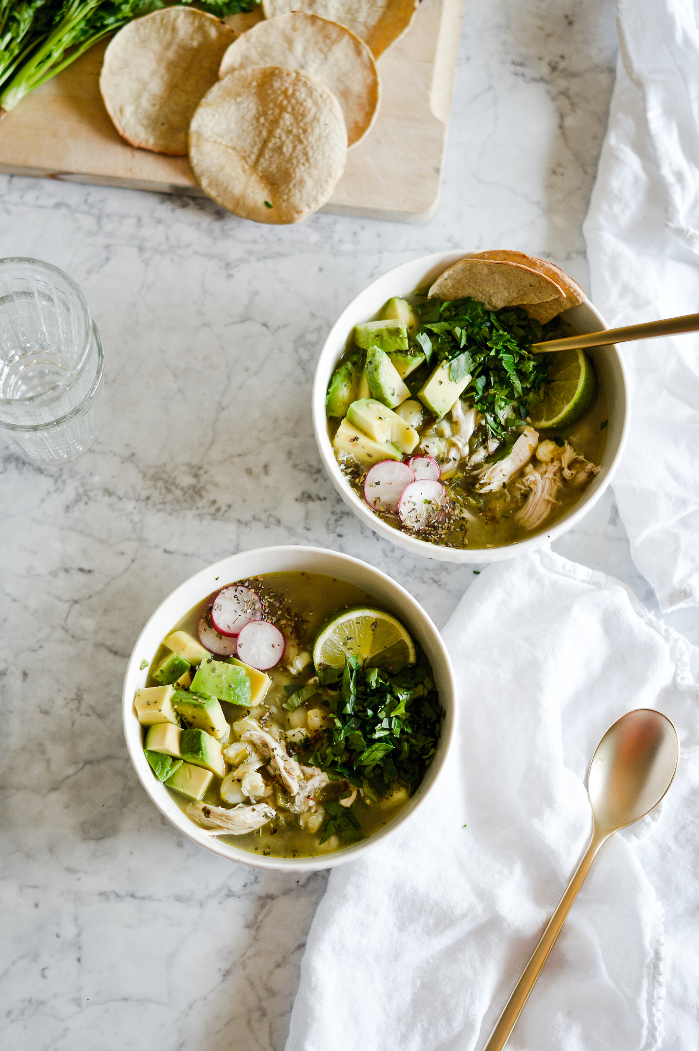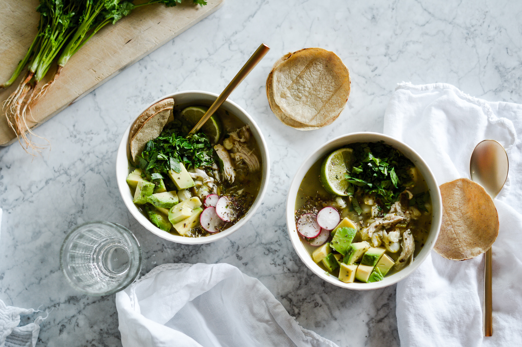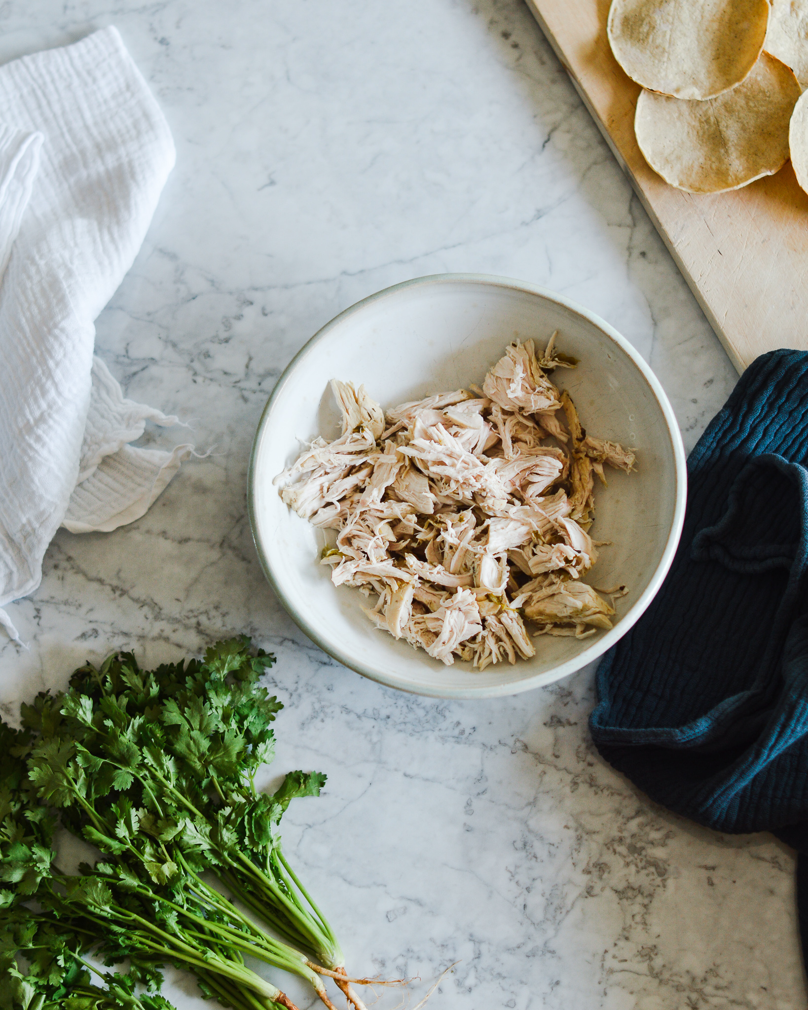After 2 hours (heavenly smells included) you should have a peek and a spoonful, ha, and don’t we love that. Careful when you open the lid of the slow cooker - steam will escape. Remove the chicken with tongs. When it falls apart all on its own, the poblanos and tomatillos have turned the broth into a nice, creamy texture and the hominy are tender but still with some bite, then you’re good to go! Pull apart the chicken into strips and put back to the stew.
