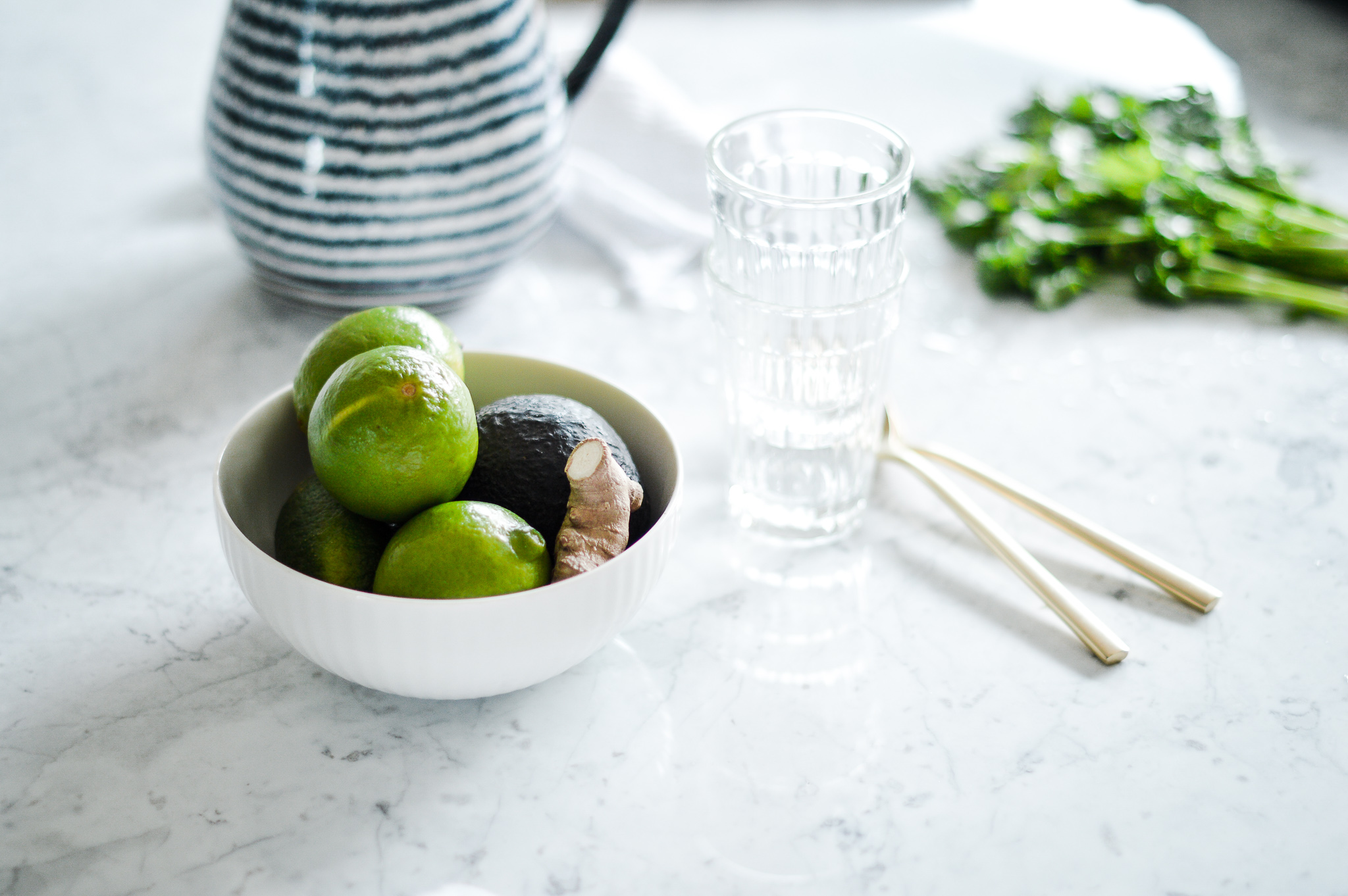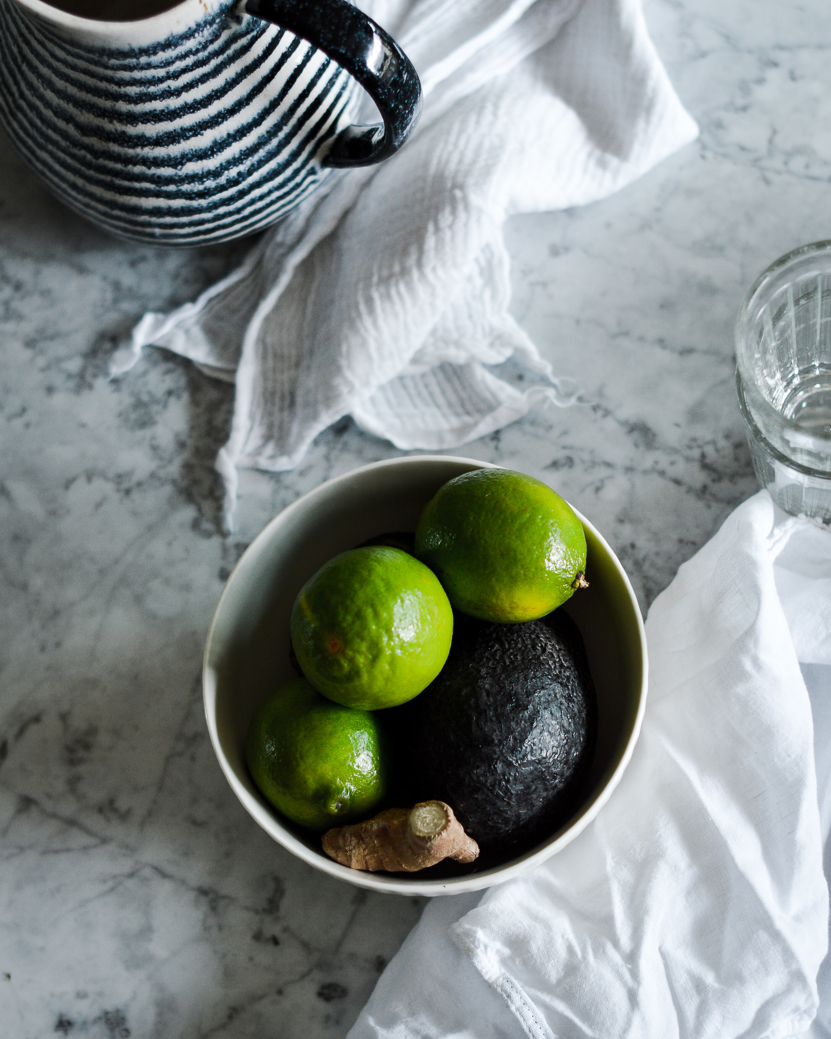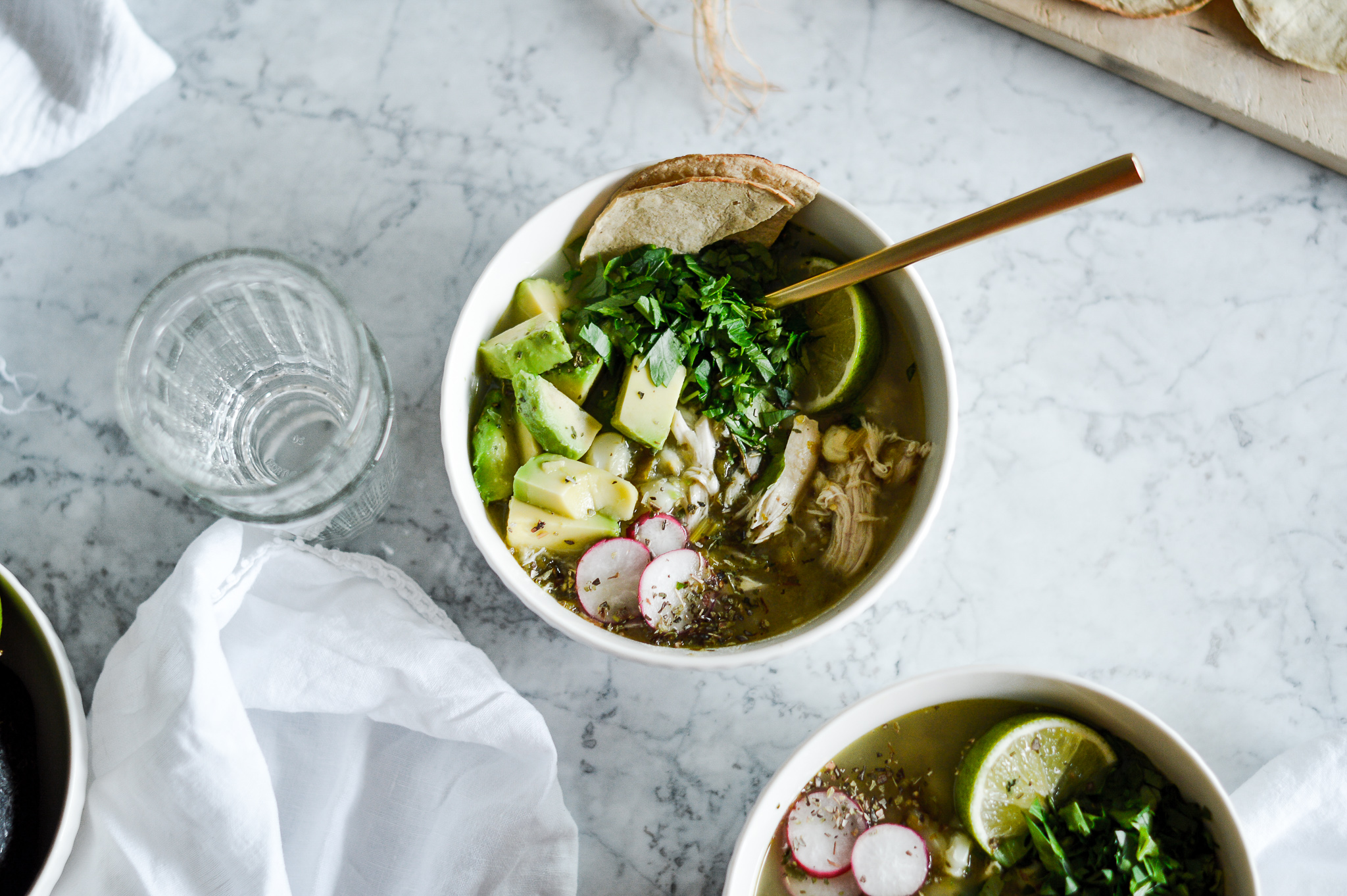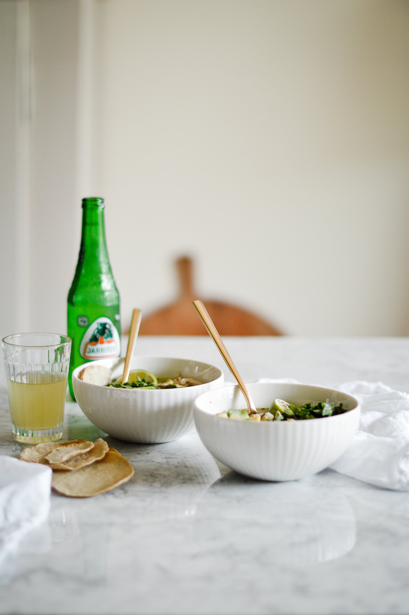 All you have to do next is to squeeze in the juice of one lime, season with salt and pepper to taste and then chop up the garnish fixings of your choice. Avocado goes highly recommended - the creaminess is a nice addition to the broth. Radish slices are nice for some bonus crunchiness, as are a couple of chips of tostadas (you can also use nachos for that). I didn’t have any cabbage handy but some shavings of (green or, come to think of it, blue) cabbage would be lovely, as well. Sprinkle with some more dried herbs. Serve with complimentary tostadas lime wedges, and, well, a crazy green Mexican lemonade with a strange taste. And… Olé [insert Proper Mexican Greeting here].