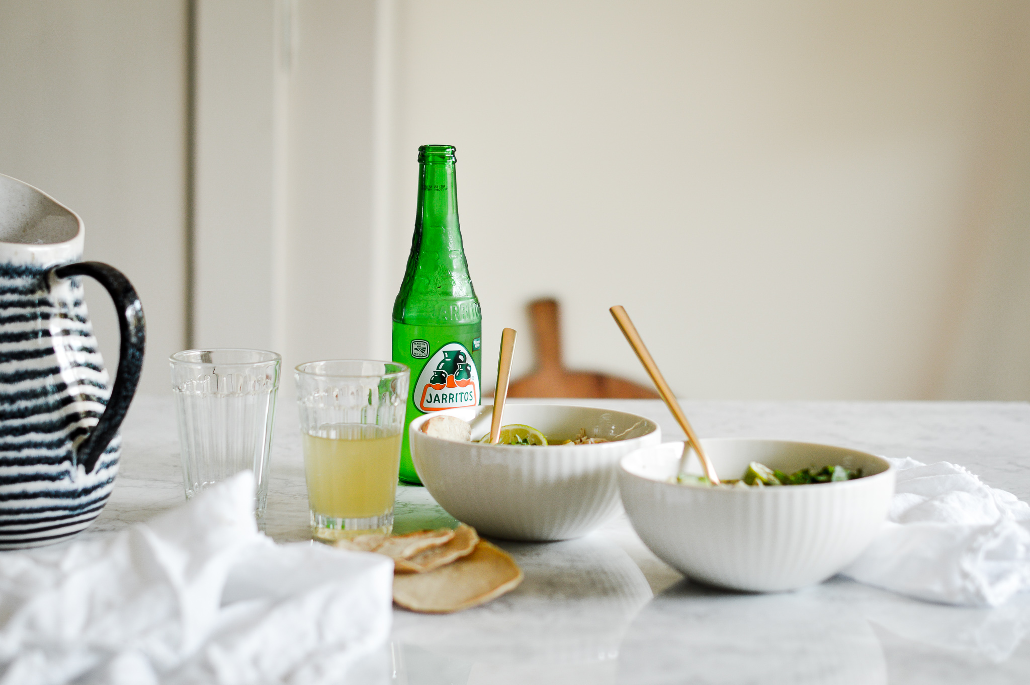 As soon as I had the Betty Bossi Multikocher installed, I set out to search for the best starter recipe. Hours (or days, really) later browing through my innumerable Pinterest boards (and, frankly, feeling a tad bit lost in the process…) it was love at first sight, and I knew it was meant to be: Posole Verde de Pollo. Basically chili con carne’s baby sister, just not as spicy. Just as comforting and rich, but with fresh zestiness, which make it appropriate for summer, too. And with the - pulled! - chicken it feels just that much lighter. Phew, just so glad I had this genious stroke of luck and thought of Posole! Seriously, where has Posole been all my life? Ahaha.
