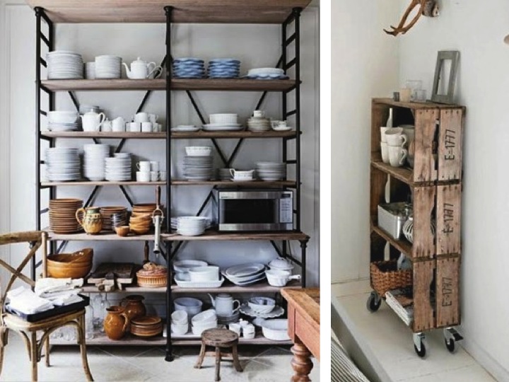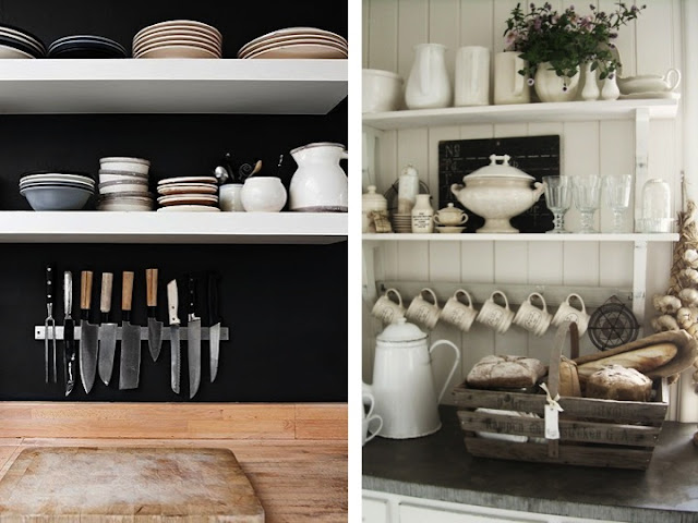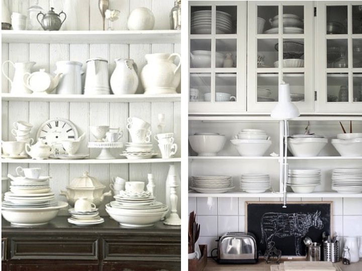 anyway. so my collection isn't as big as you'd expect it or as i would like it (sigh) to be. but it's getting bigger by the year. no doubt i will come to a point where a serious re-organization of the storage has to take place. so far, i've only got this pretty treasurer here - but it won't hold all my treasures much longer... what do you think about these visible kitchen-based display and storage options? love the white concentration and rustic but chic vintage appeal.