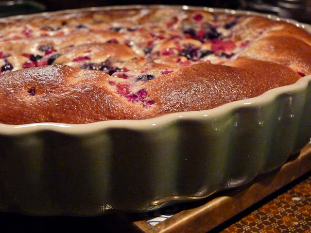 clafoutis... warm, sweet and fruity clouds. it's not really a cake, and it's not a pudding, either. it's really something between a spongy pancake and a mellow muffin with some fruity accents. thus, clafoutis is not limited to a specific day-time, it's perfect for every occasion. dessert, breakfast, midnight-snack, lunch. you name it, clafoutis it is. plus, you can make it with nearly every fruit imaginable (i used frozen mixed berries here, but canned sour cherries are delicious, as well).