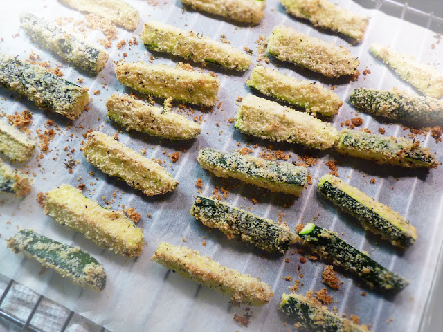 cut the zucchini into batons (on a cozy kitchen you find nice instructions, by the way), then first dip the zucchinis into the eggs, then into the bread crumb mixture. cover from all sides. then place the batons on a baking sheet and bake for about 20 minutes, or until they are golden and a little crisp around the edges. you could eat them with sauce (i.e. mayonnaise, aioli). or just skip (at least those) calories and forget about a dip altogether. ketchup! why not, eh?
