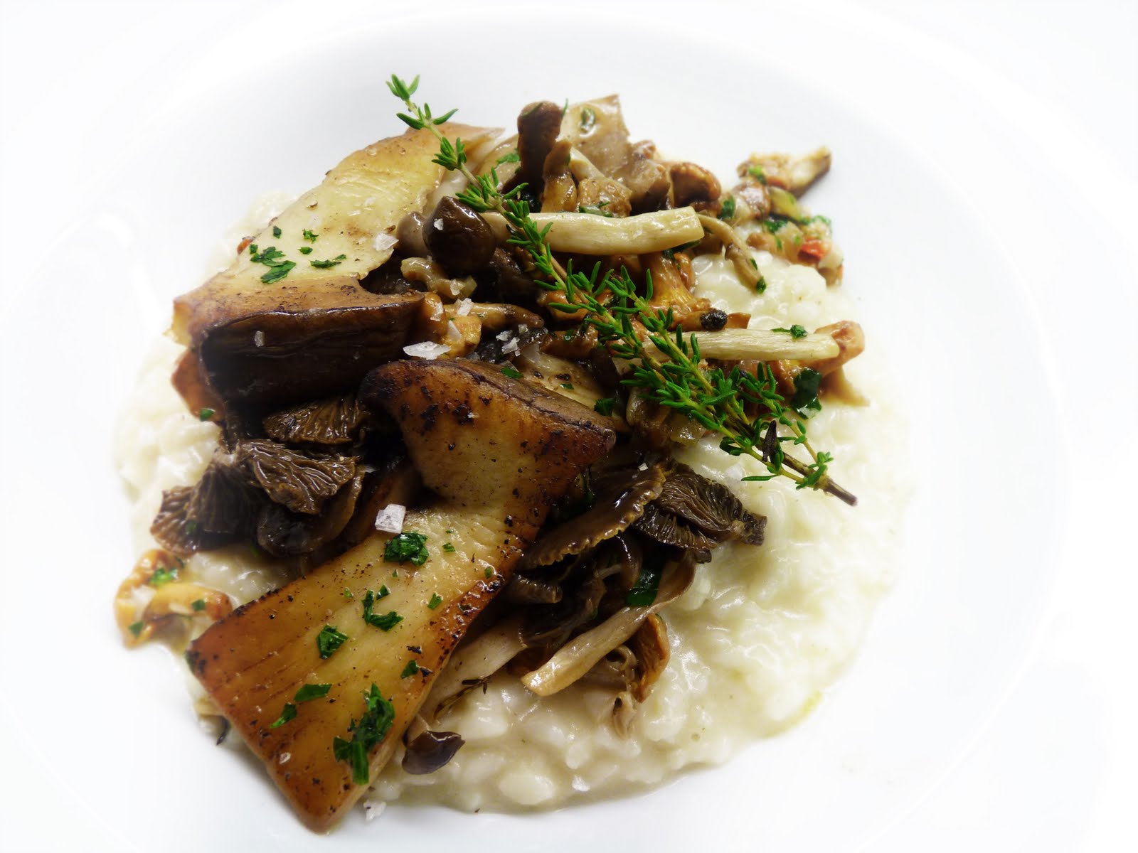 drizzle an extra pinch of porcini salt (or normal fleur de sel) on every portion, add a thyme sprig for decoration and serve with additional parmiggiano reggiano on the side.