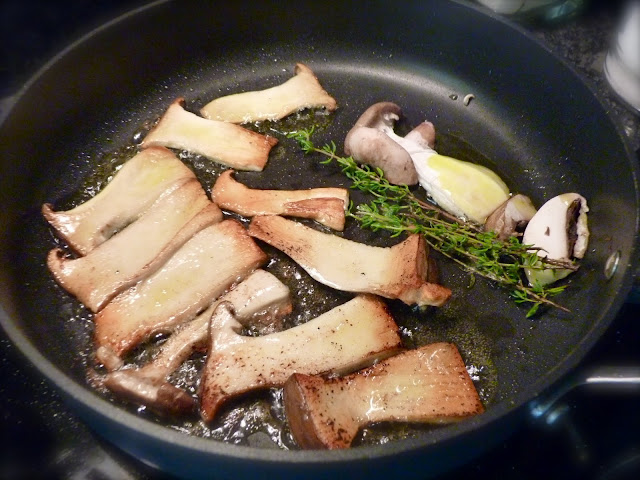 the mushrooms have to be rosted separately. i'm sorry, it means a lot of work, yes. but you'll find it's worth it, later. since some mushrooms are full of water, they will not roast well. those mushrooms will turn out 'sautéed', meaning it's more like a ragout, with some excess liquid. so, i begin with the biggest mushrooms: fry them in a very hot frying pan with some olive oil and a twig of thyme (you will have to take them out after each portion, so they won't burn, and renew. throw them away after frying, it's just for a nice perfume). fry every mushroom portion per portion, with patience, and place on the side. season with porcini salt and fleur de sel. at the end, heat a little more olive oil, sweat the onion and garlic cloves, peperoncino, parsley and thyme, for 1-2 minutes. add the broth, and now drizzle this mixture over your fryed mushrooms, so they won't dry out and become too tough. the mushrooms can be prepared well ahead, too, up to here. then you'll simply have to place them in the hot (not too hot) oven to warm them, and mix them under the finished risotto or place them on top of it.