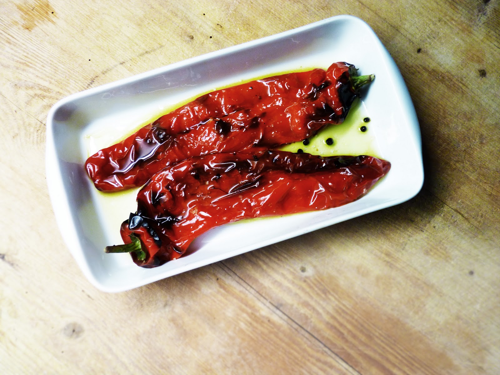 i recently headed out of the agency for a quick lunch in solitude, not exactly knowing where it took me. it so happens i stopped in front of a tiny moroccan take-away place. aside from couscous and other mezze stuff i also got charred peppers. they were so lovely, spicy and sweet, that i soon after reminded to do them as a side dish to a pasta dinner. just because.
