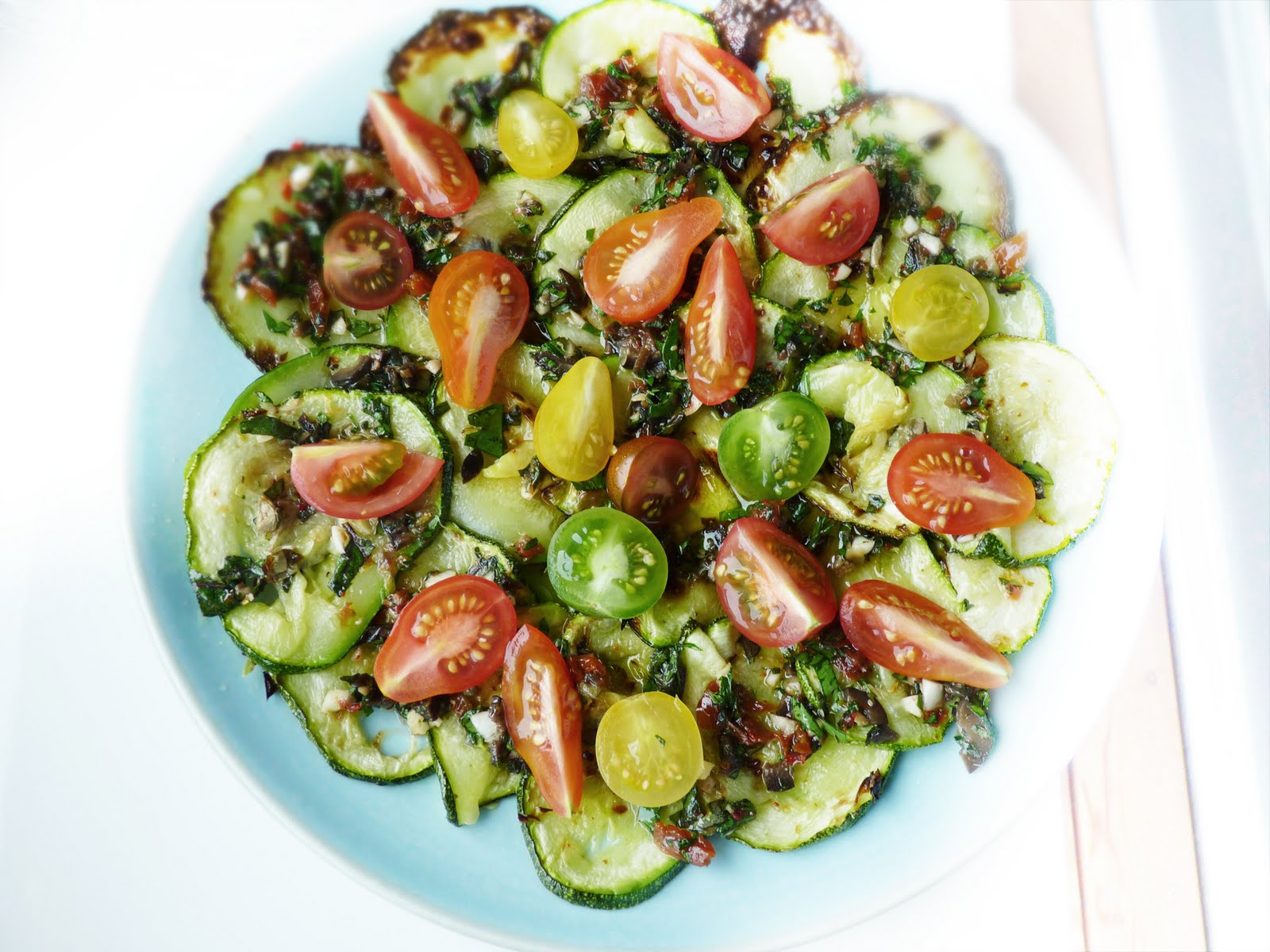 in the meantime, make something like a pesto out of the other ingredients: the olives, the sun-dried tomatoes, clove, peperoncino, herbs, lemon juice and zest, honey and the rest of the olive oil. salt lightly (as the olives and the dried tomatoes add some more saltiness, already). sprinkle over the now cooled zucchini, and decorate with the halved tomatoes.
