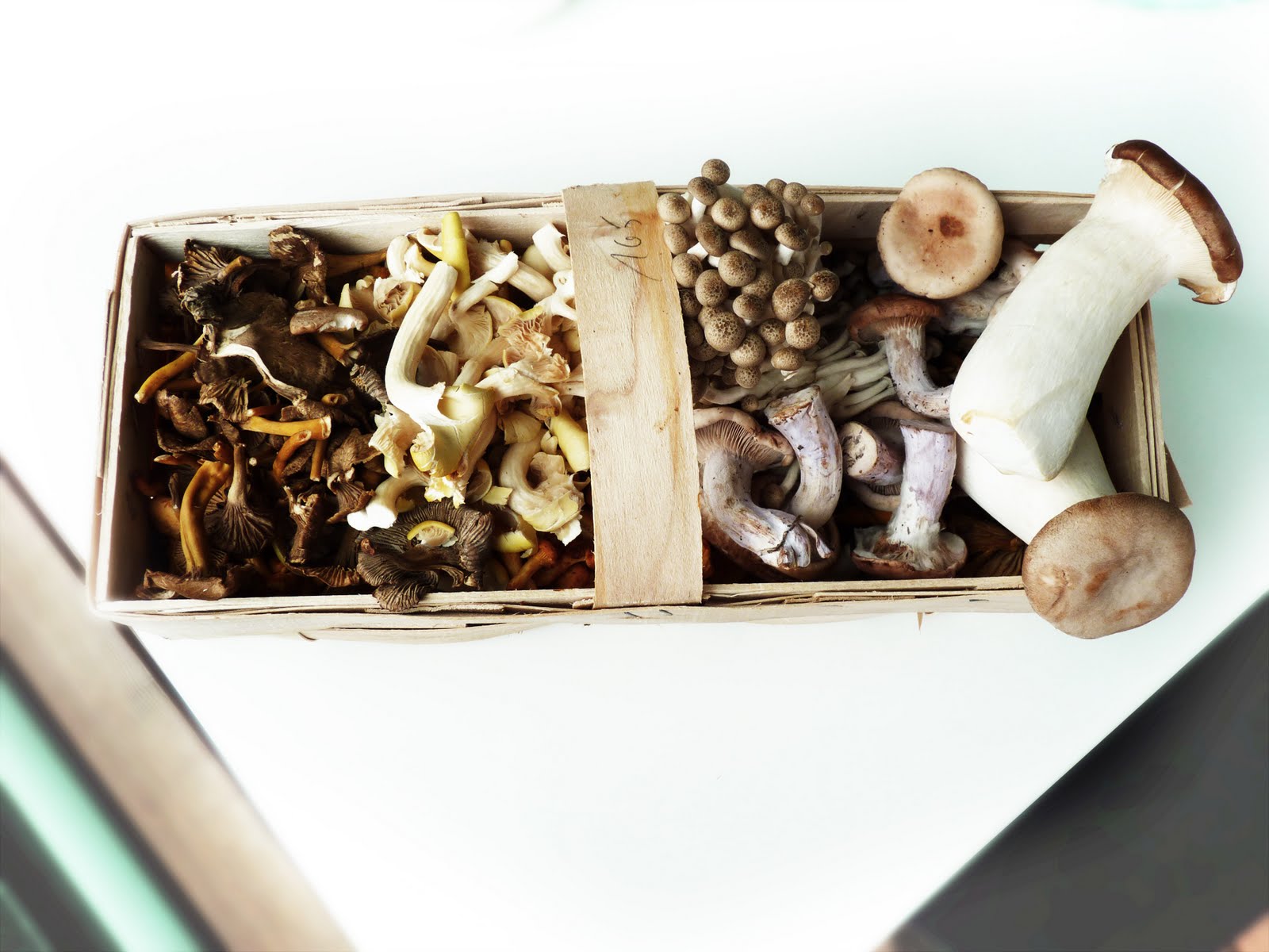 ** re. mushrooms: i'm not entirely sure which mushrooms i got here... sorry. sure sure there were king oyster mushrooms, a lot of conventional chanterelles, a few pleos, 1 or two porcini, a handful of black chanterelles, a variety with a beautiful purple stem and a white and brown, slim, stacked one i've never seen before.