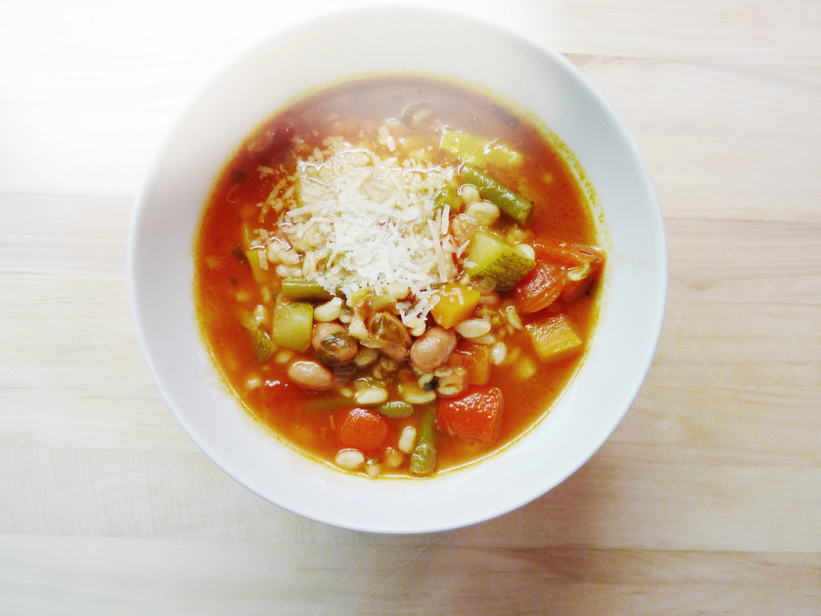 in a large saucepan heat olive oil and put in onion, garlic, peperoncino, carrot, celery and leek and sweat for a few minutes. add the water, bouillon and the other vegetables: green beans, borlottis, peppers, zucchino, as well as the tinned tomatoes and the precooked ebly. cover with the lid and let cook for 15 minutes. then season with salt and pepper, and add the herbs (i add them earlier only in soup, because i love how they infuse the broth). cover again, reduce the heat and simmer for another 15 minutes or so.