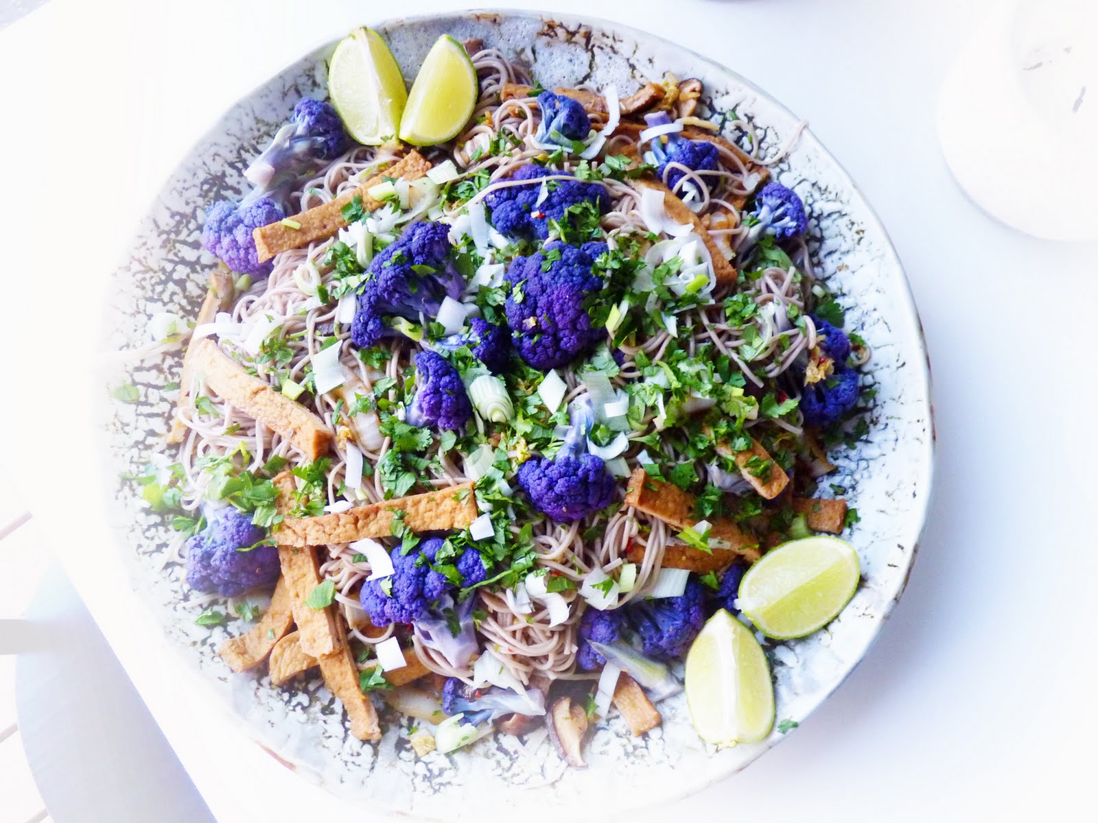 one night, with my two lovely colleagues for dinner, i experimented with a colorful cauliflower and some staple soba noodles. result is super yummy! you could also try it with conventional cauliflower, or broccoli, even.