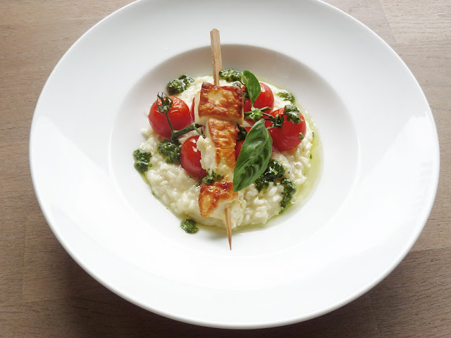 lemon grass risotto with roasted vine tomatoes, grilled haloumi skewers & basil oil